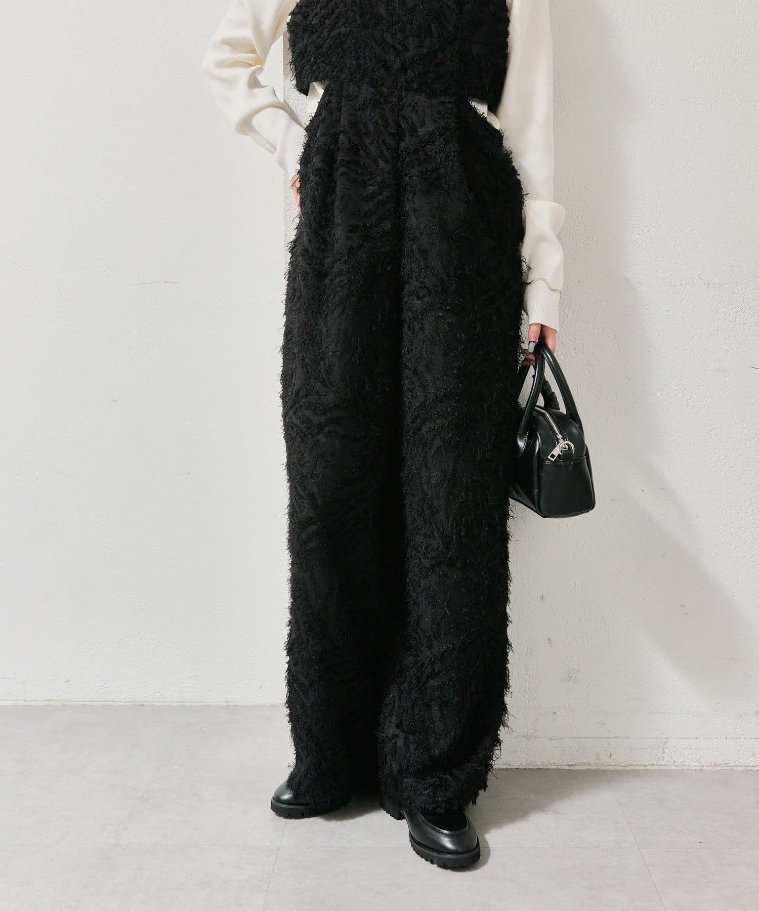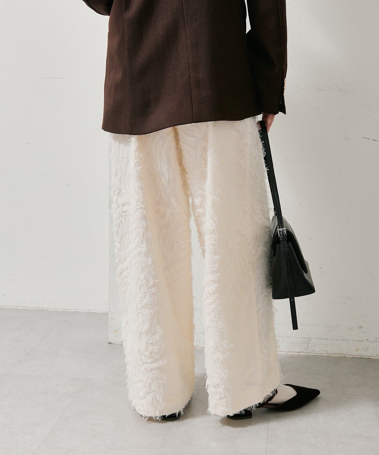 ・ウエスト部分に入っているタックとストレートなパンツシルエットがモード感を演出。