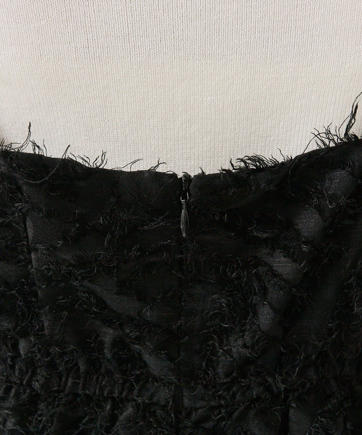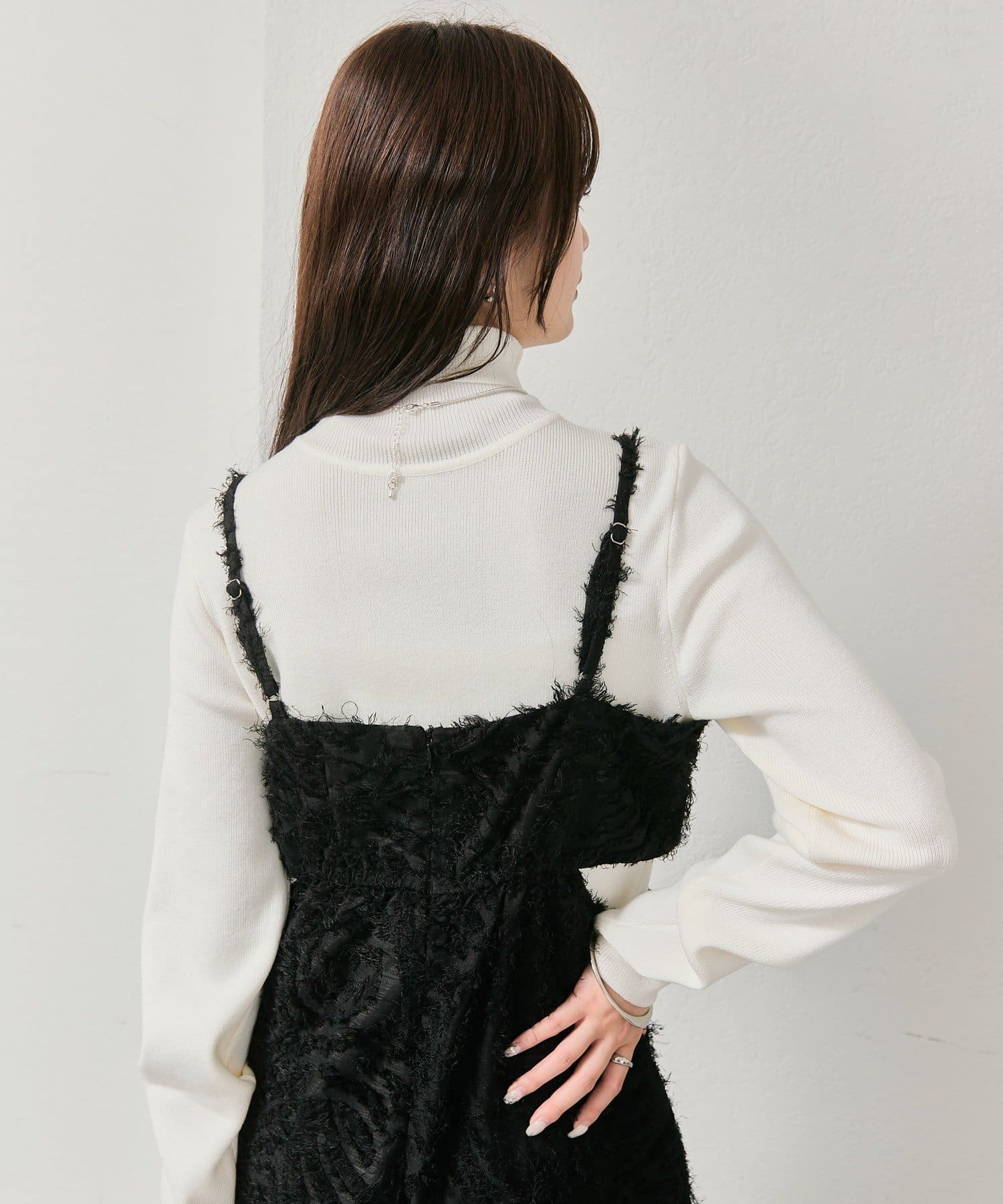 ・バックジップ仕様で着脱もしやすく、裏地付きで安心感のある着心地。肩紐はアジャスター付きでお好みの丈感で着ていただけます。
