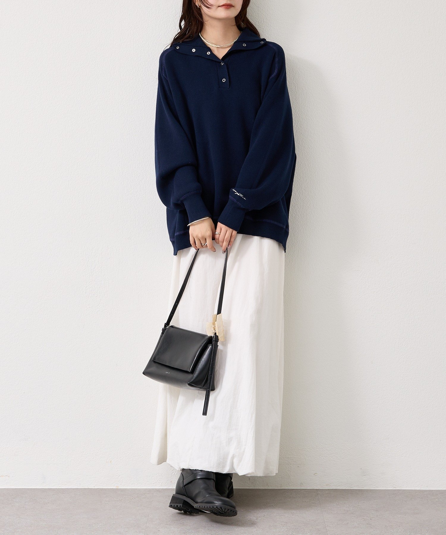 ・ヘンリーネックのボタンデザインが程よいアクセントになり、コーディネートにこなれ感をプラス。