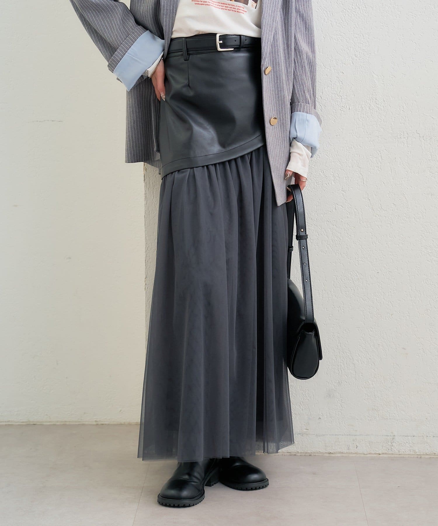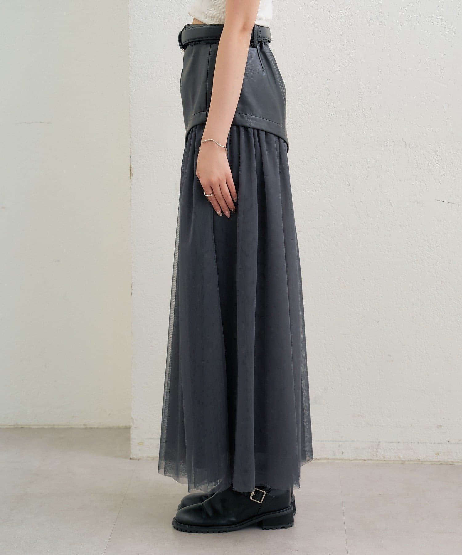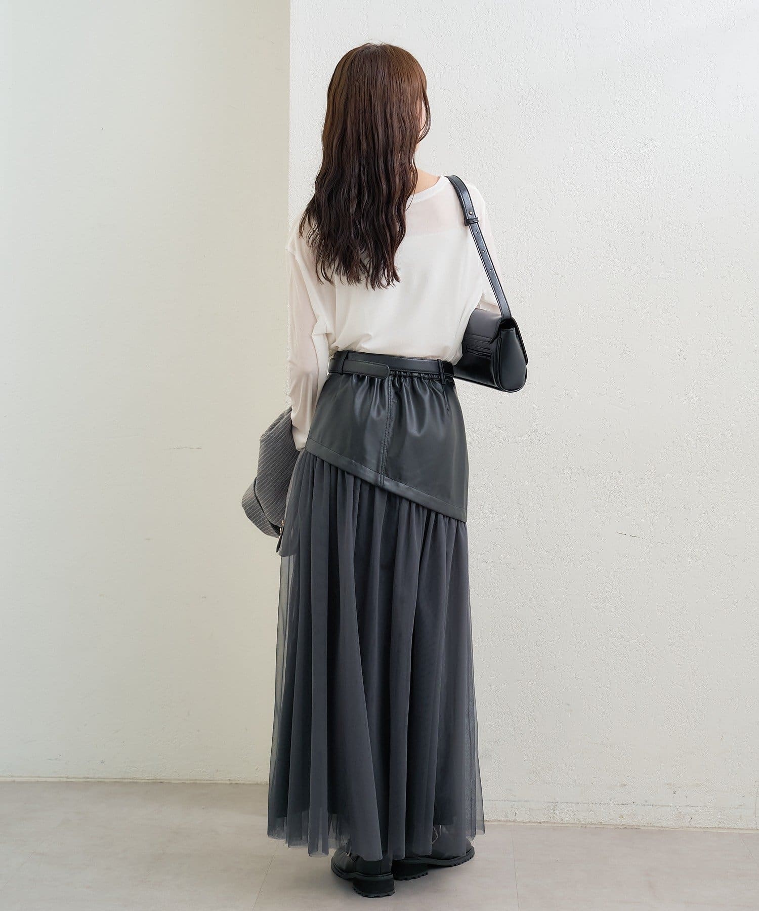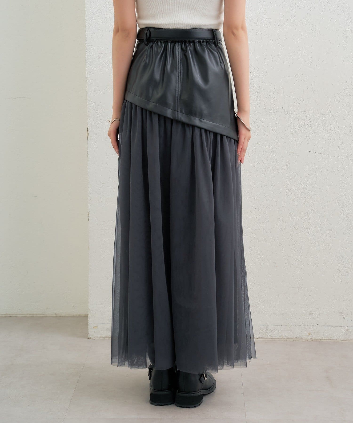 ・フェイクレザーと繊細なチュールを合わせたドッキングデザイン。