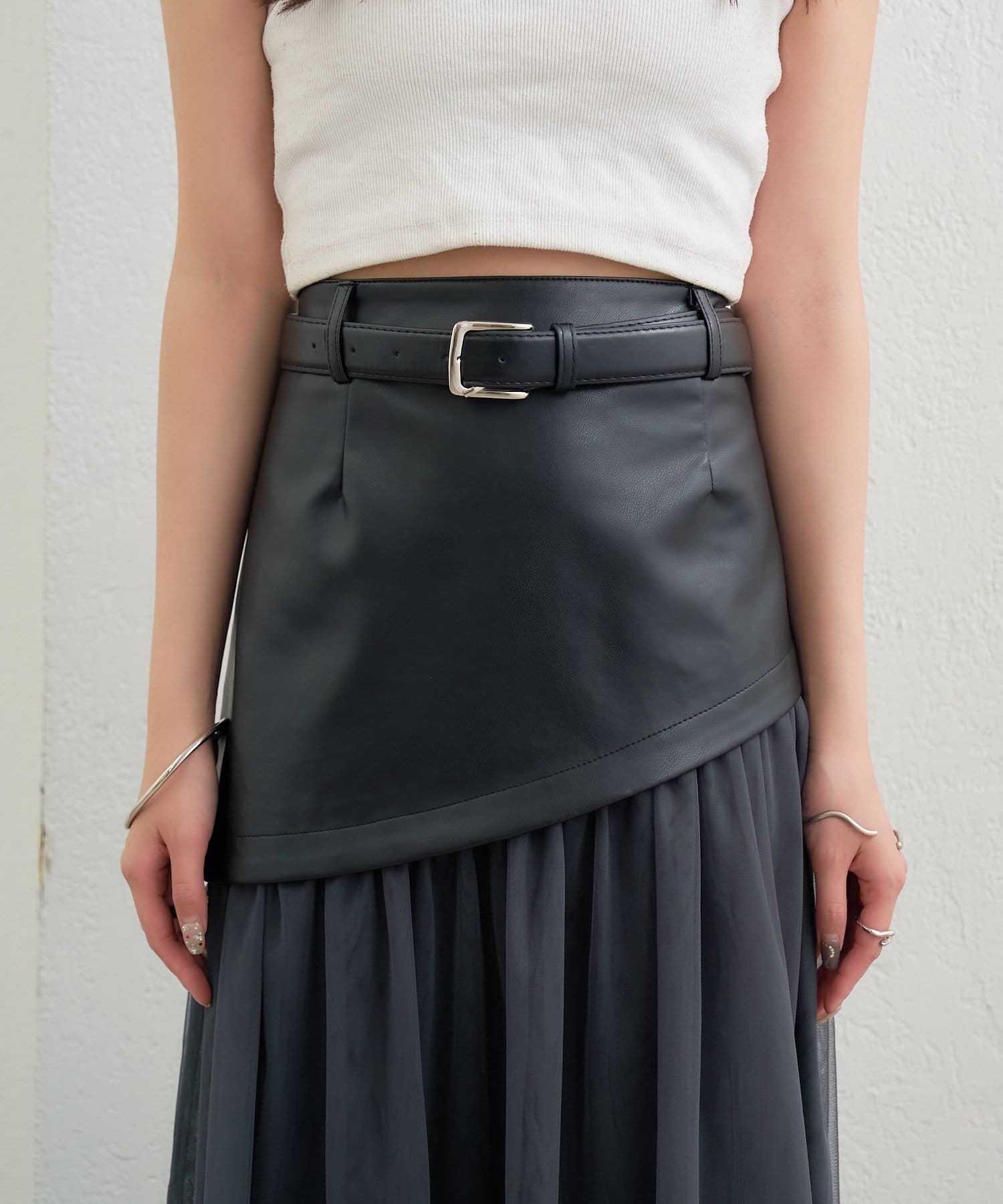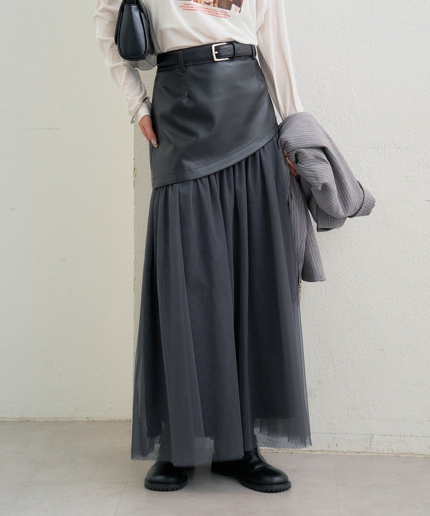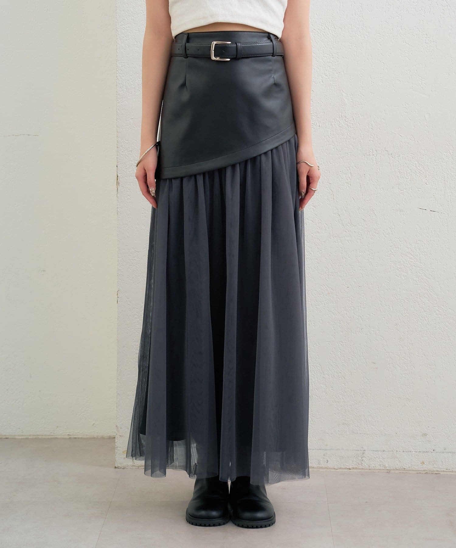 ・フェイクレザーと繊細なチュールを合わせたドッキングデザイン。