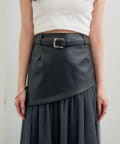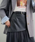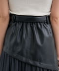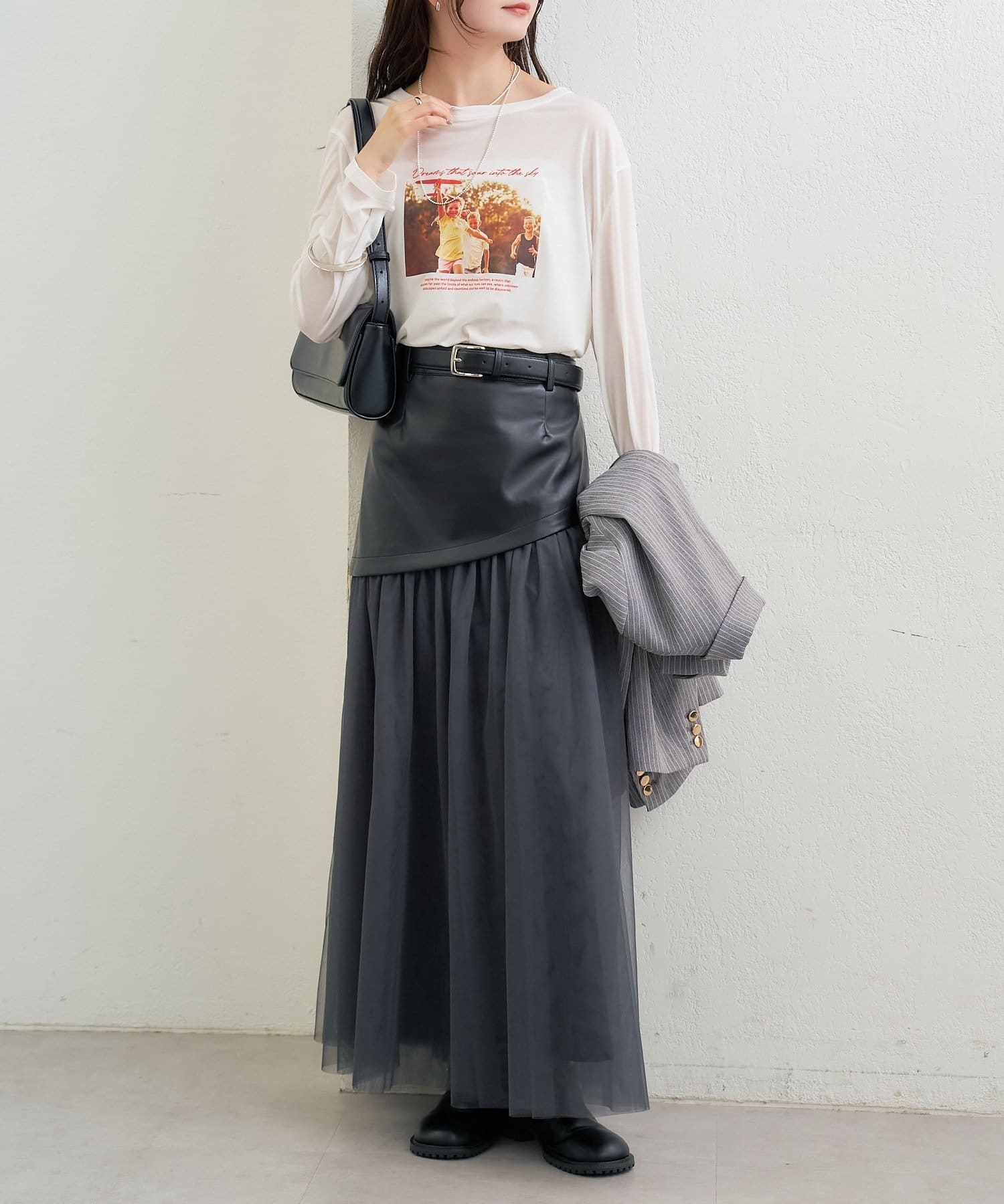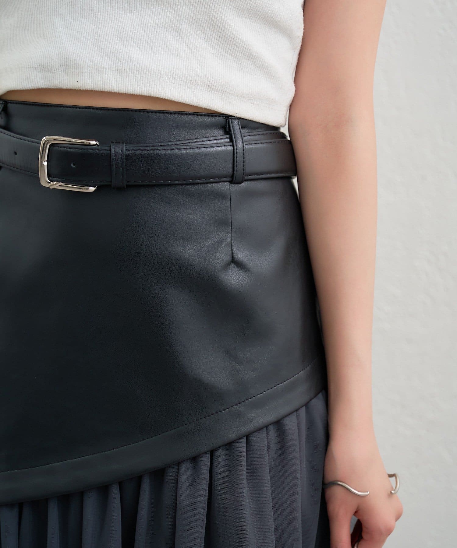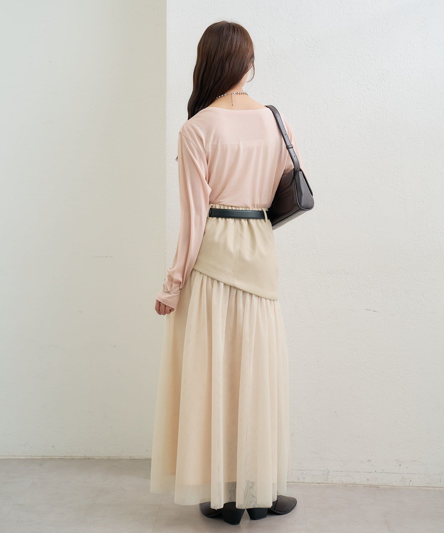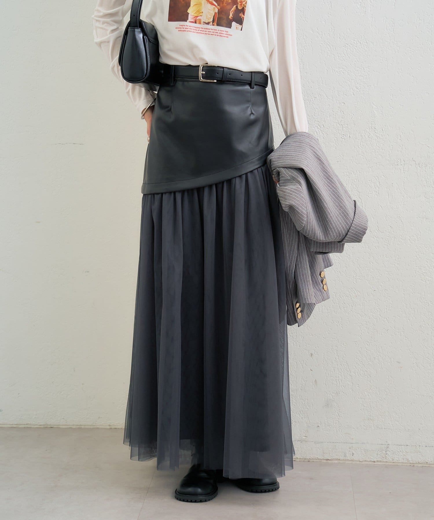 ・フェイクレザーと繊細なチュールを合わせたドッキングデザイン。