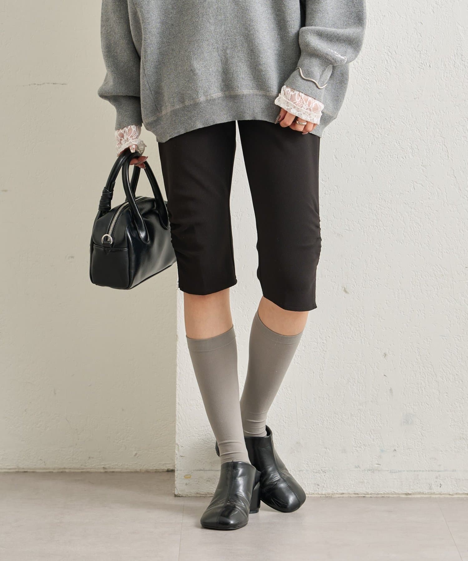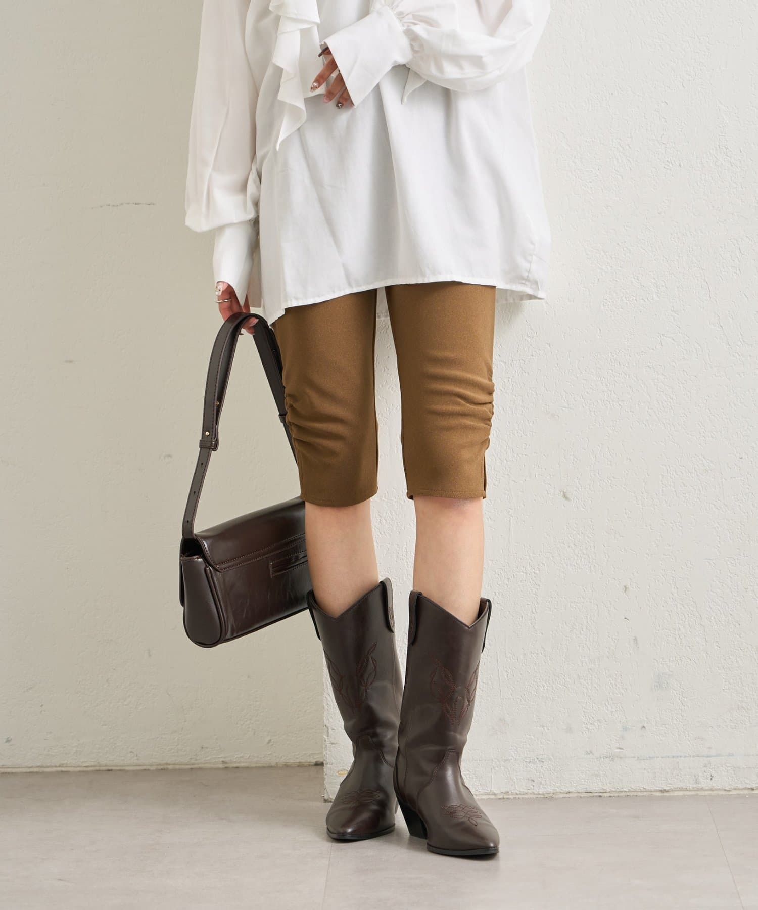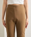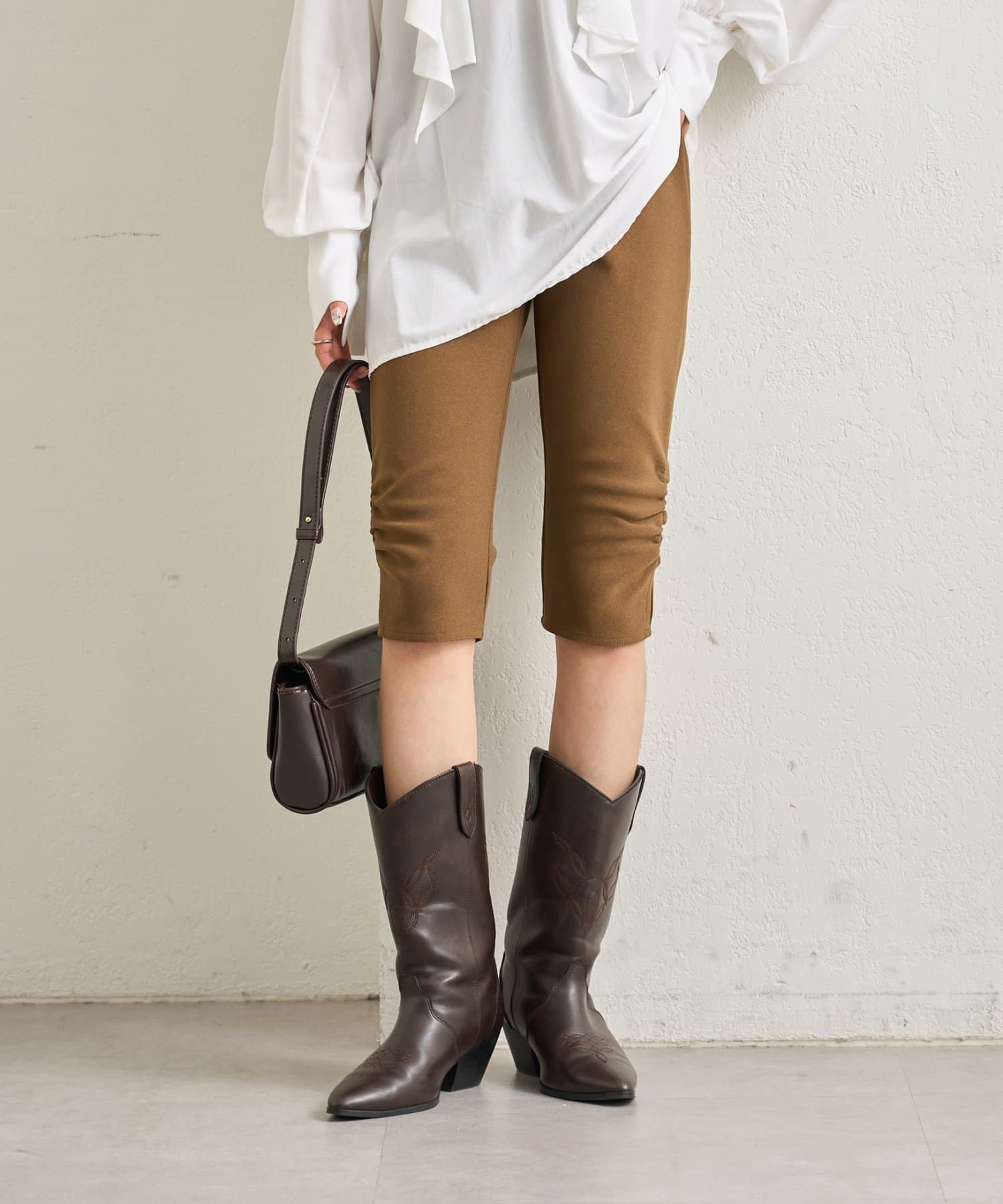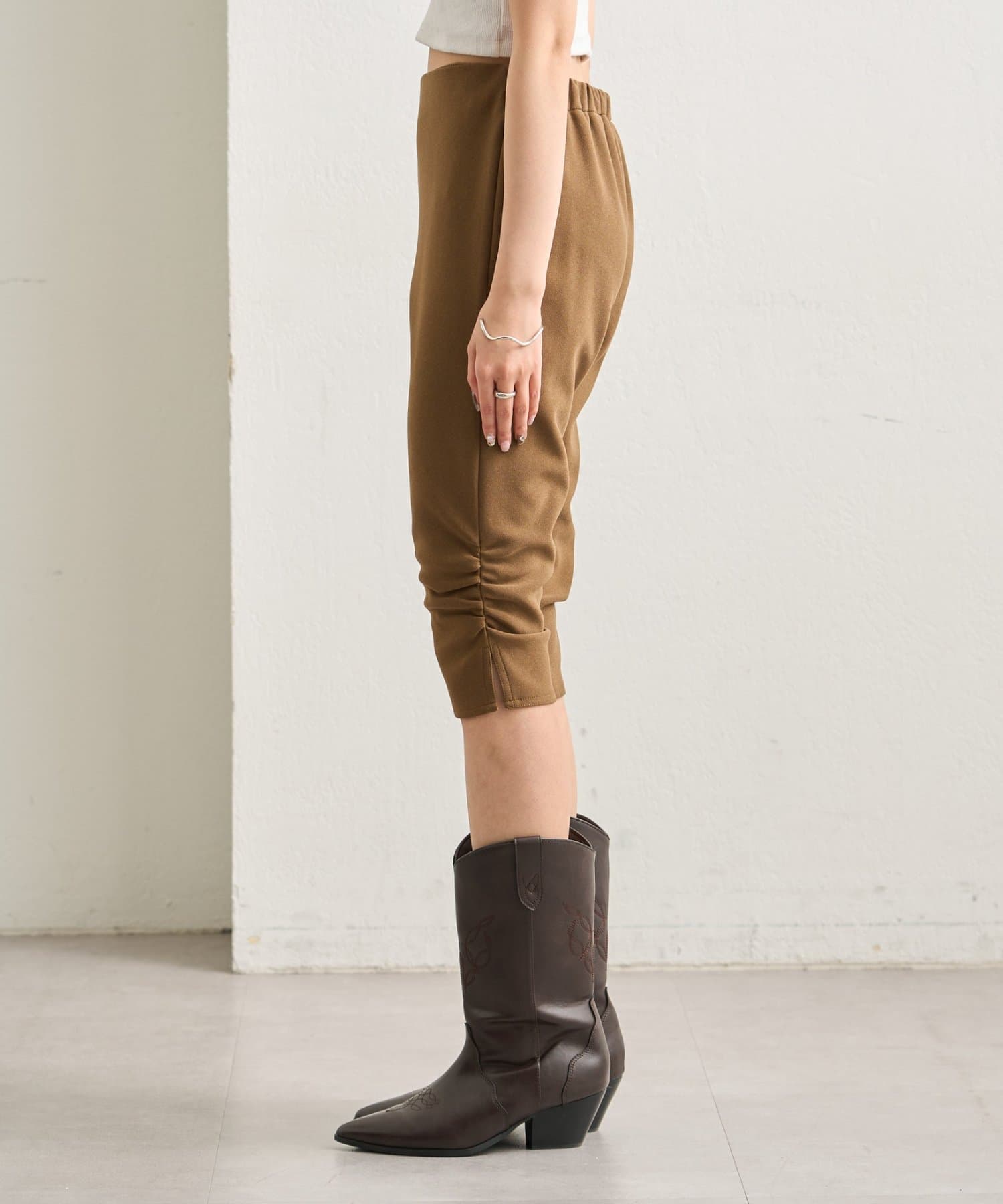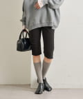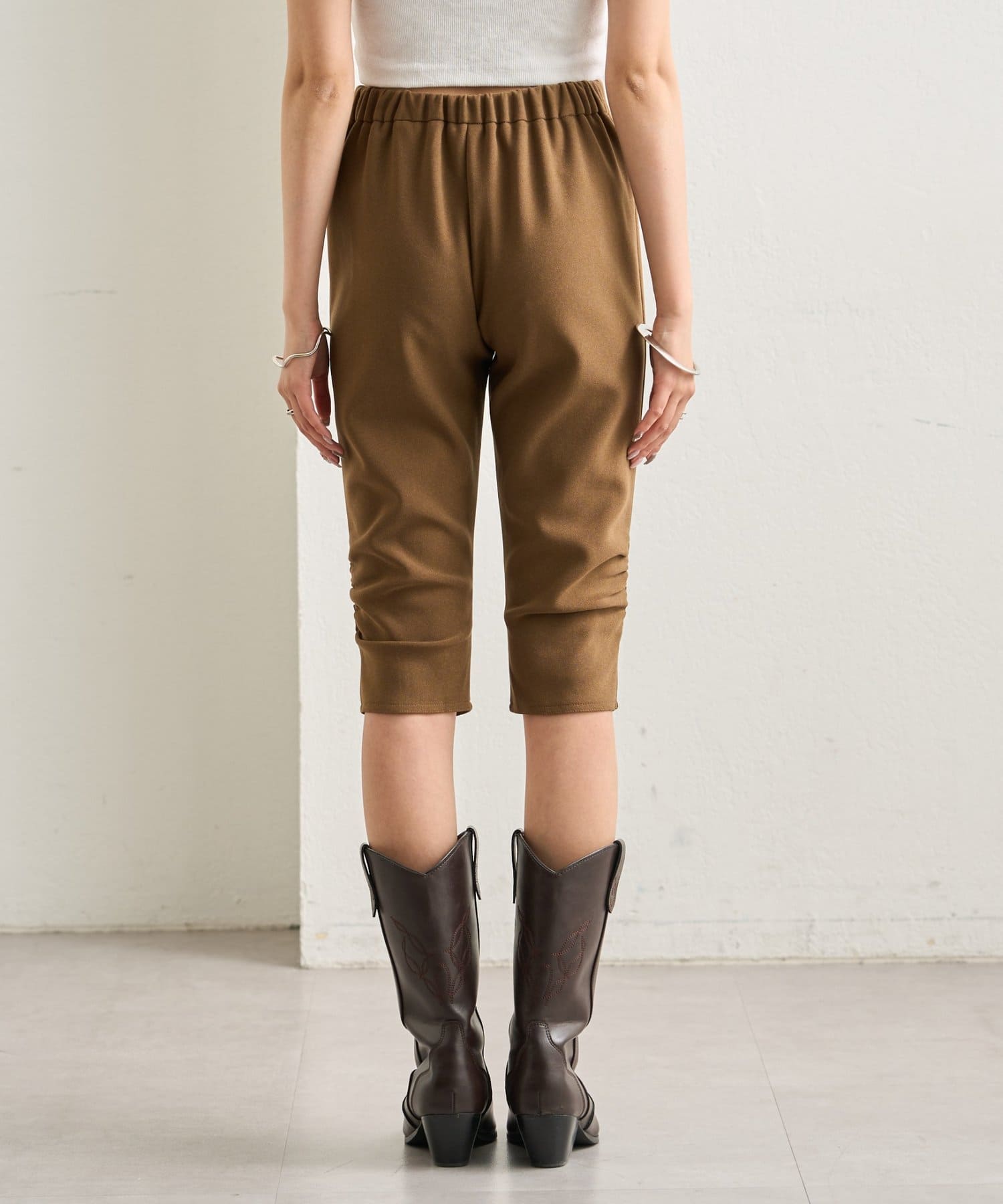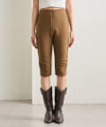 ・くしゅっと裾に施されたギャザーのシルエットでスタイルアップが叶うバイカーパンツ。