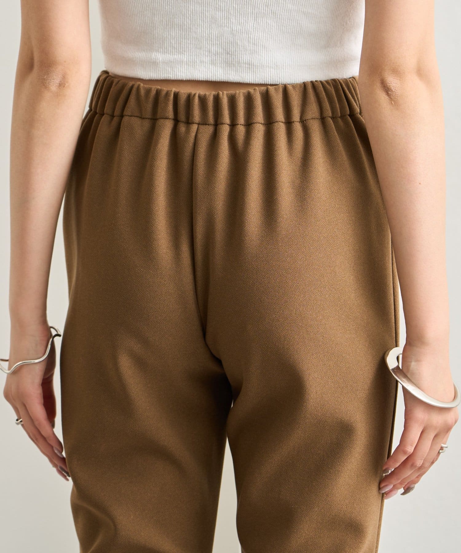 ・ウエスト後ろがゴム仕様なので、履き心地も抜群。シンプルでありながらも存在感を放つ1枚です。