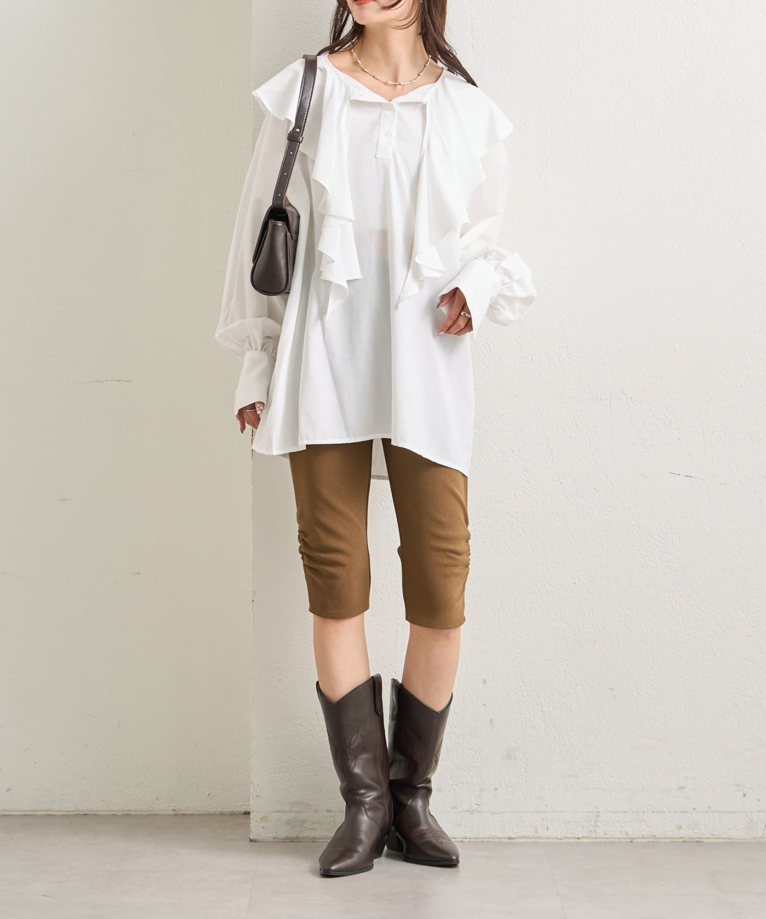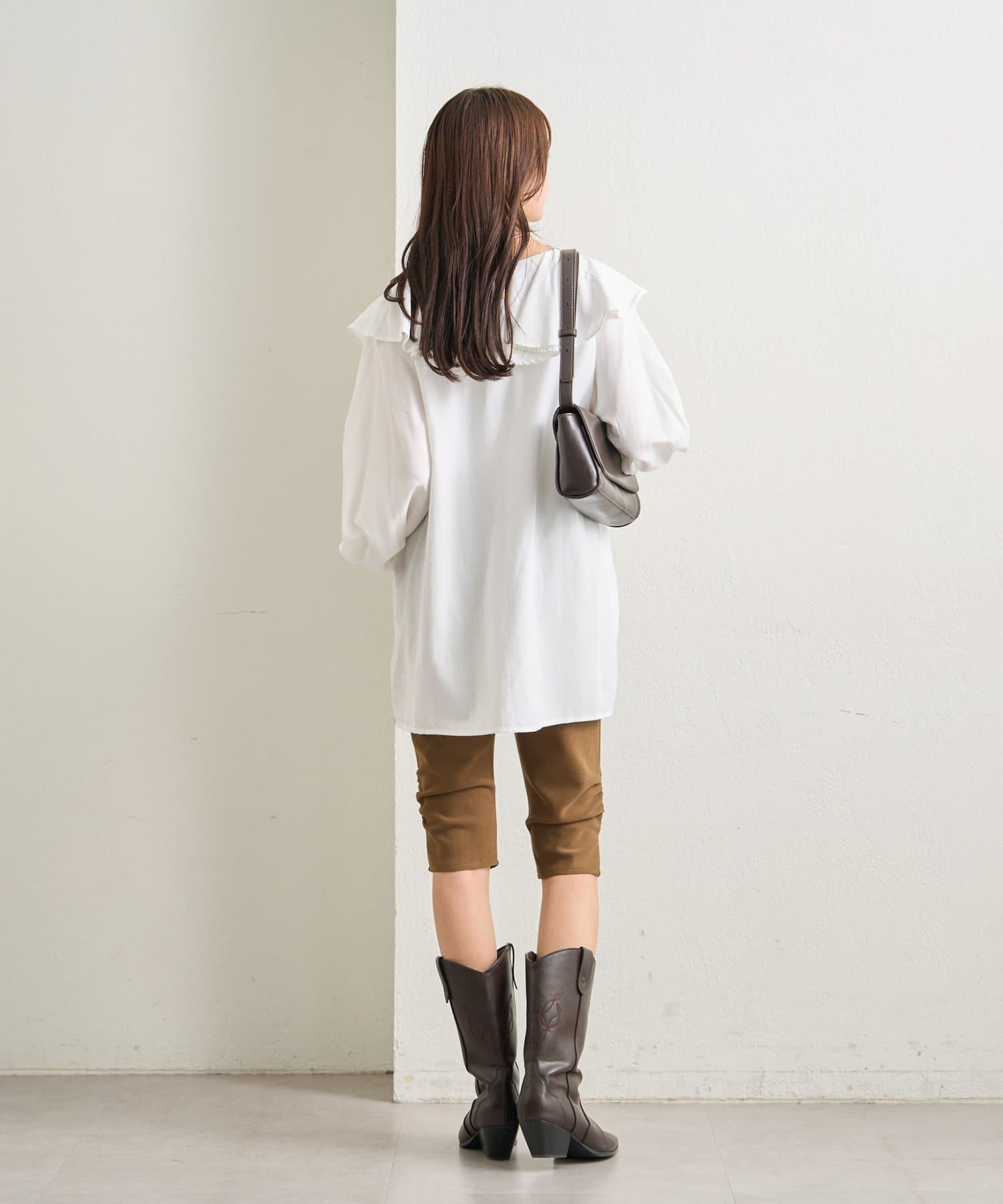 ・ロング丈のトップスと足元はブーツを合わせたスタイリングがトレンド感がありおすすめです◎