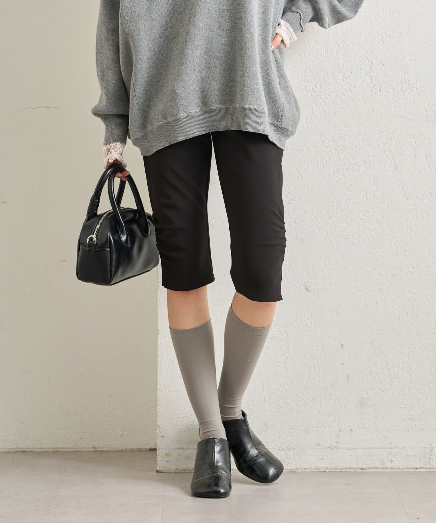 ・くしゅっと裾に施されたギャザーのシルエットでスタイルアップが叶うバイカーパンツ。