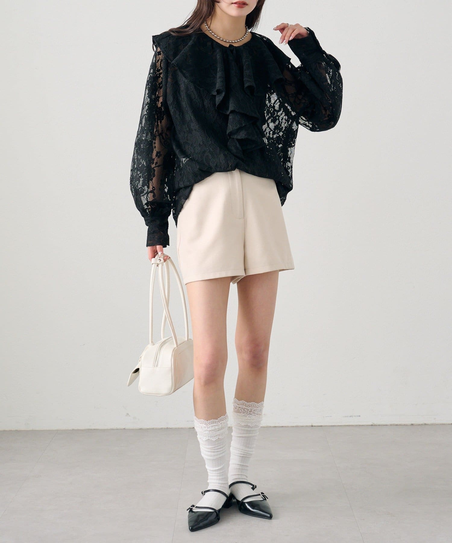 ・シャーリングやフリルなどの甘めトップスと合わせて、バランスの取れた大人フェミニンスタイルに。