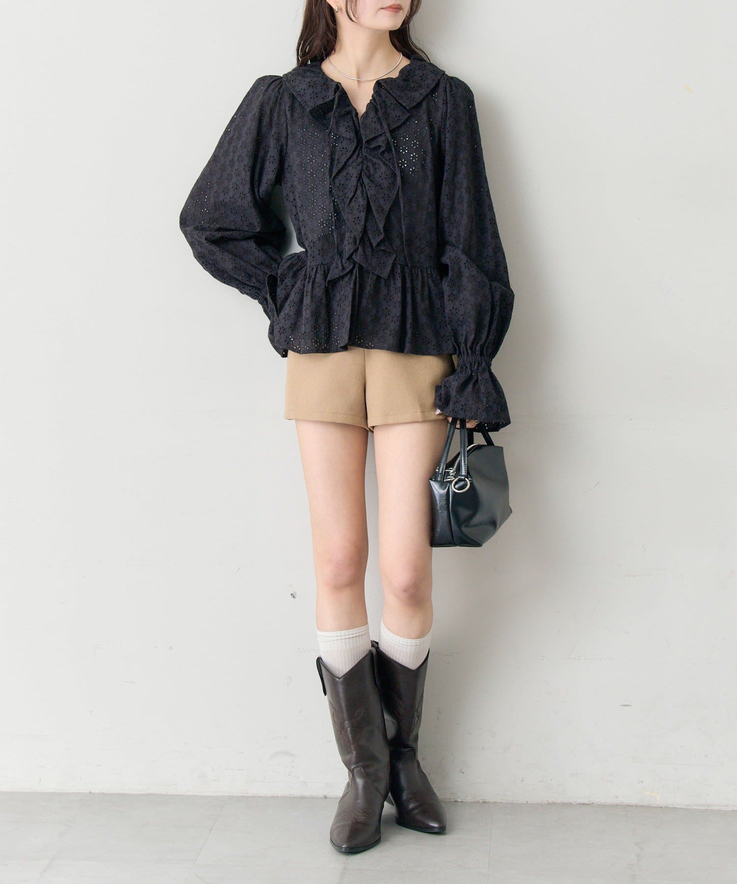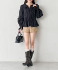 ・シャーリングやフリルなどの甘めトップスと合わせて、バランスの取れた大人フェミニンスタイルに。