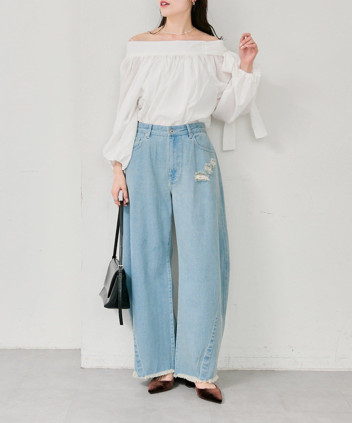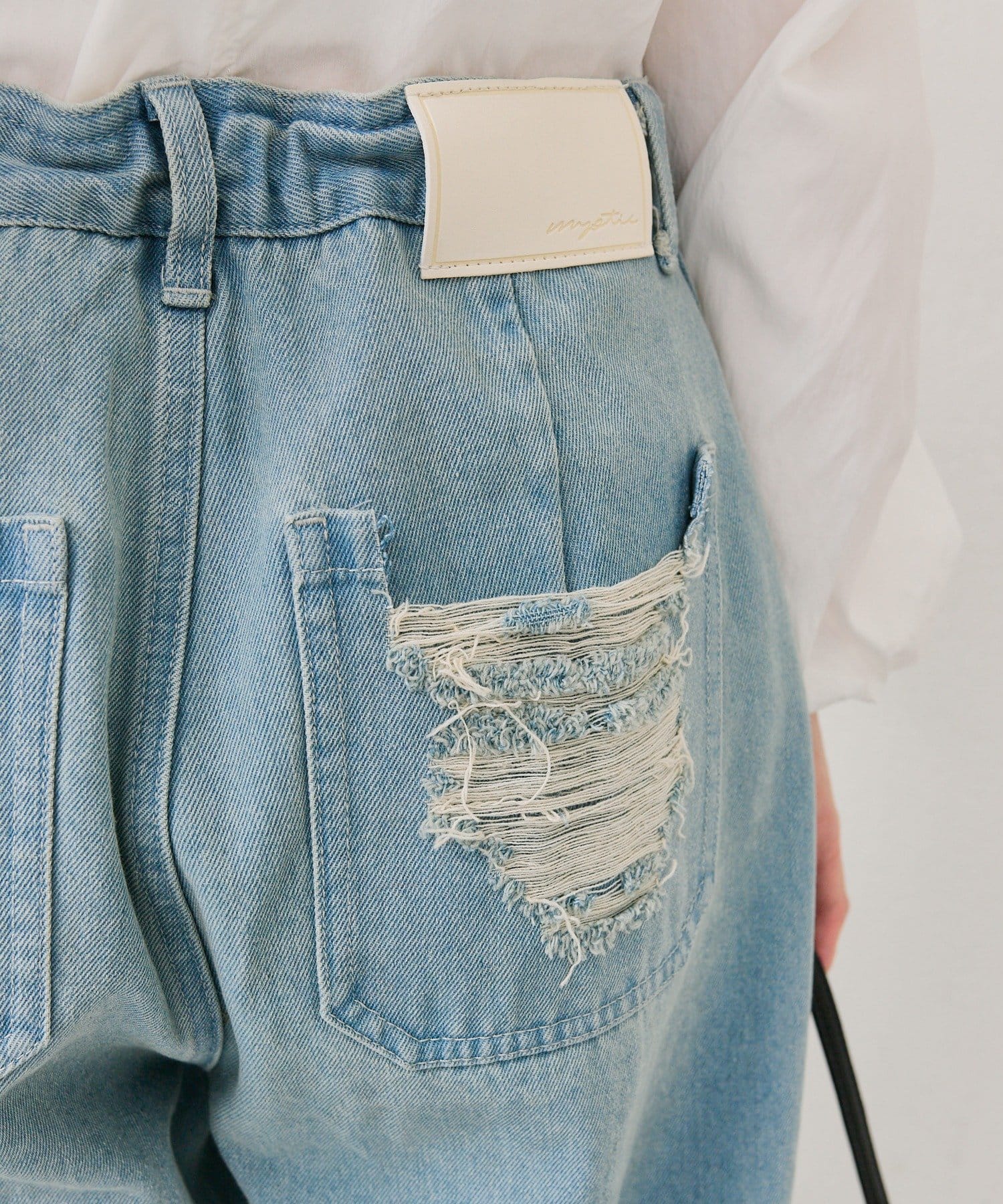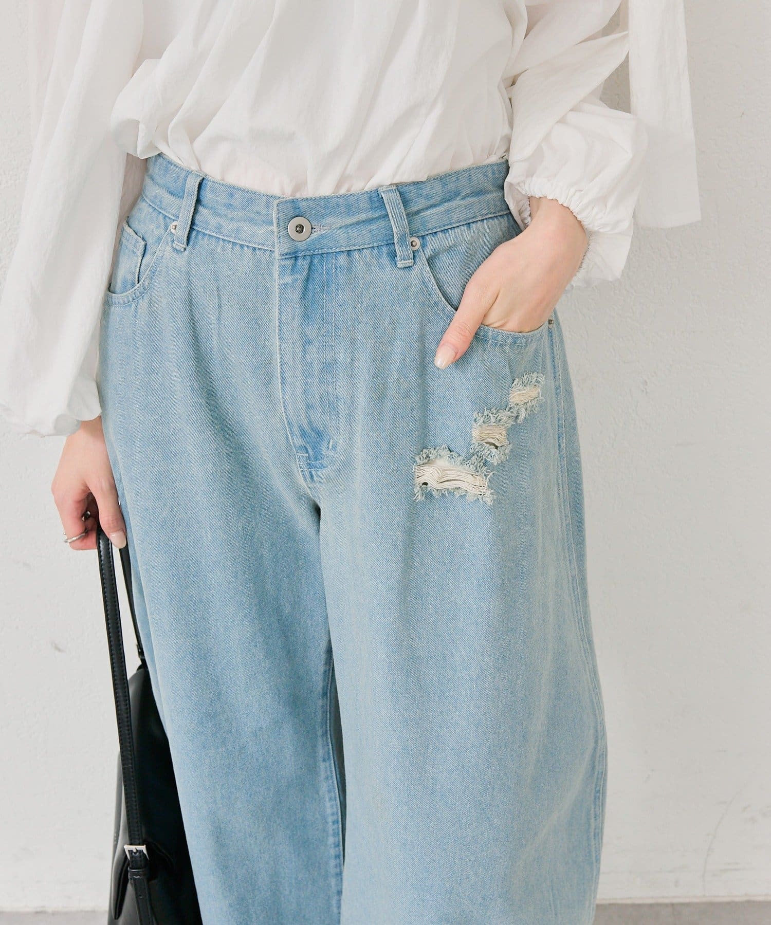 大胆なクラッシュ加工が目を引く、トレンド感あふれるカーブパンツ。