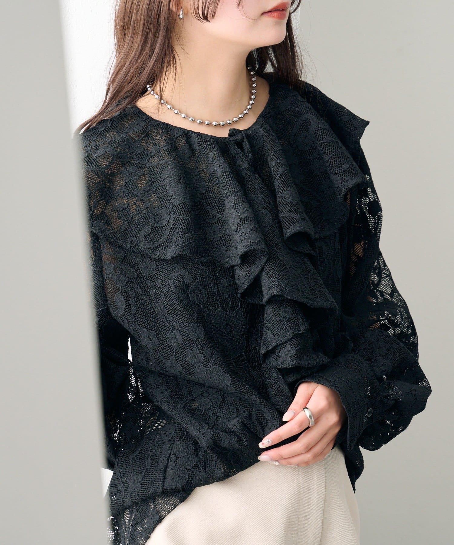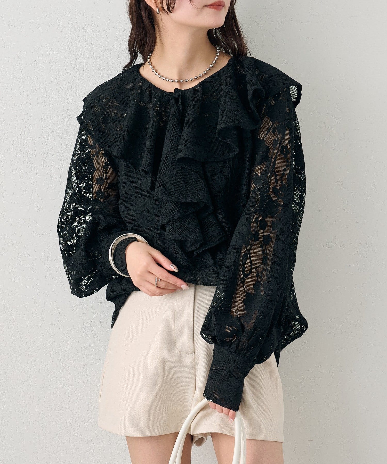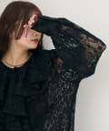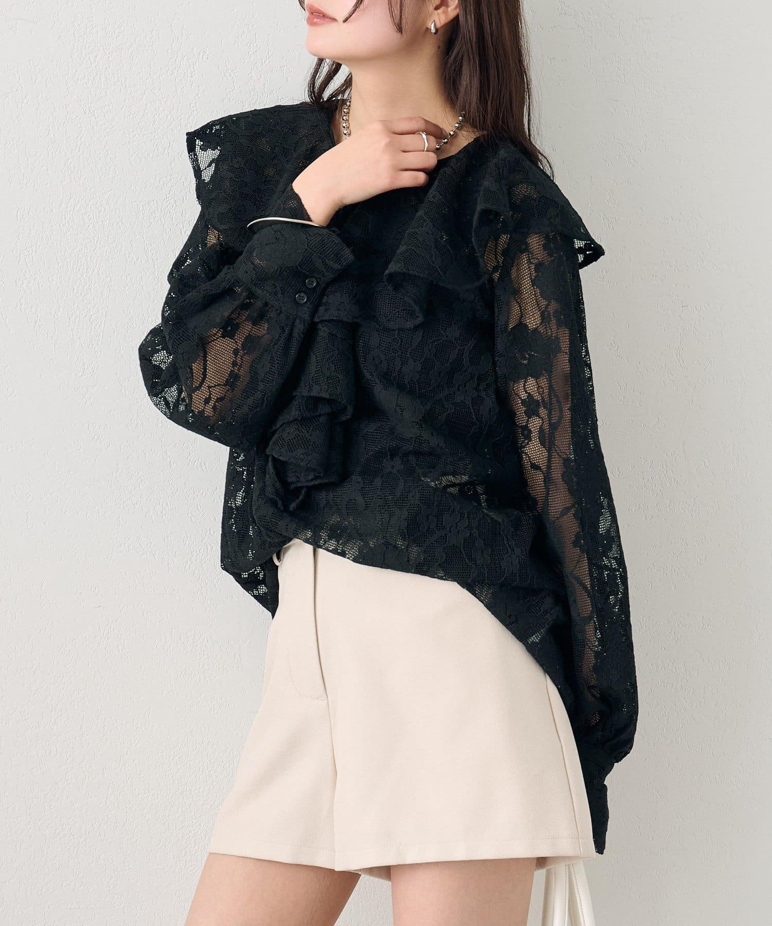 大胆にあしらわれたフリルが、顔周りを明るく見せ、女性らしさを引き立てるブラウス。