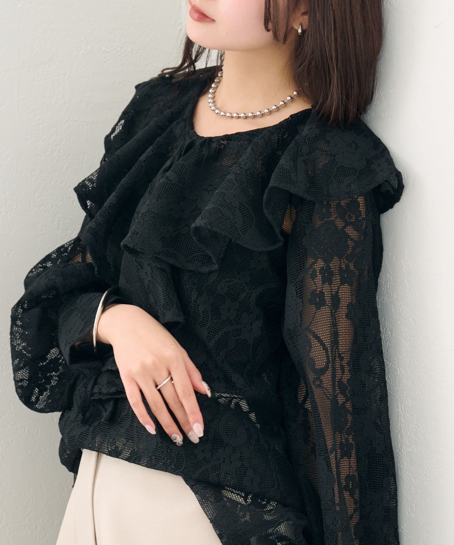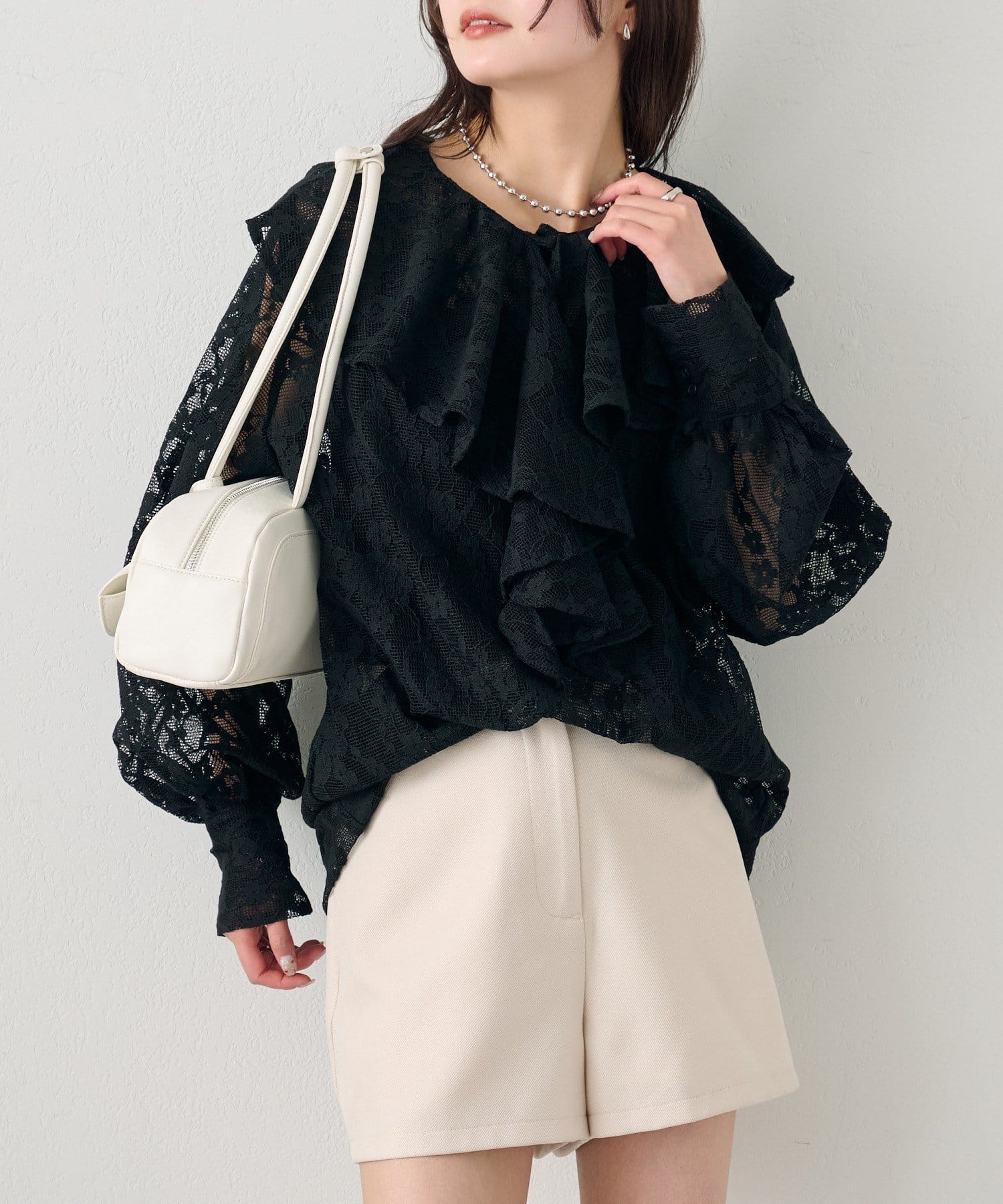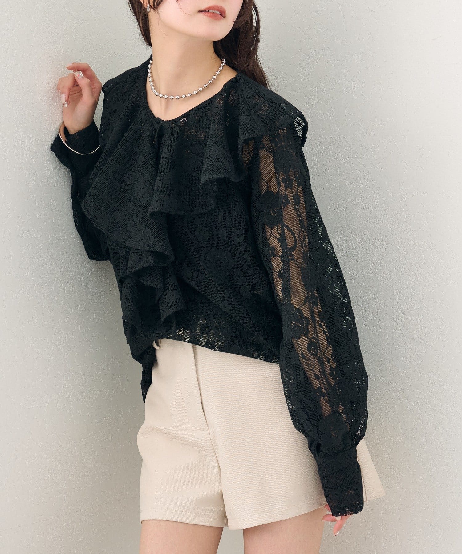 大胆にあしらわれたフリルが、顔周りを明るく見せ、女性らしさを引き立てるブラウス。