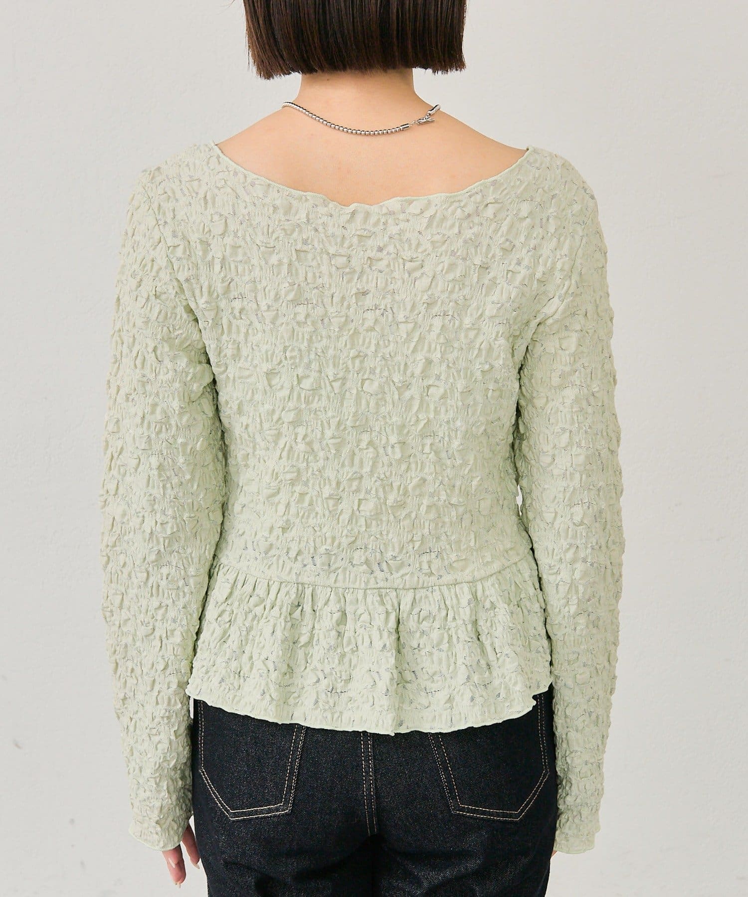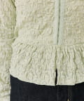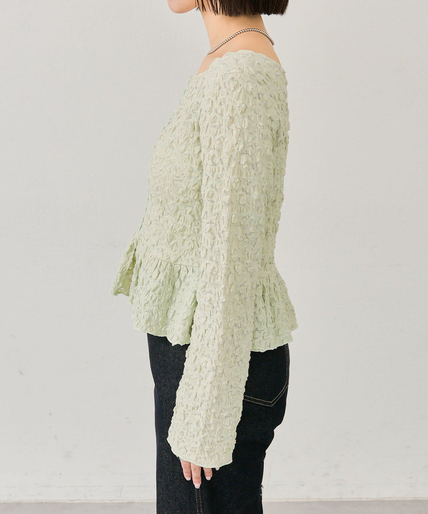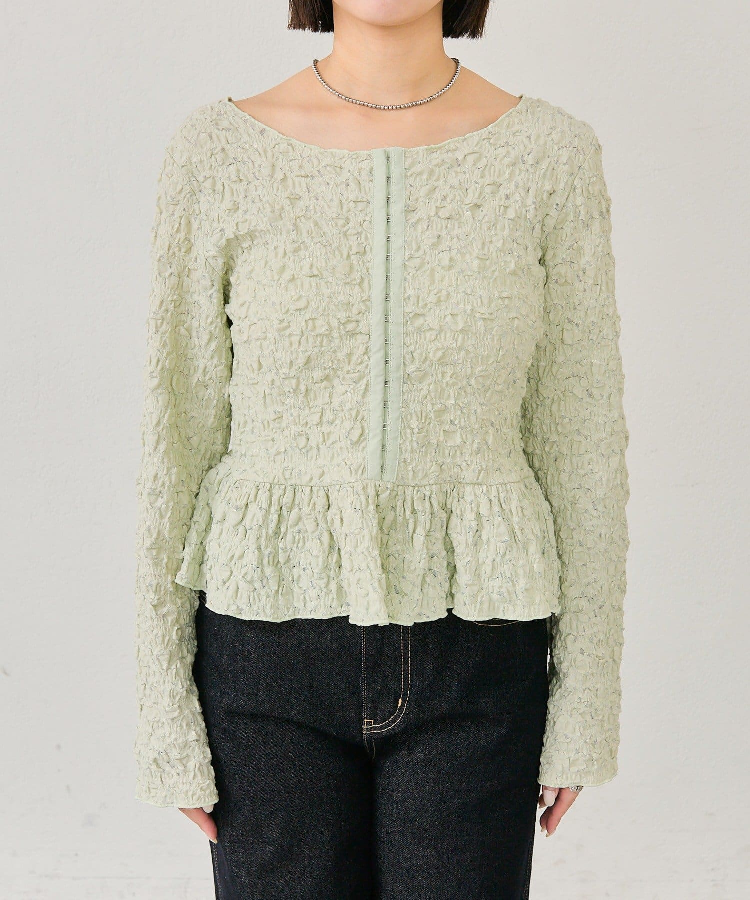 表面感のある生地感とペプラムデザインでスタイリングの主役になるシャーリングトップス