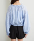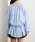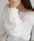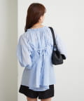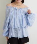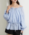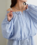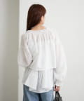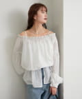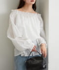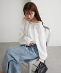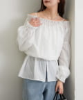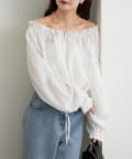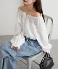 ブラウスは前後両前で着ていただける作りで、襟ぐりがゴム仕様なのでオフショルにして着ていただくことも可能です。
