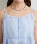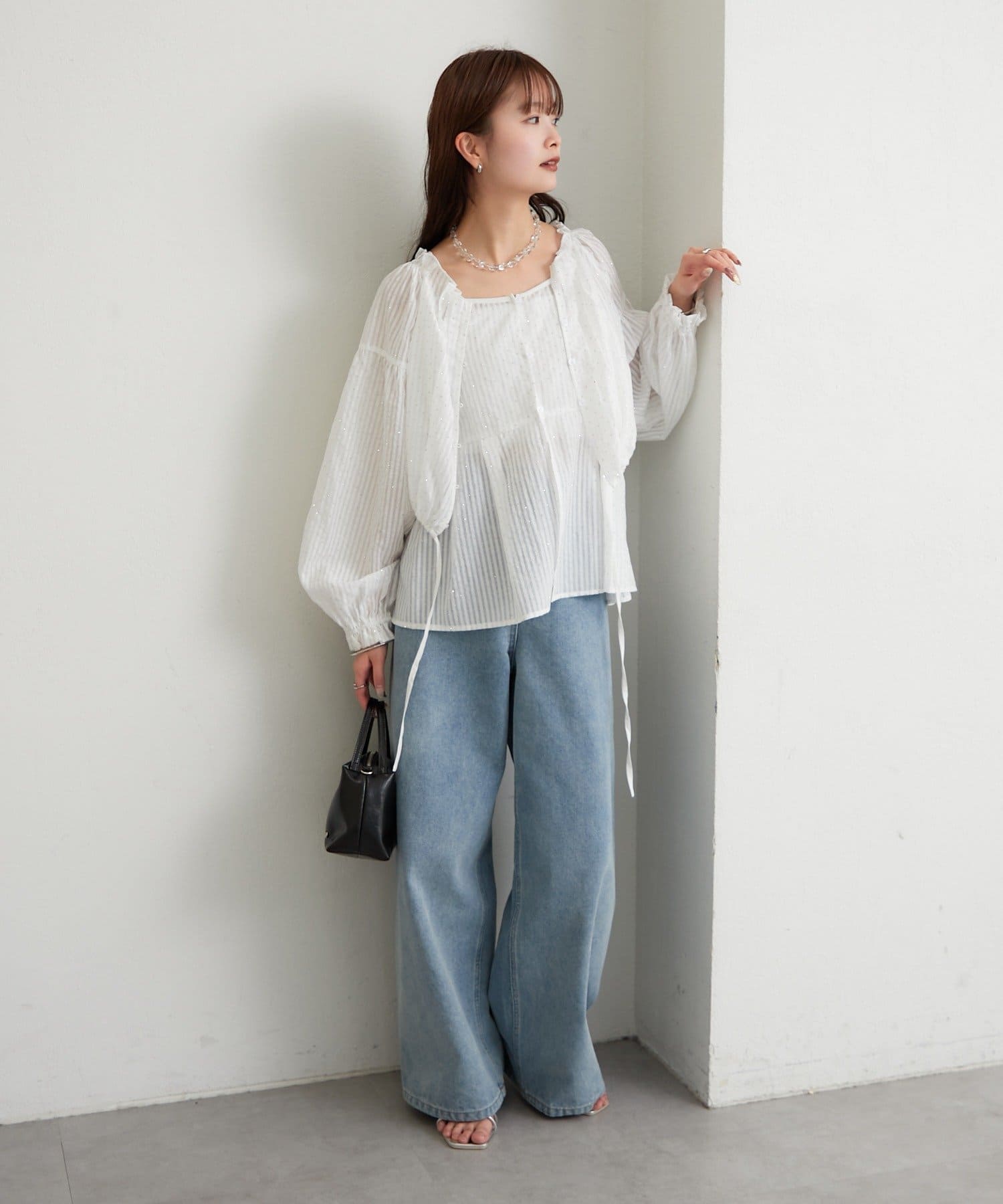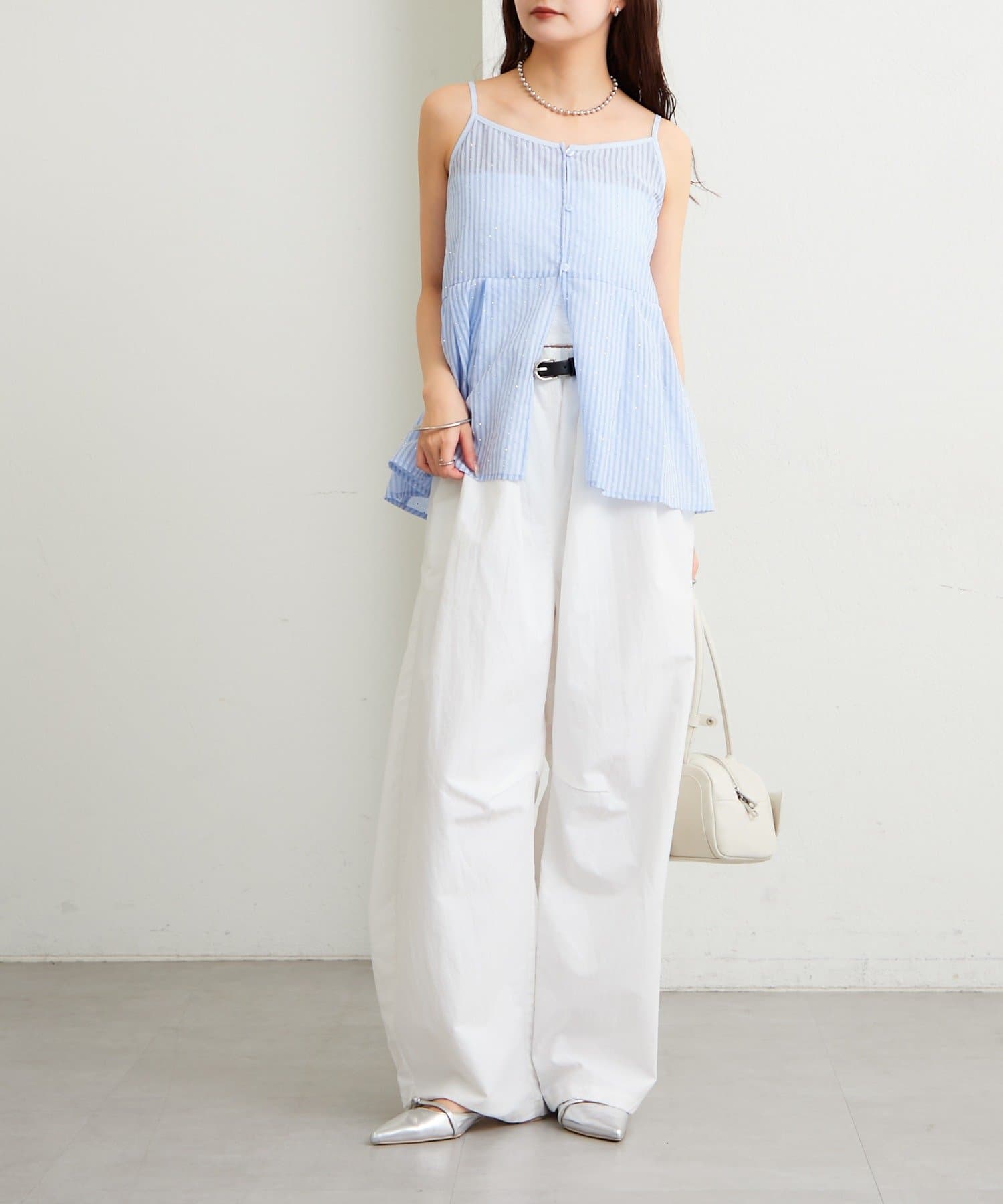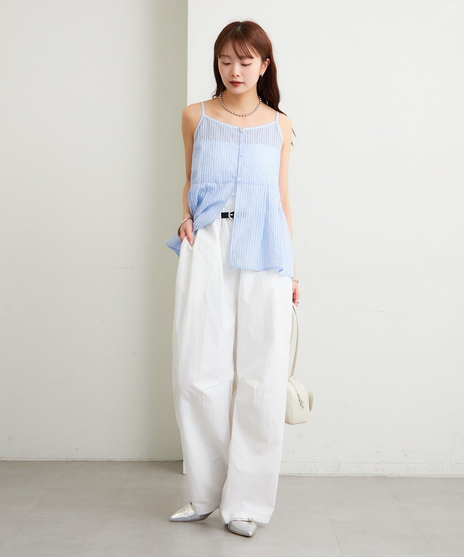 ブラウスはタンクトップやキャミソールの上から羽織って、抜け感のある着こなしに。