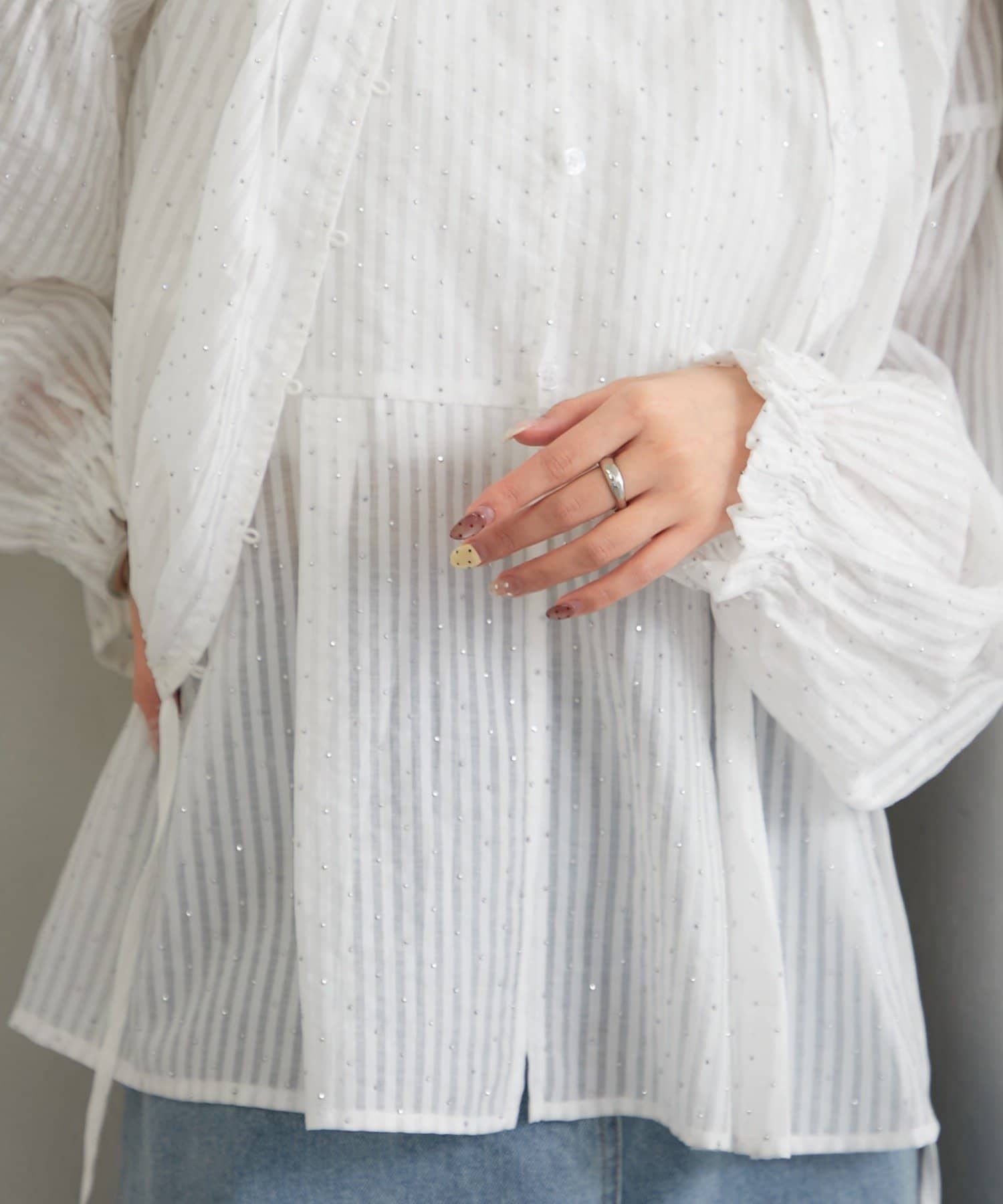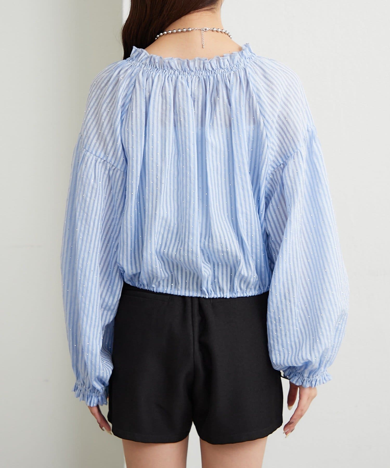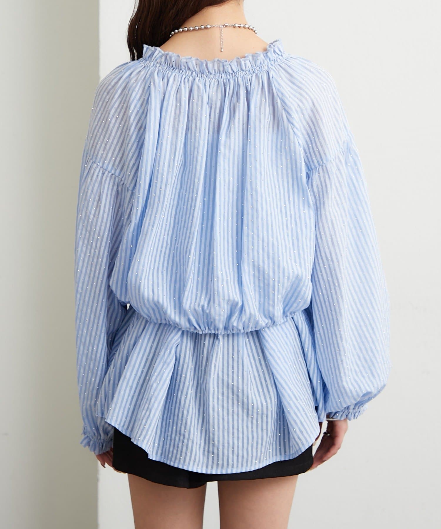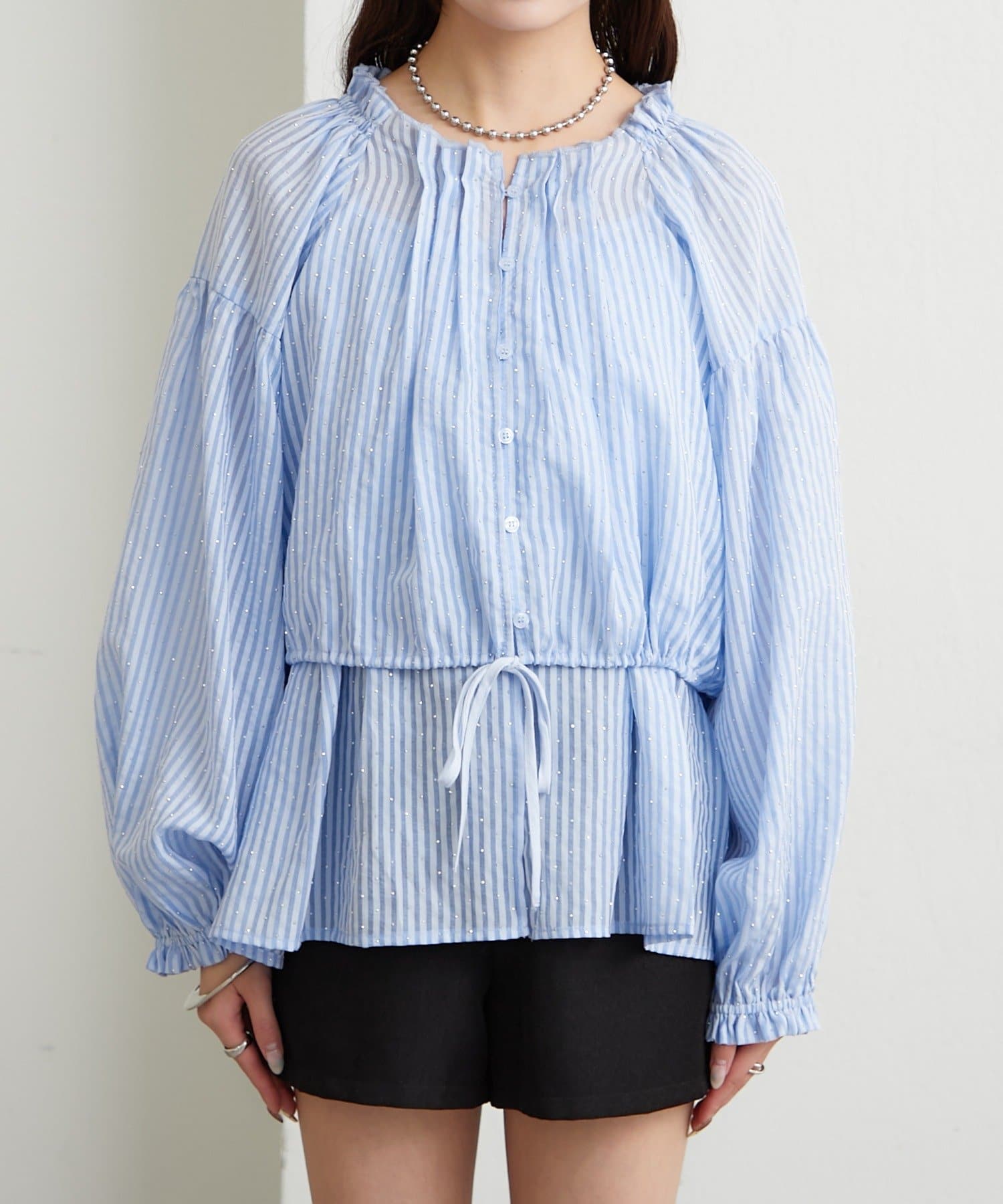 全体にラメストライプを施した、キラキラ光沢のあるシアー素材のトップス。