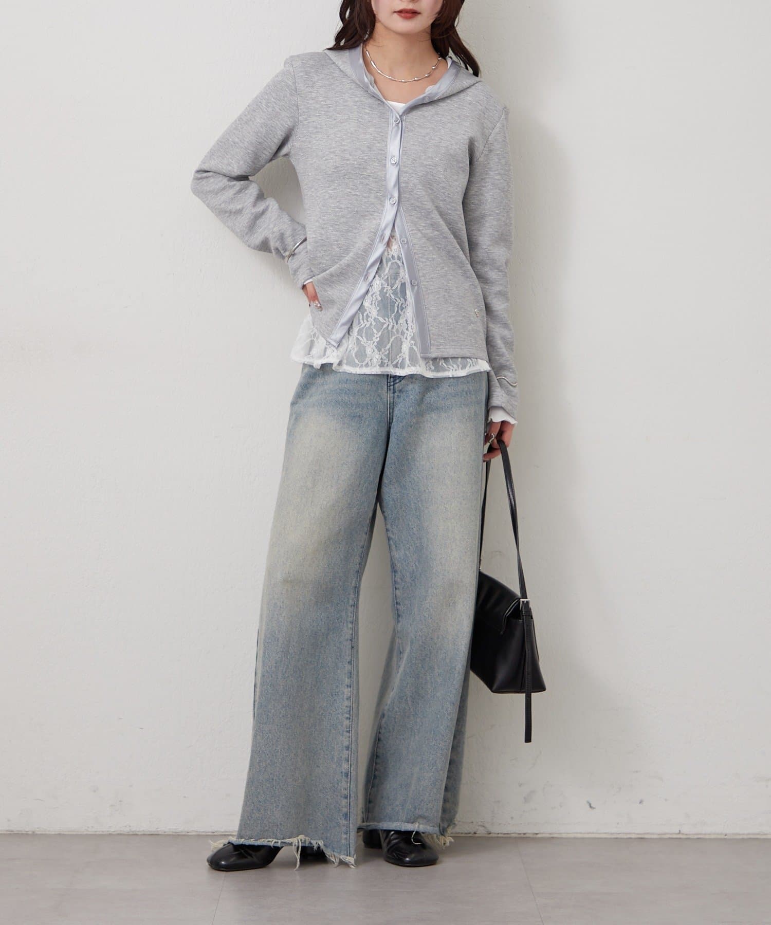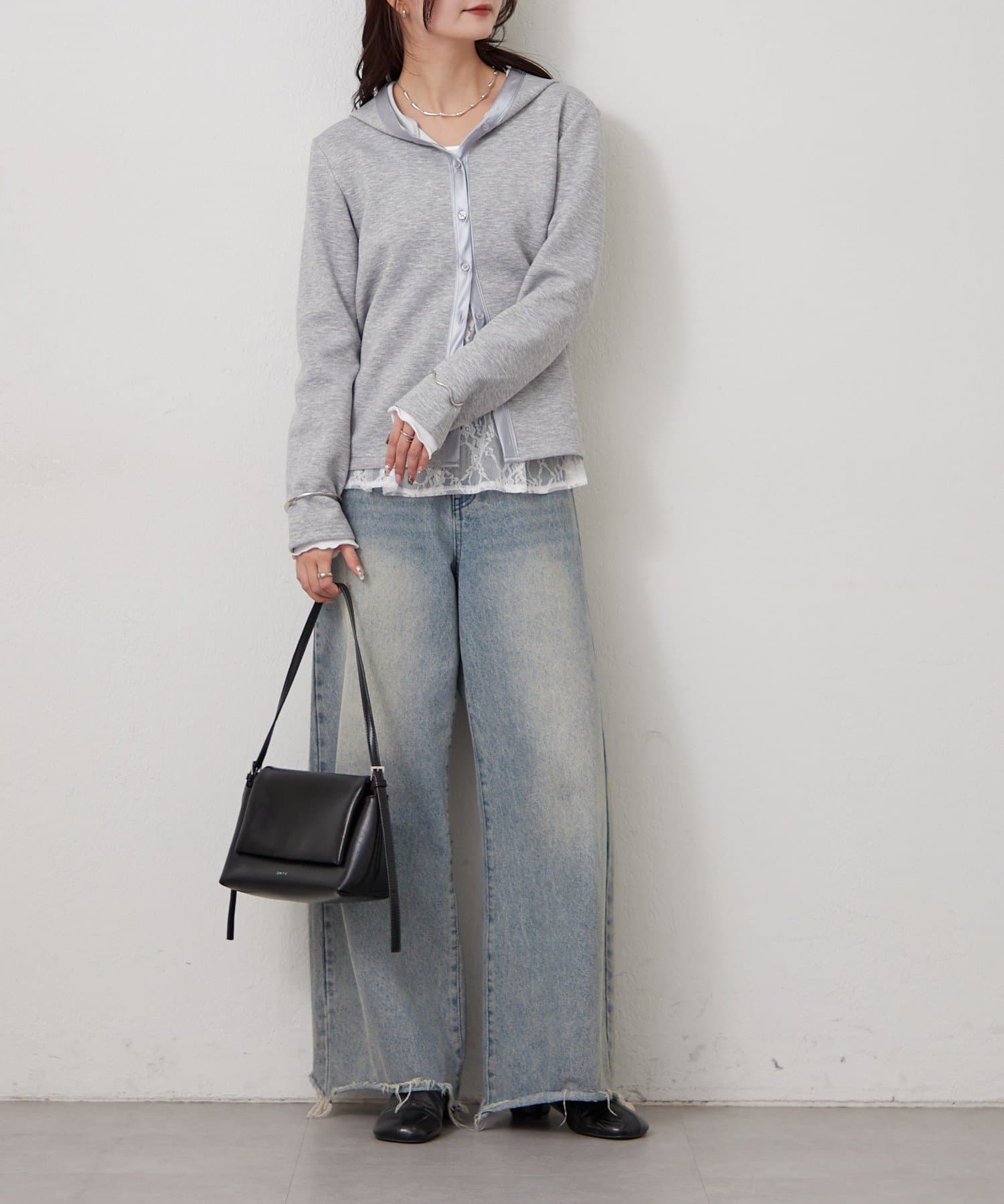 カジュアルなポンチ素材のフーディに、サテン生地の切り替えが上品さをプラスしたフーディー。