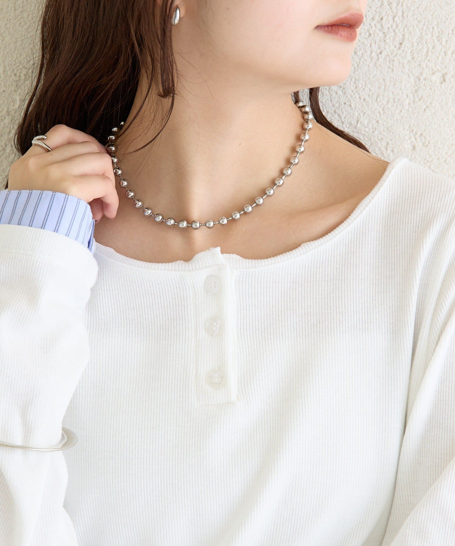 ・首元はヘンリーネックデザインで、ボタンの開け具合で抜け感を調整できます。