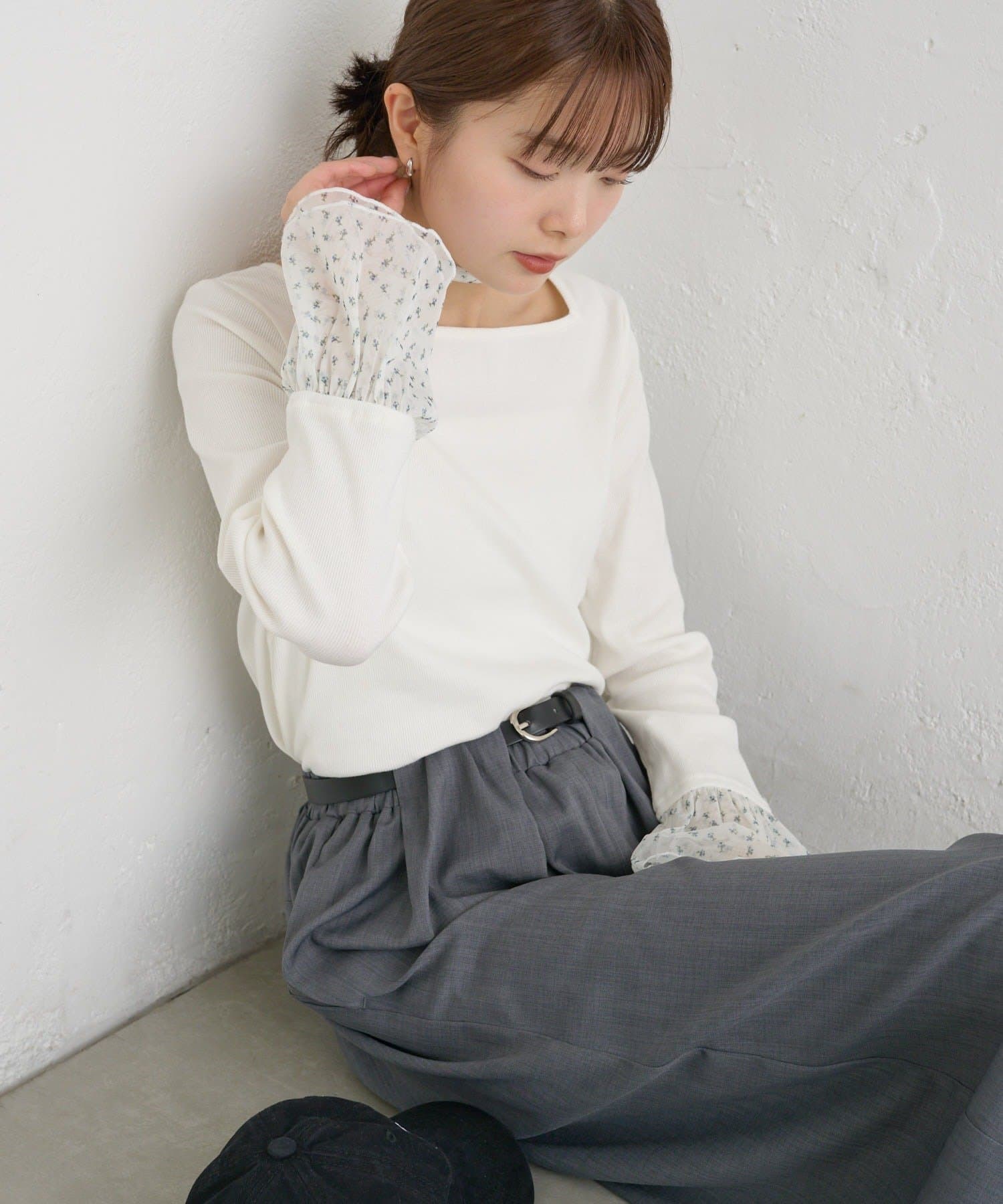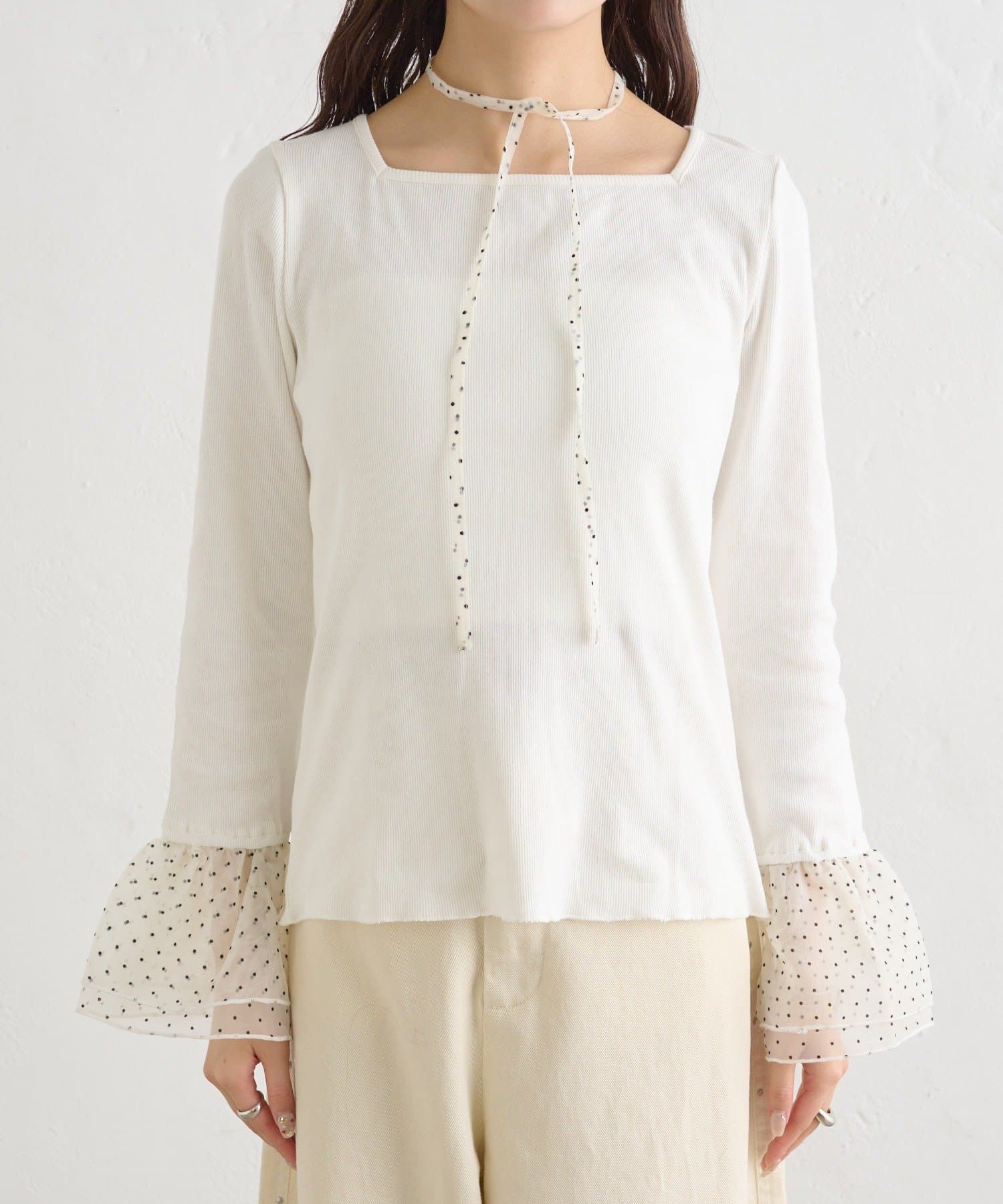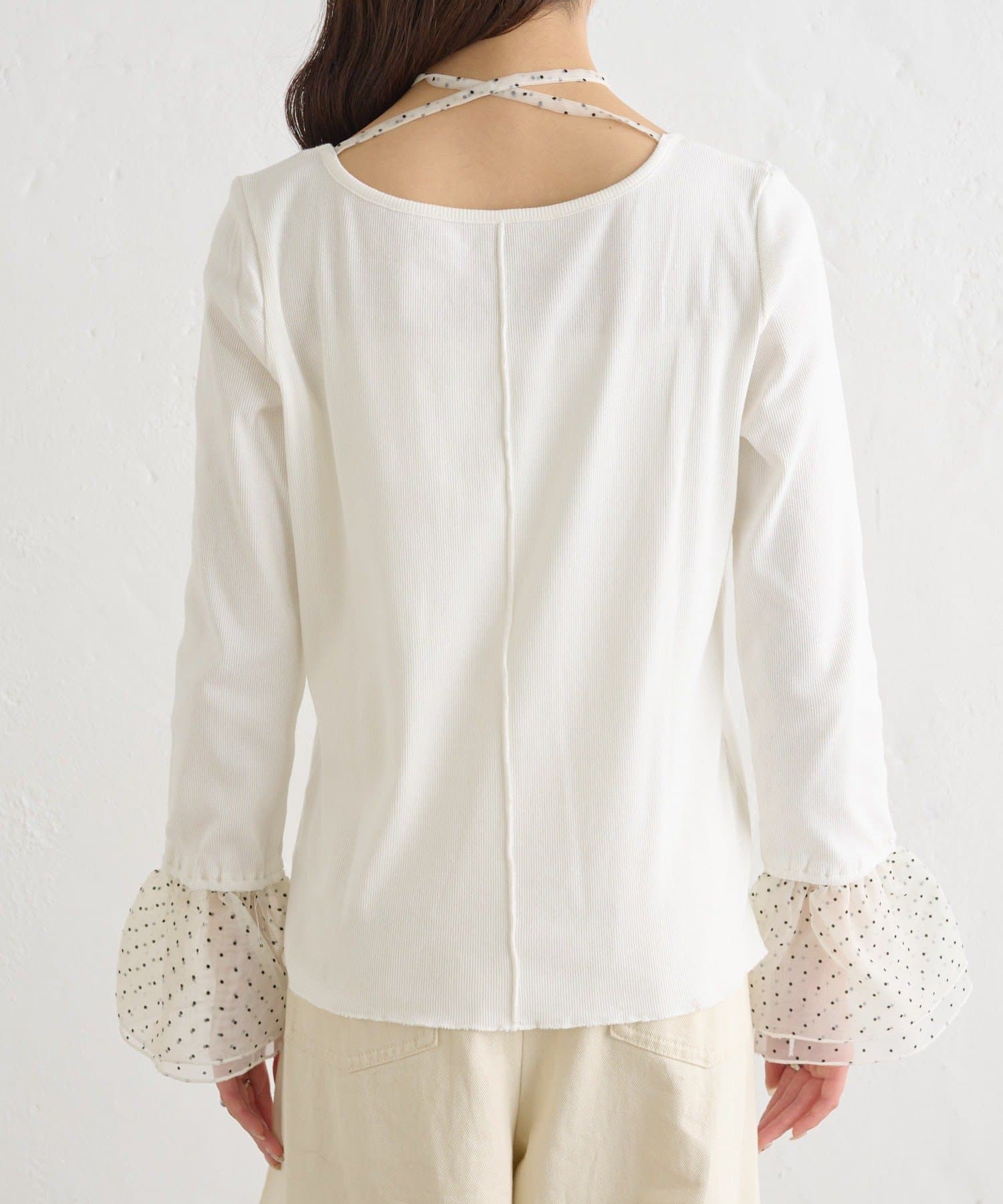 ・シンプルなロンTの袖口にチュールがドッキングされたデザイン。
