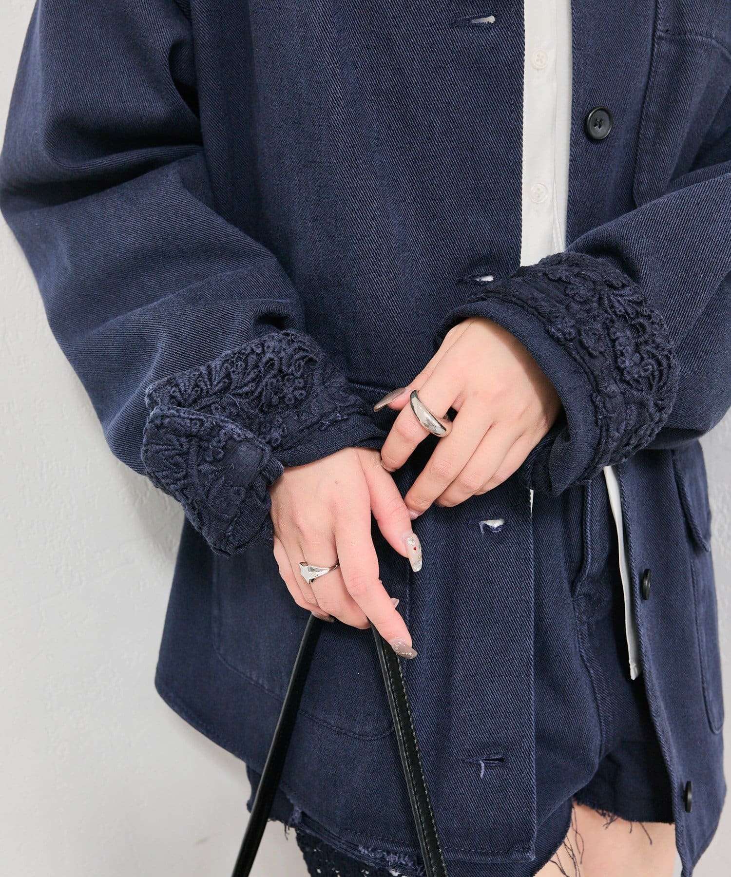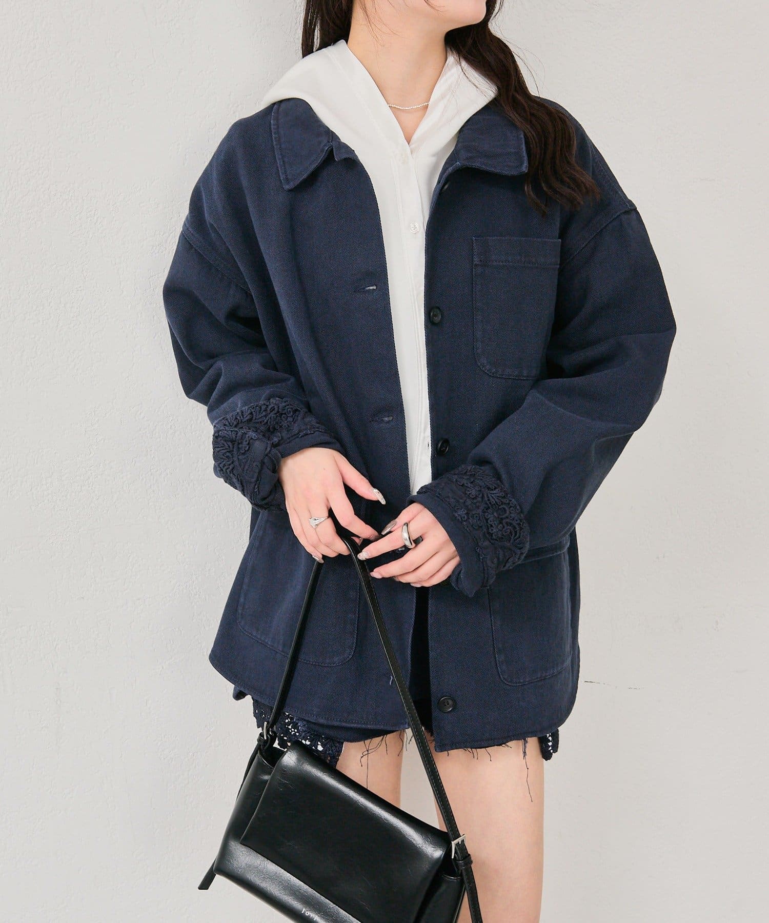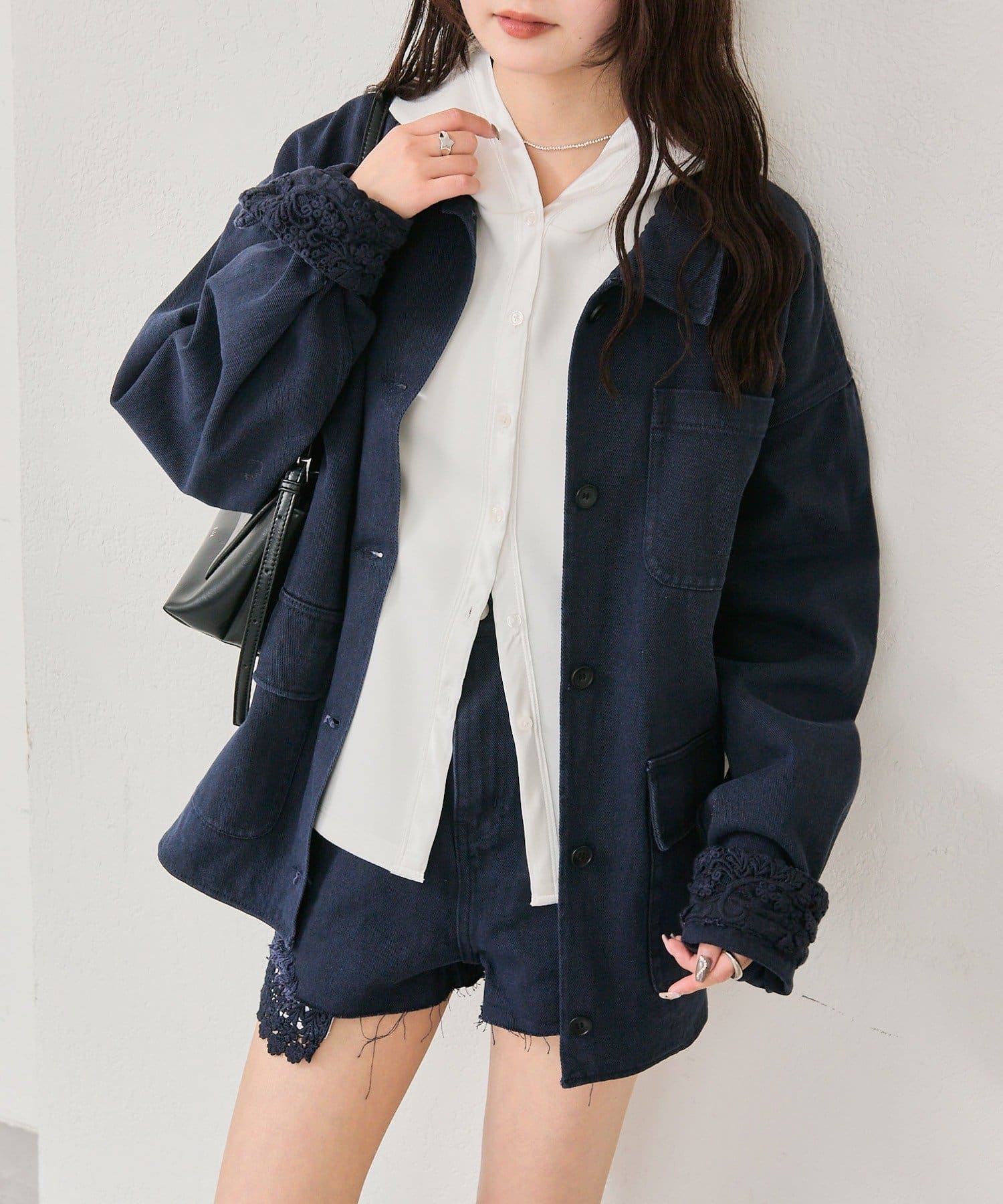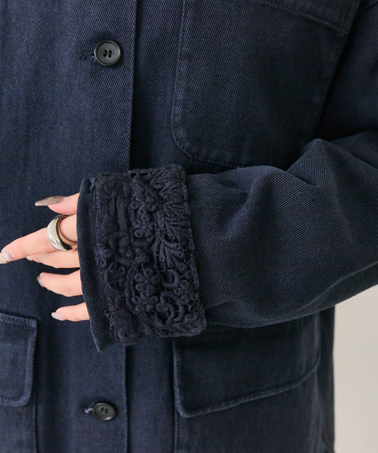 ・袖口の内側がレースデザインになっており、折り返すとレースが見えてスタイリングに甘さをプラスします。