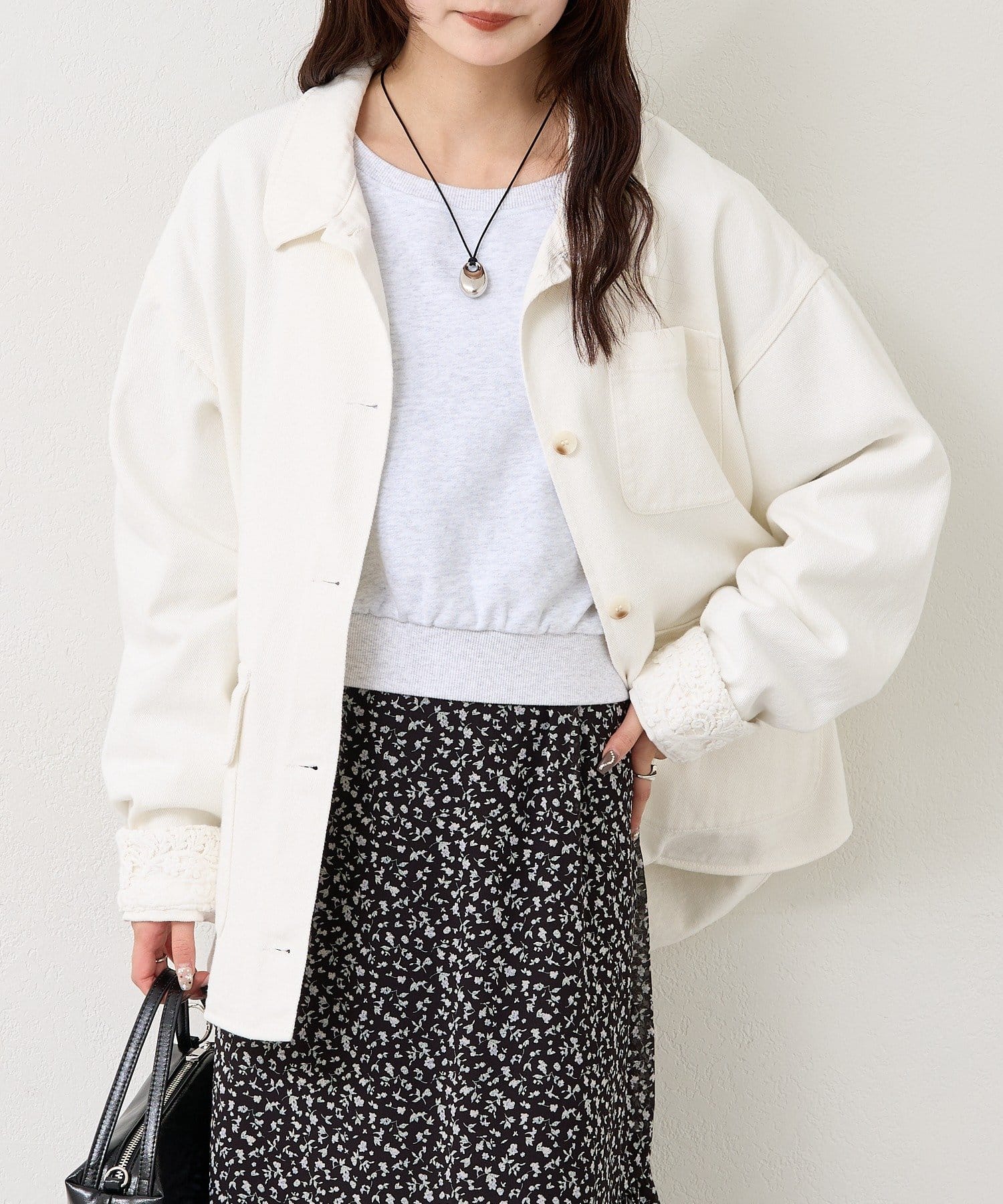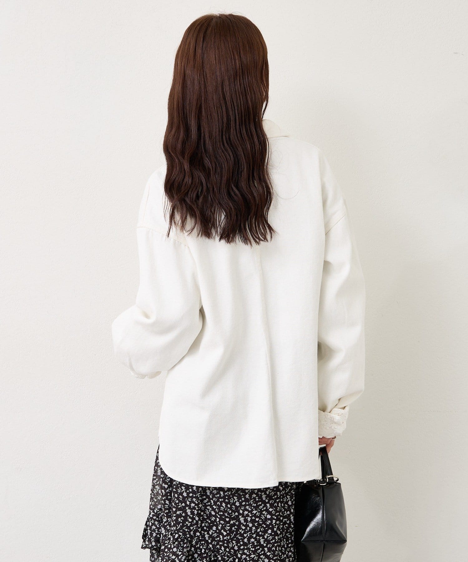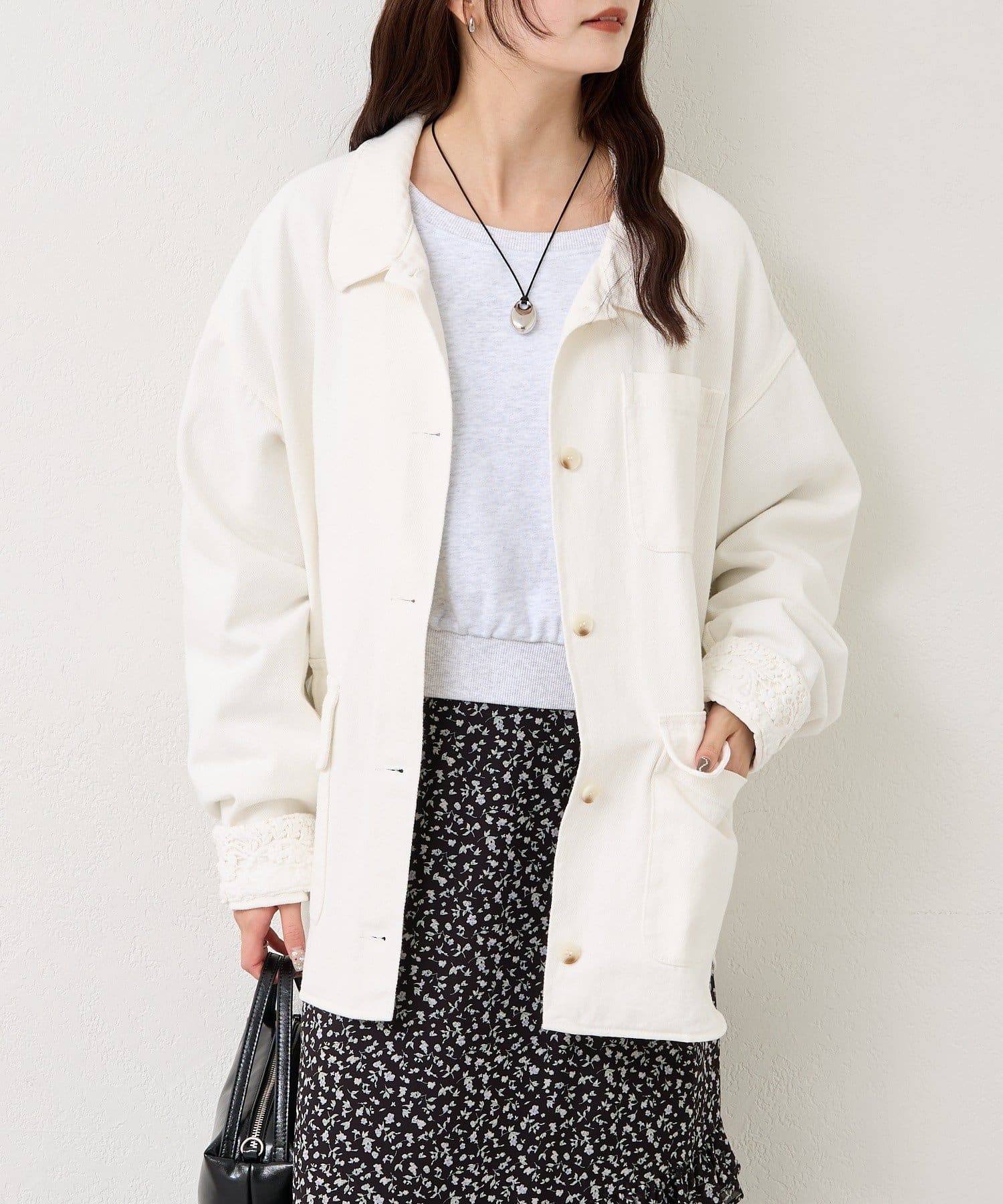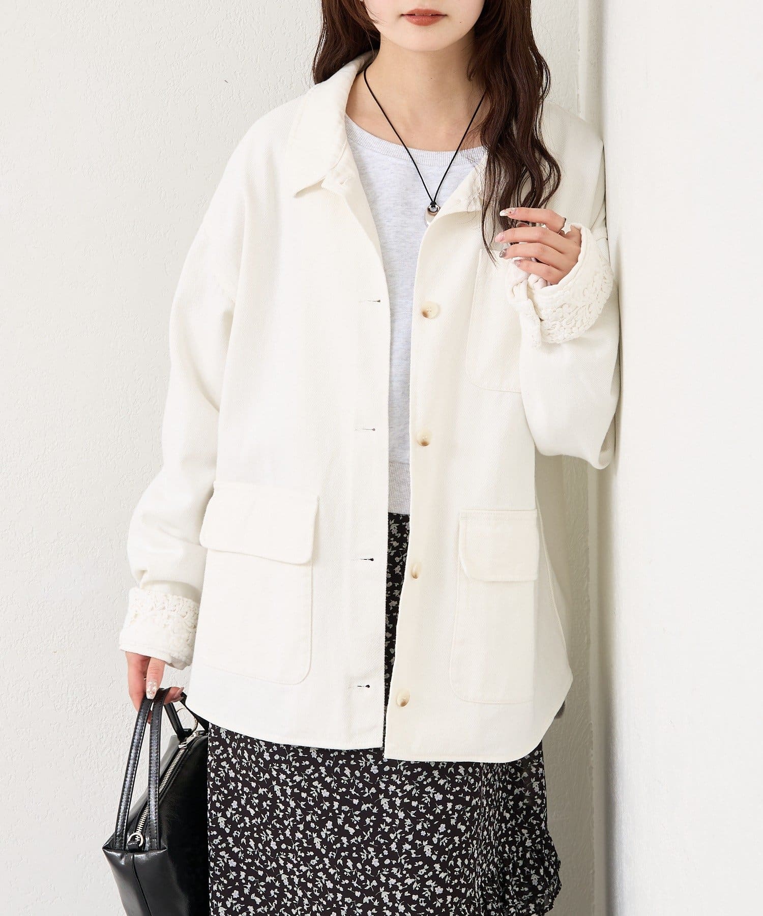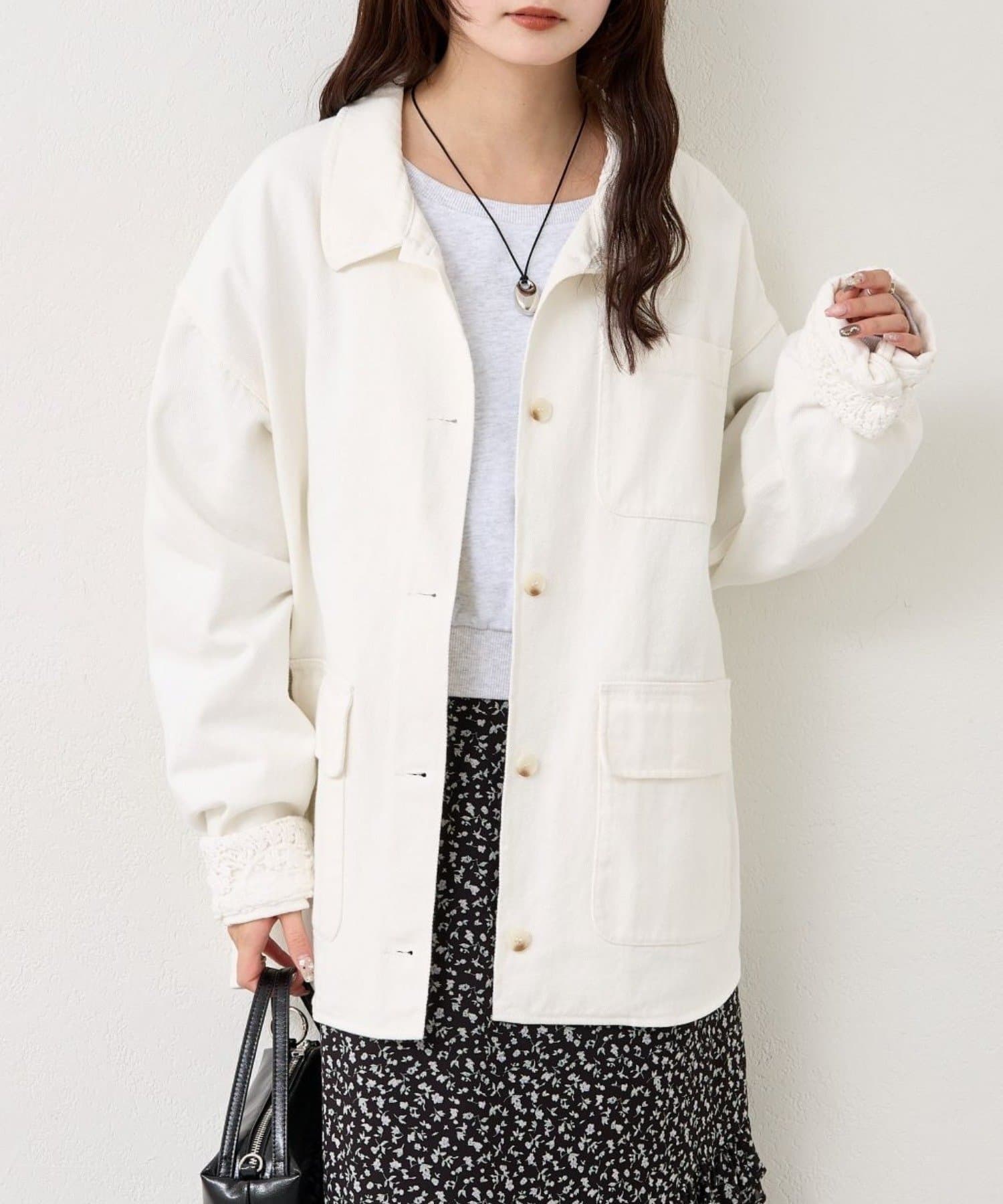 ・袖口の内側がレースデザインになっており、折り返すとレースが見えてスタイリングに甘さをプラスします。