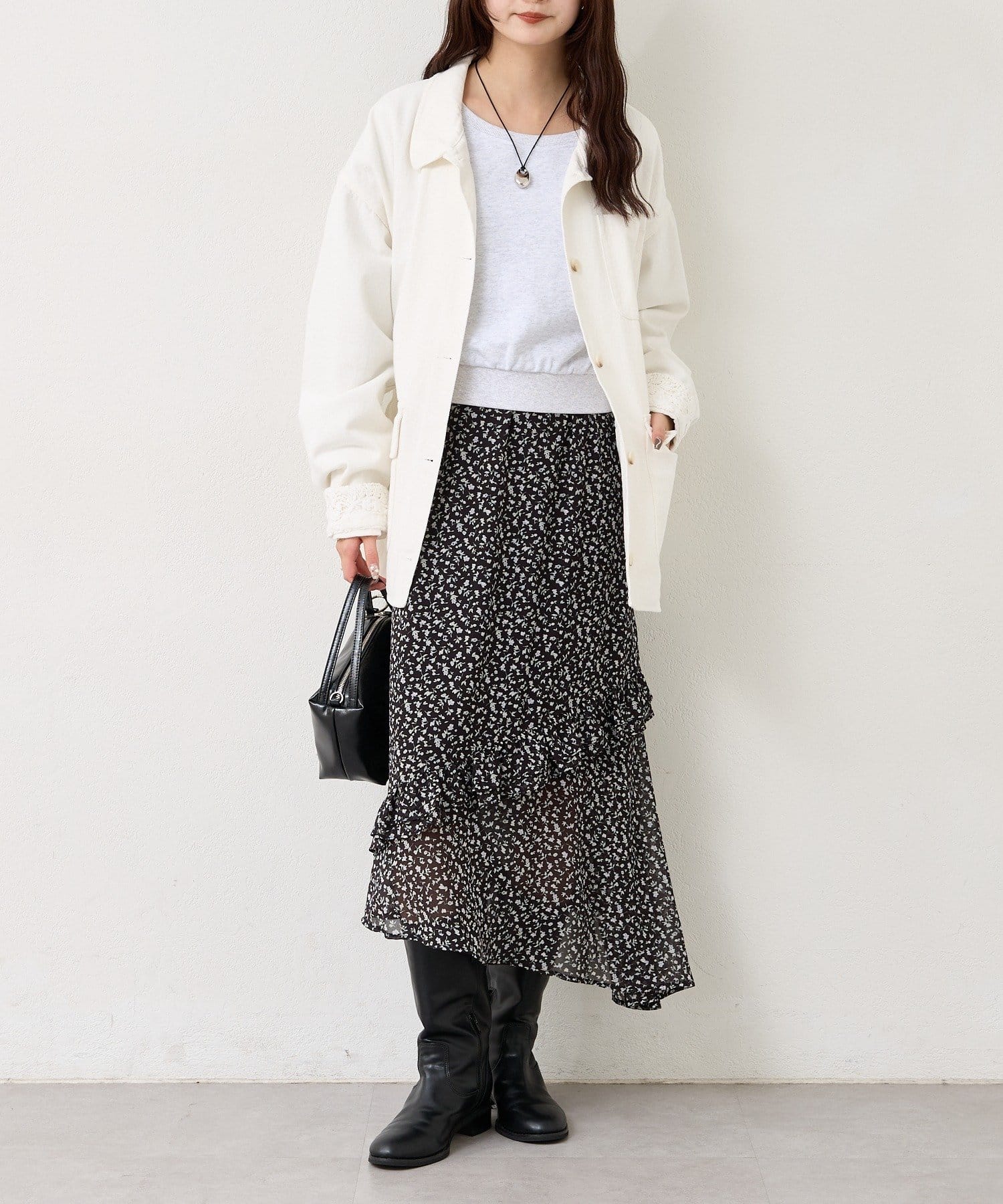 ・袖口のレース部分を見せて、パンツ合わせで大人カジュアルに。スカート合わせでフェミニンスタイルにも。