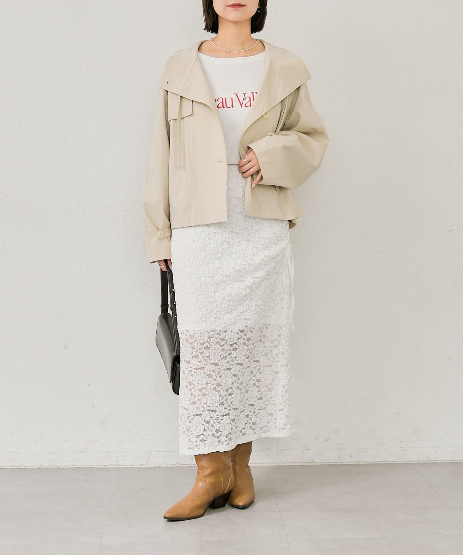 ・ロングスカートやミニボトムを合わせて、ショート丈を活かした脚長効果スタイルに。