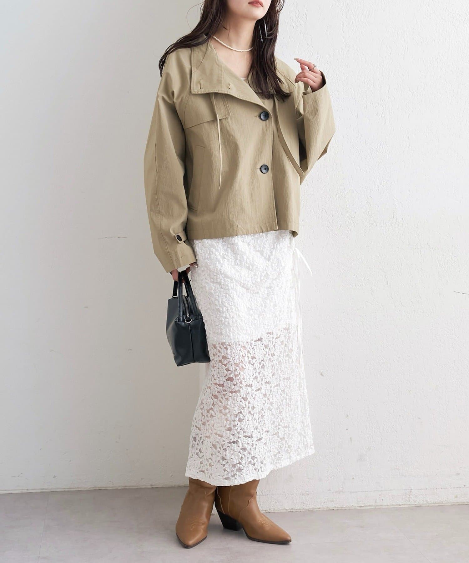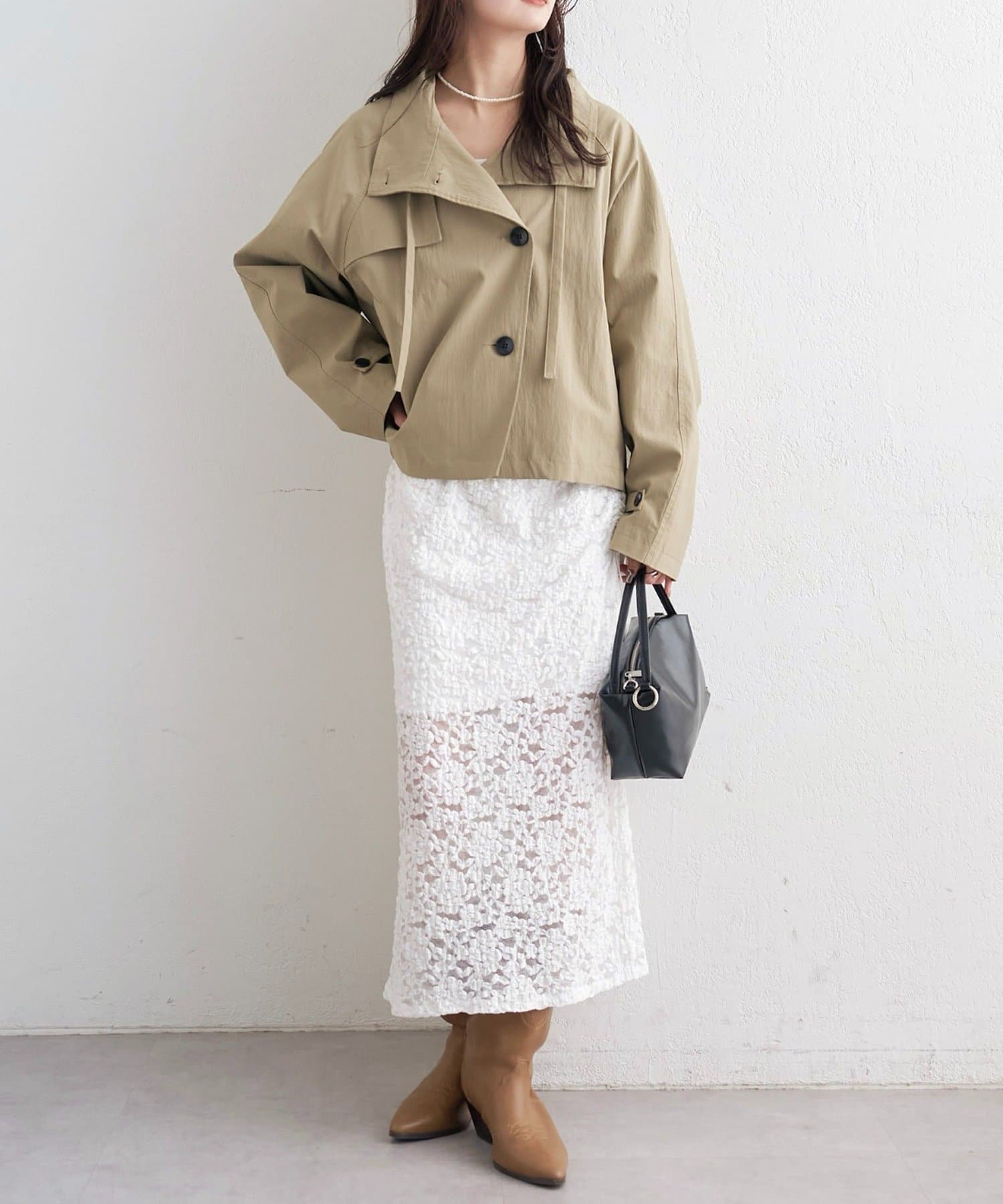 ・ロングスカートやミニボトムを合わせて、ショート丈を活かした脚長効果スタイルに。
