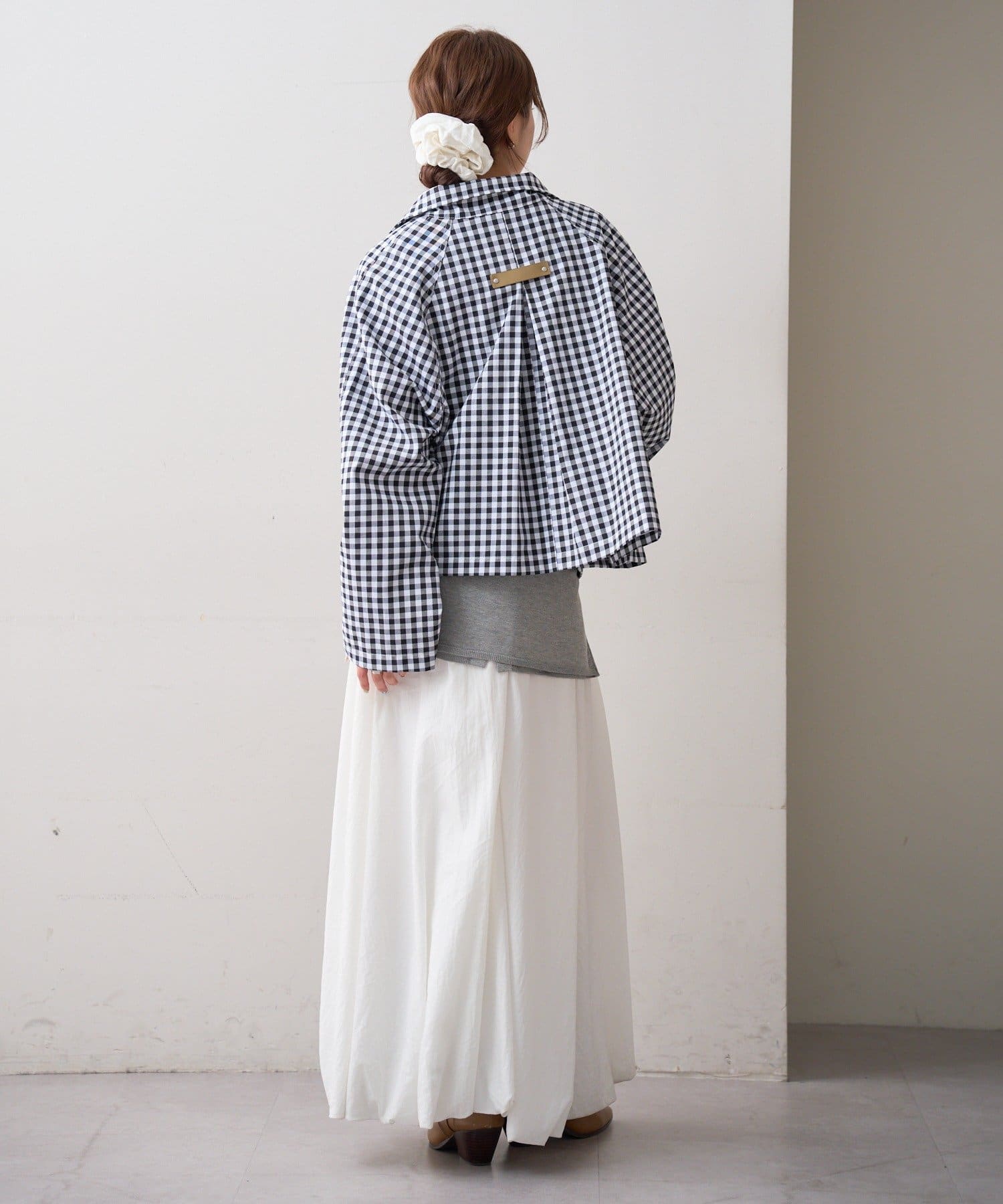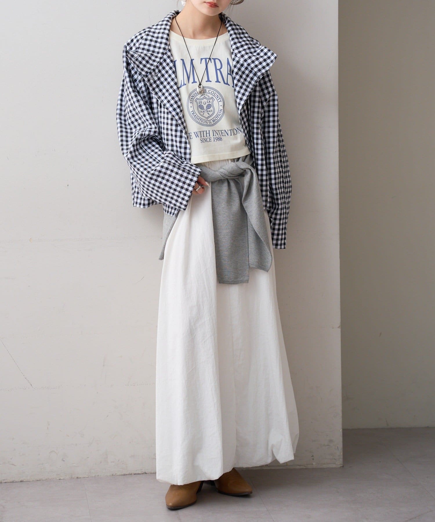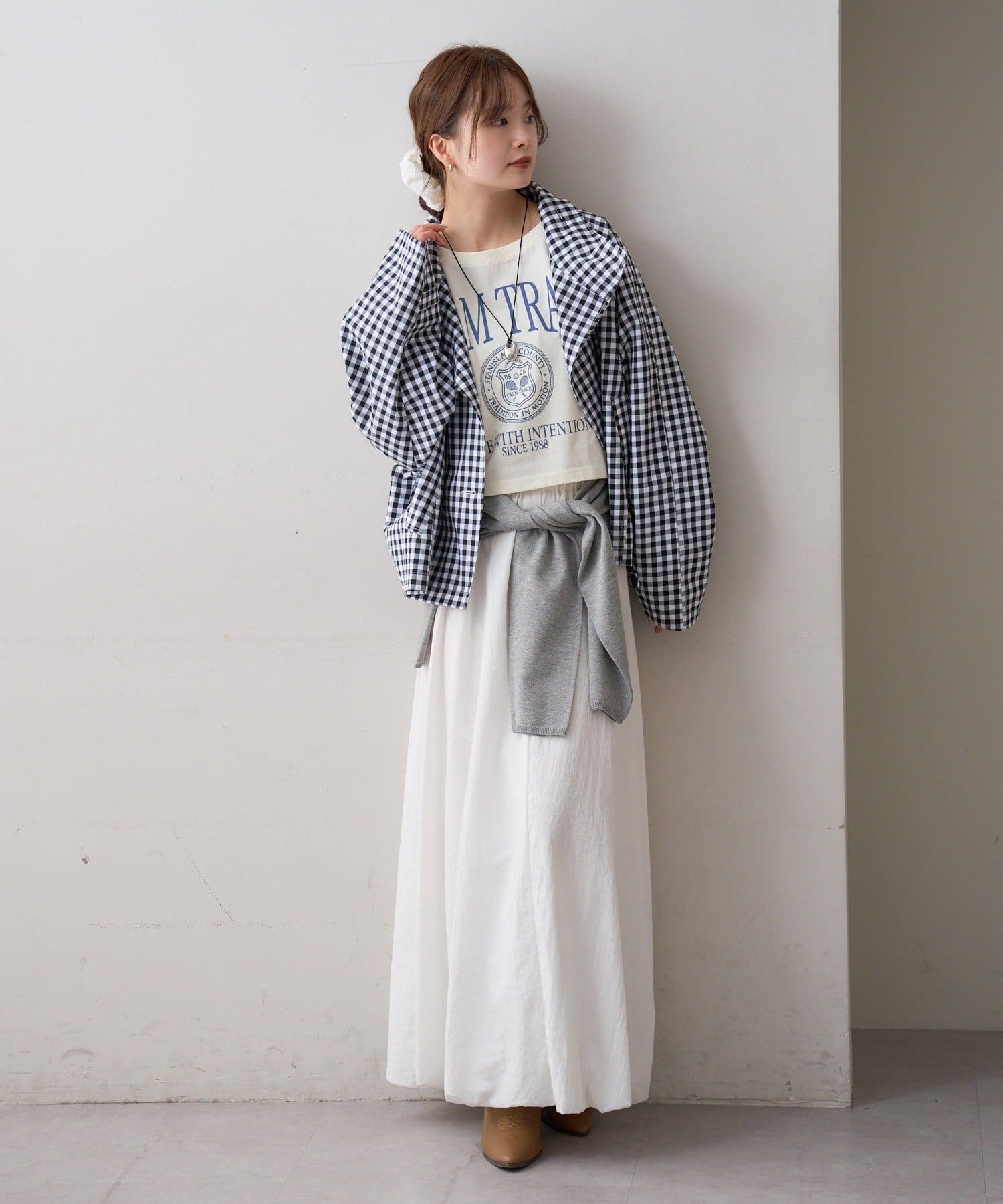 ・ロングスカートやミニボトムを合わせて、ショート丈を活かした脚長効果スタイルに。