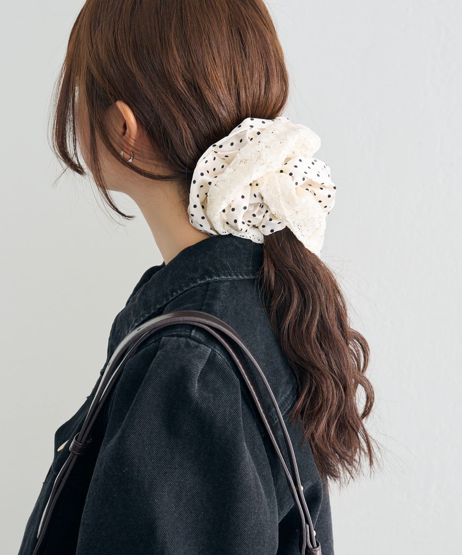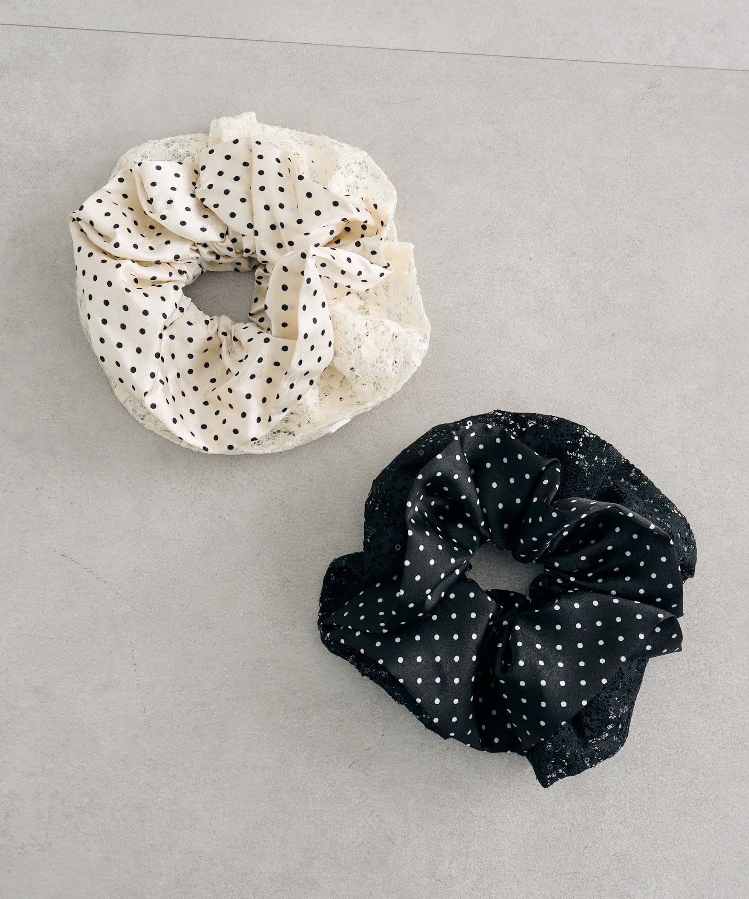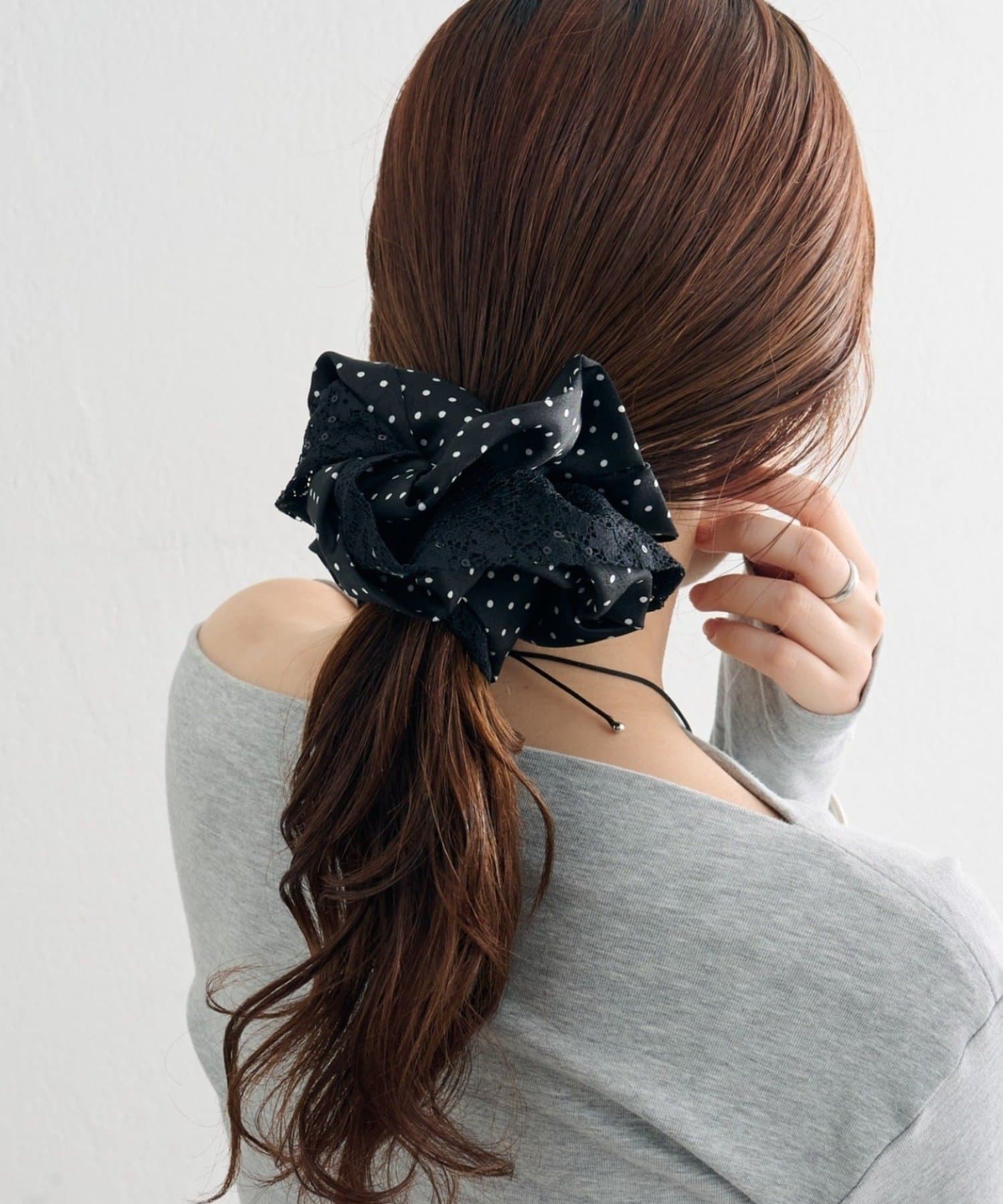 大きめなサイズ感とレース×ドットでトレンド感たっぷりなシュシュ
