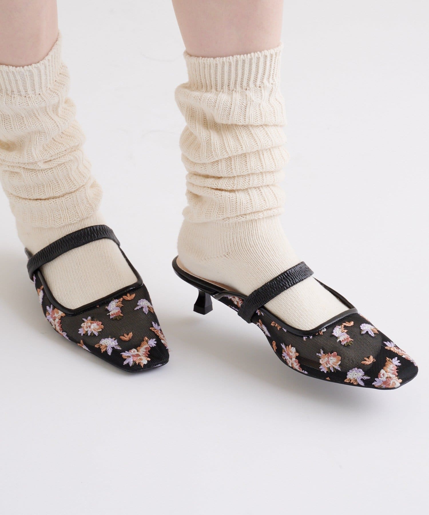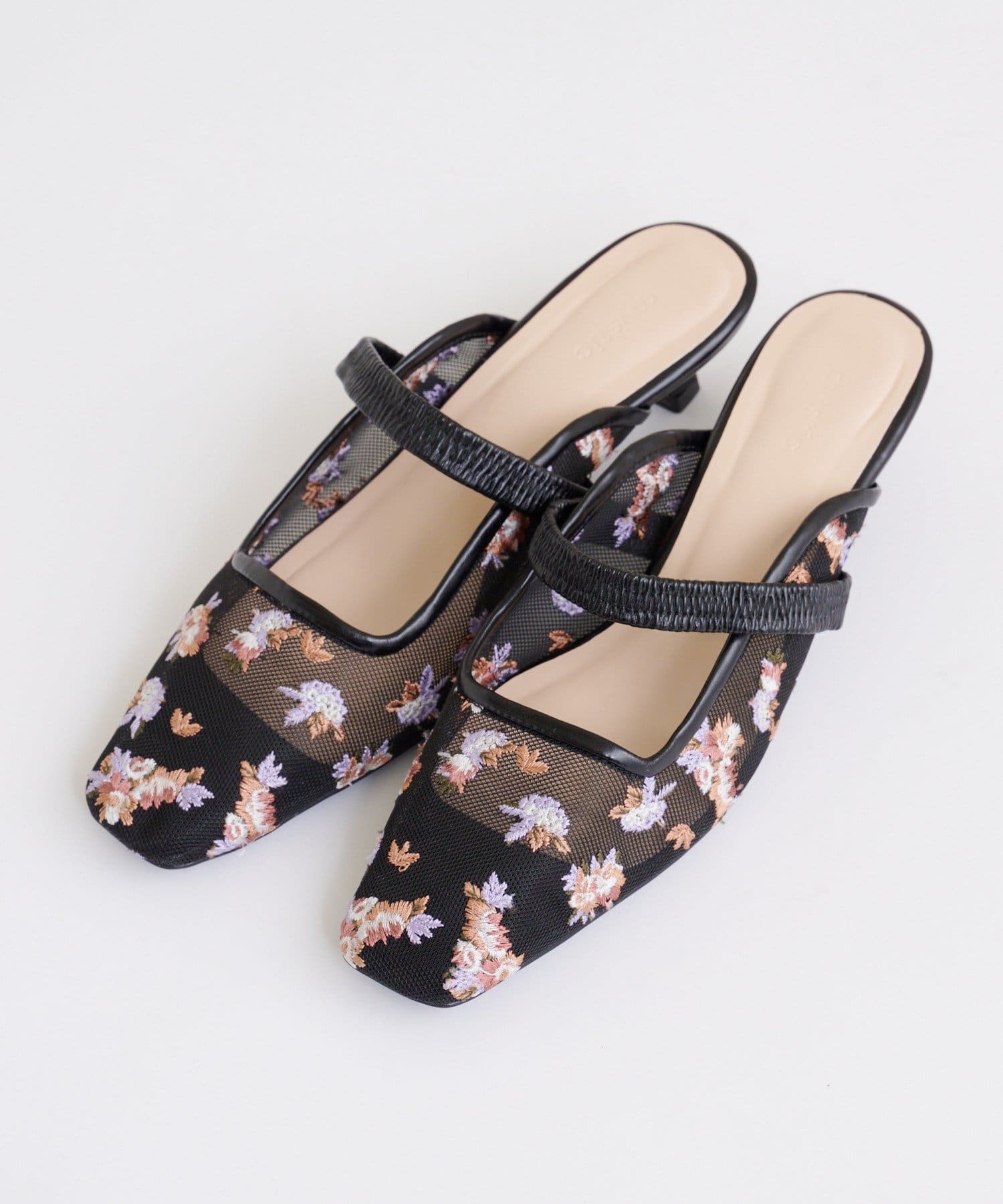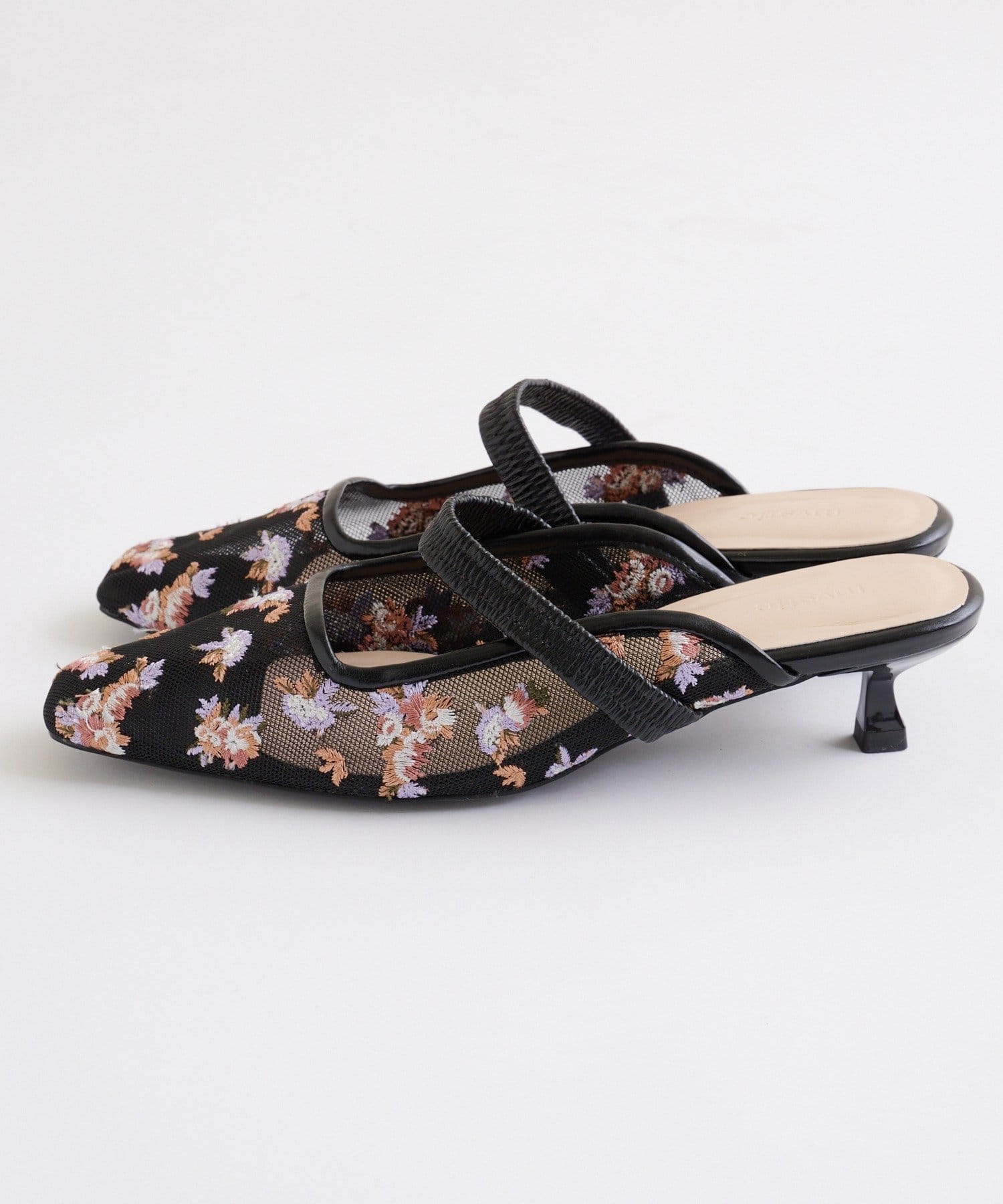 ・全体に散りばめられたフラワー柄の刺繍が目を惹くミュール。