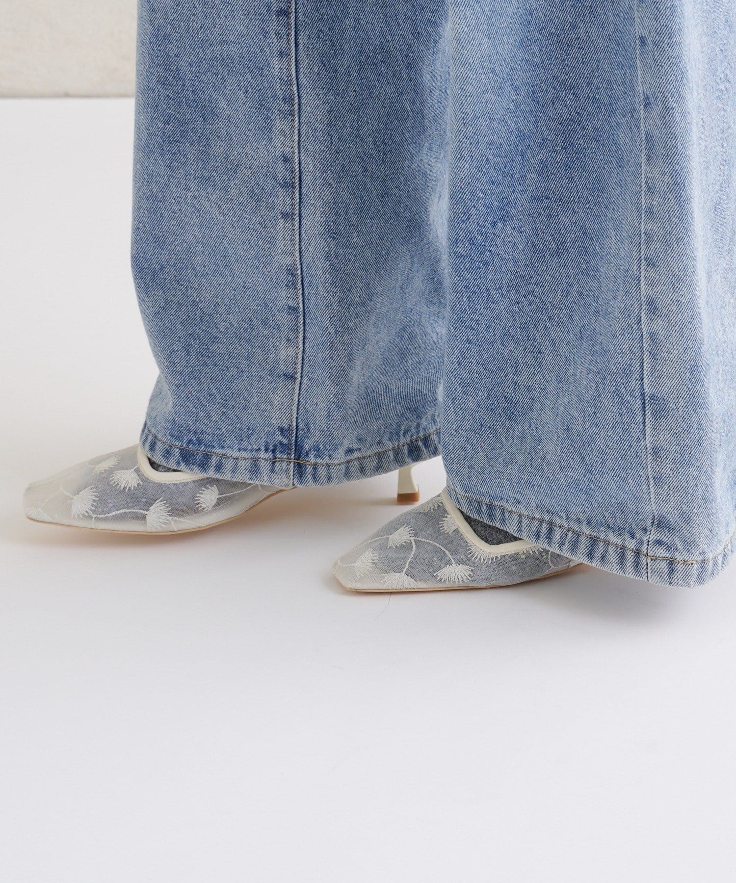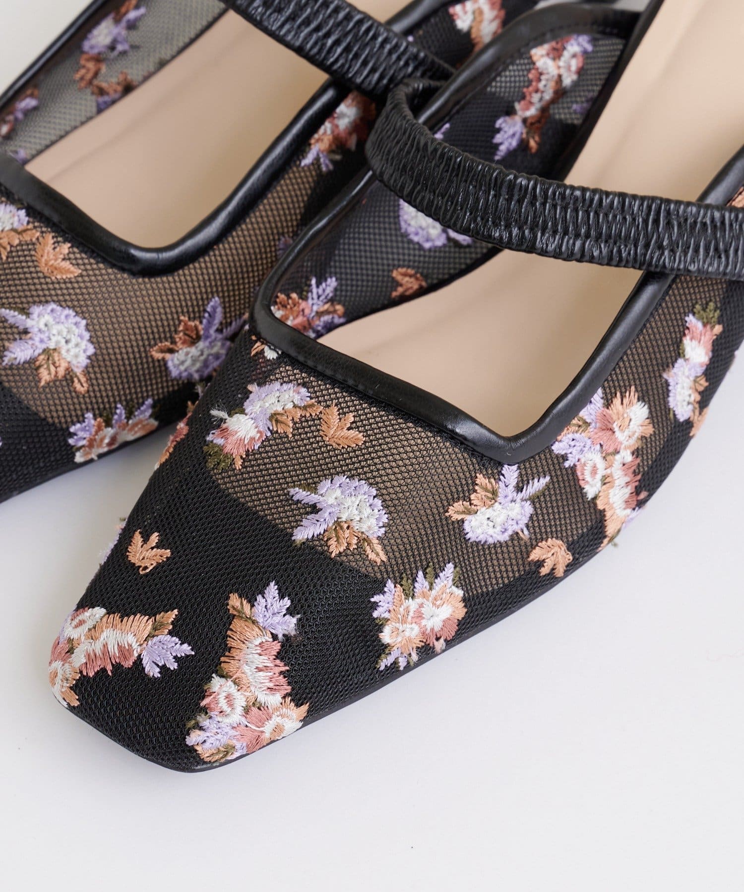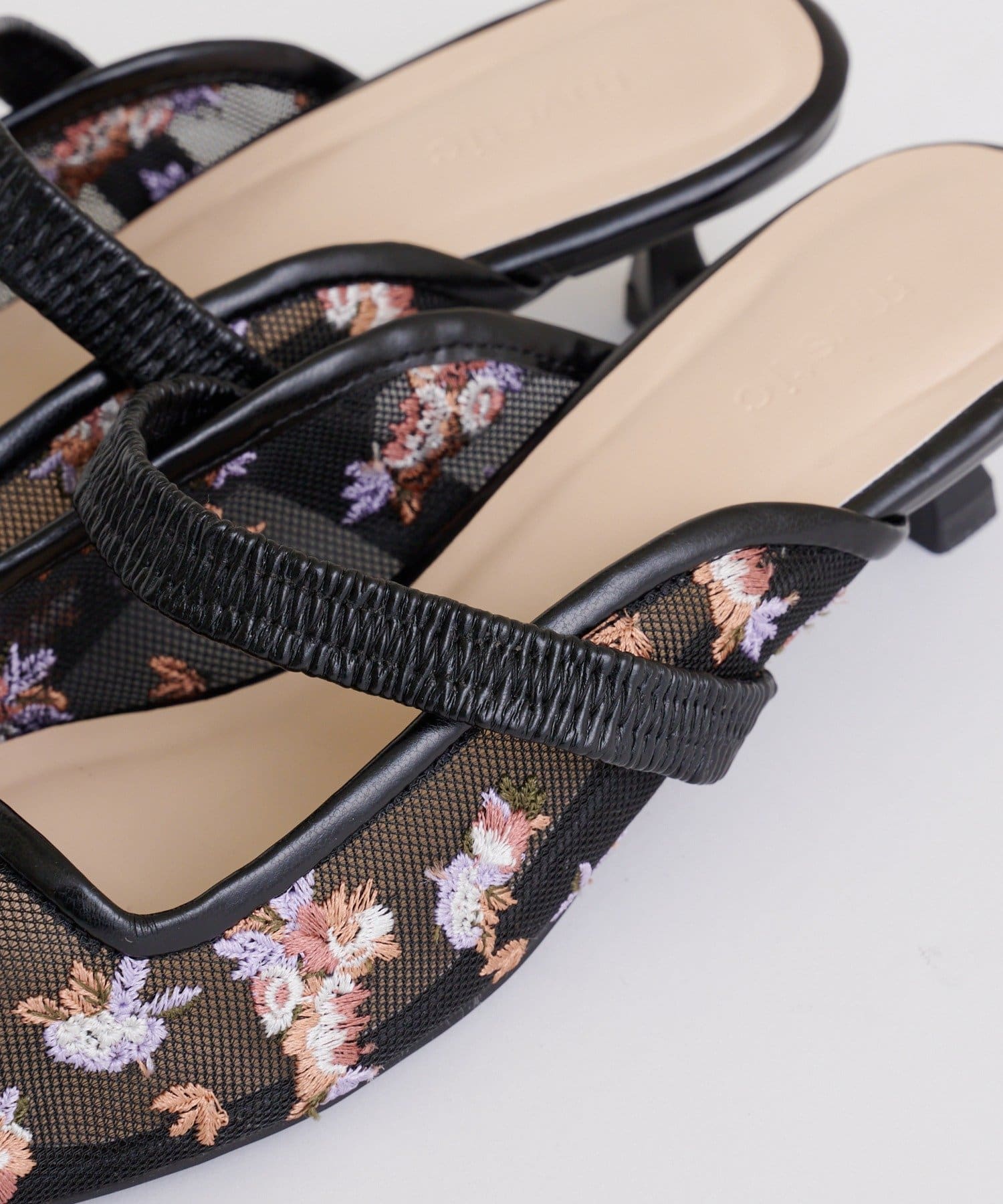 ・全体に散りばめられたフラワー柄の刺繍が目を惹くミュール。