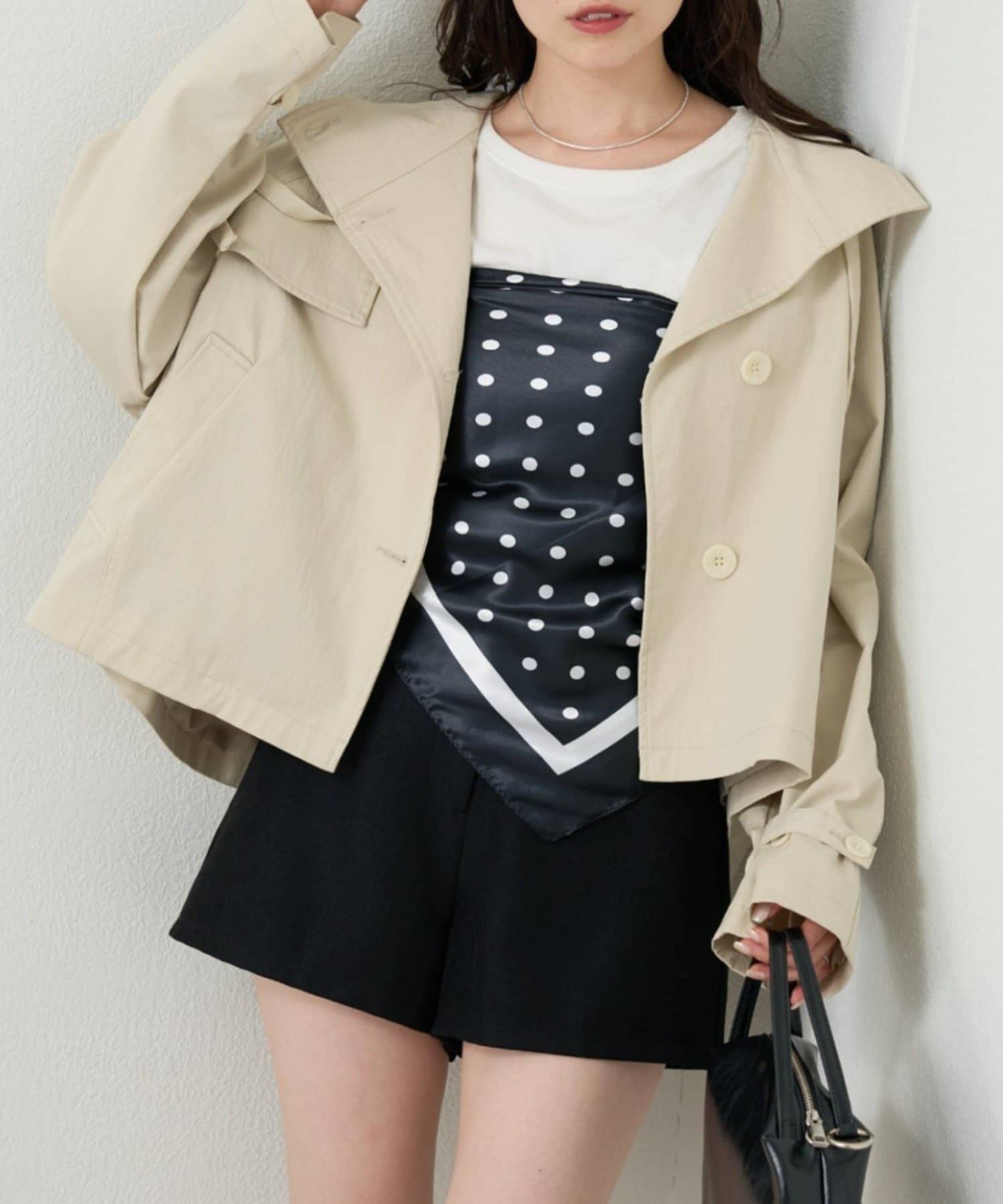 首元やヘアアレンジ、ウエストマークなどにアクセントとして取り入れやすいドット柄のスカーフ。