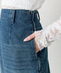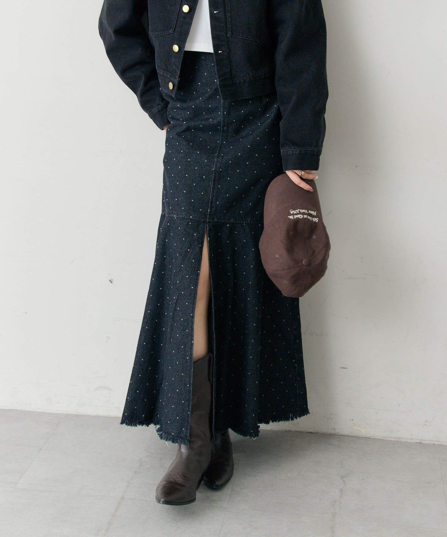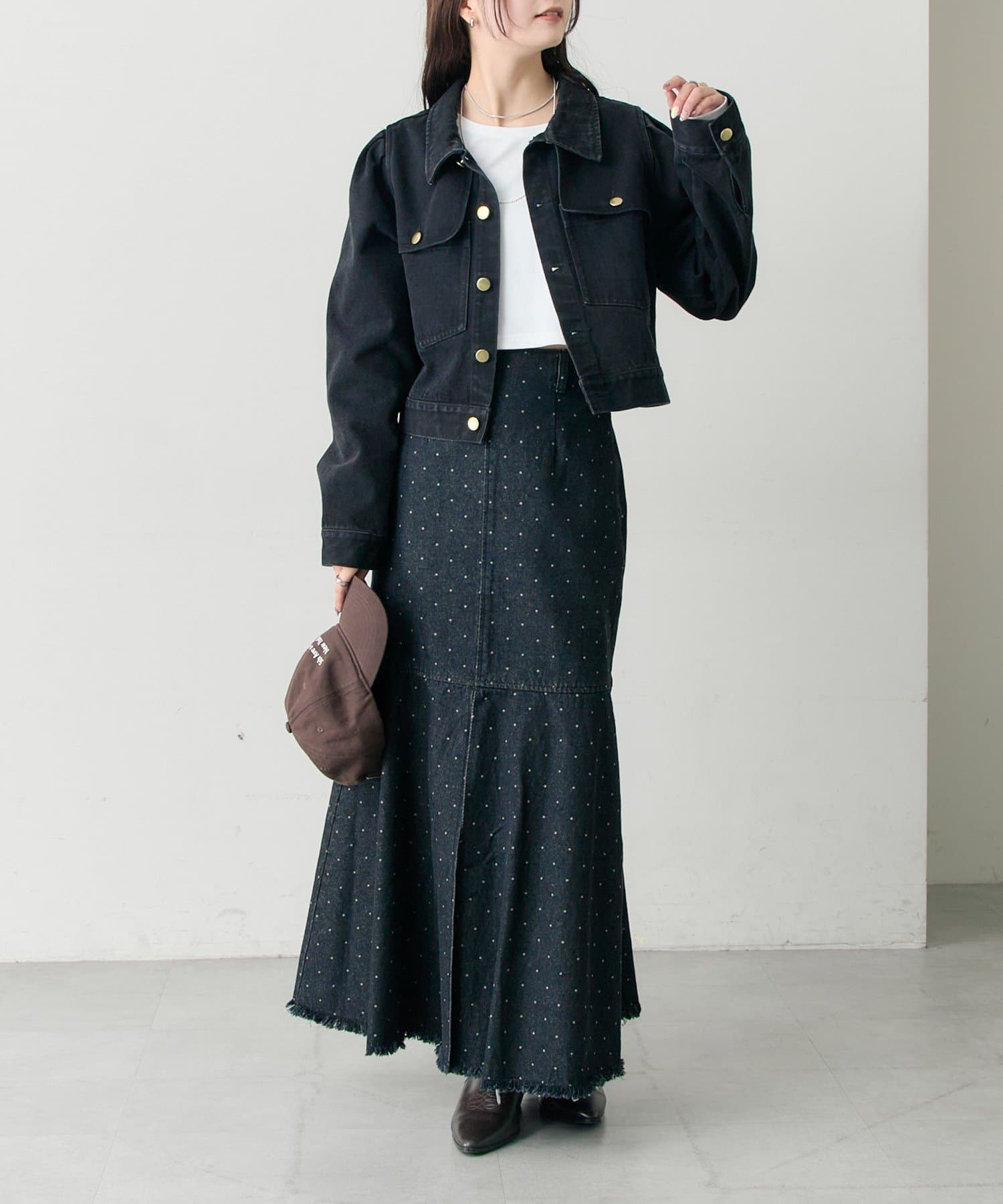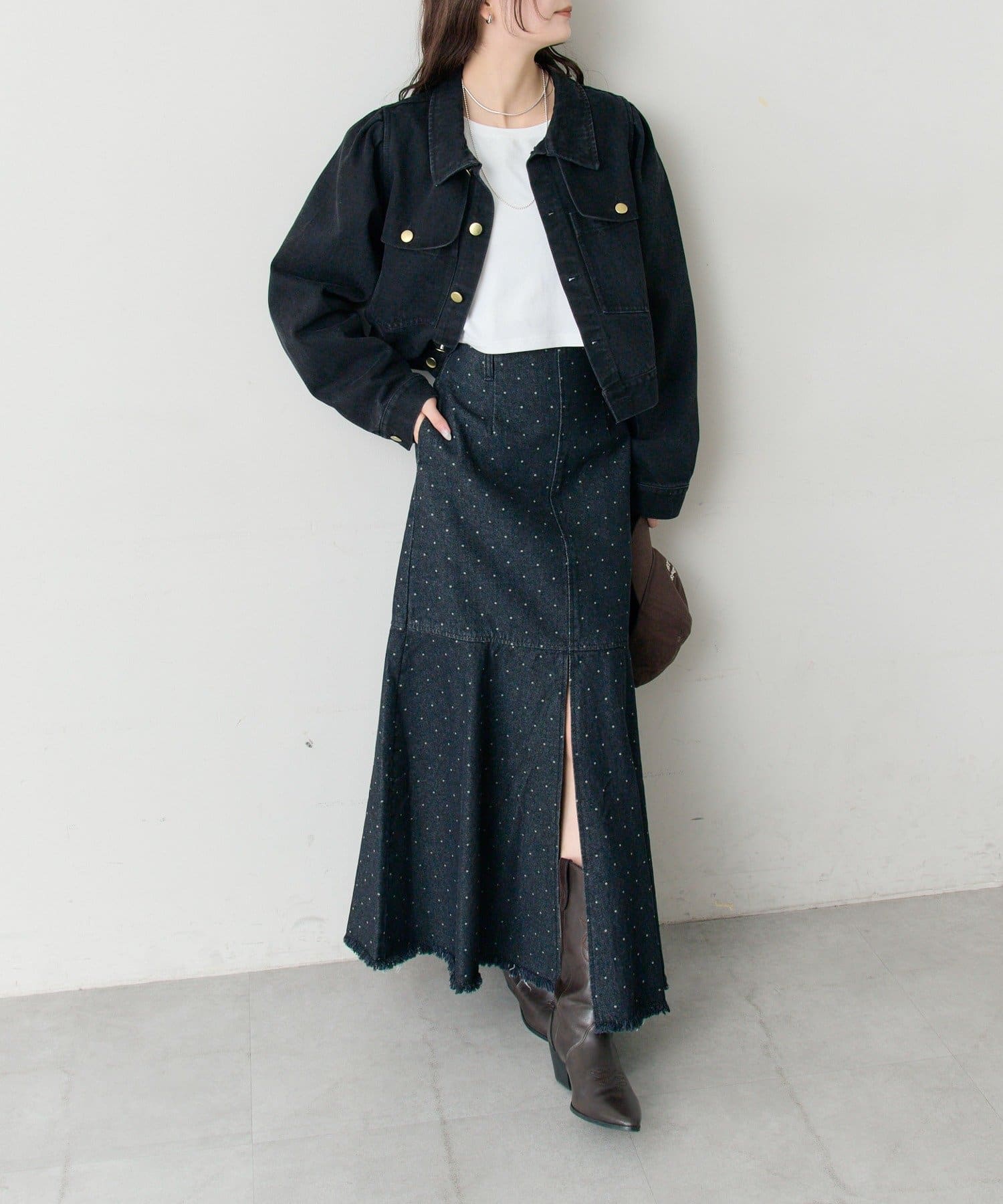 デニム素材ですが、キレイ見えもする大人っぽく決まるアイテムです。