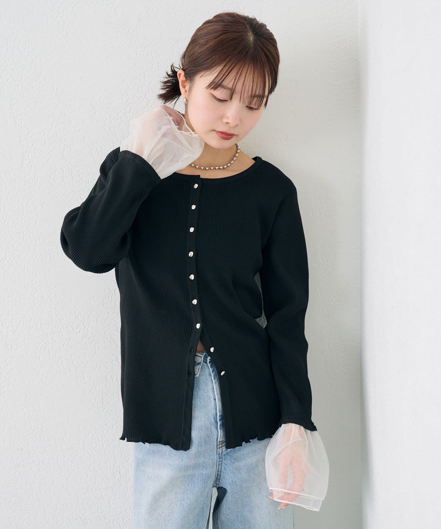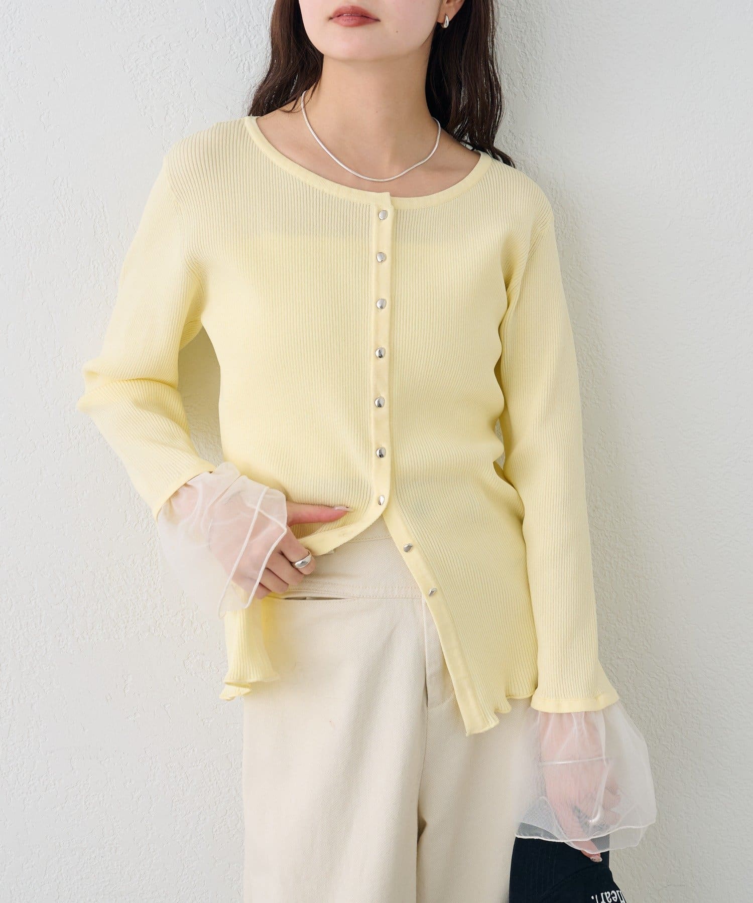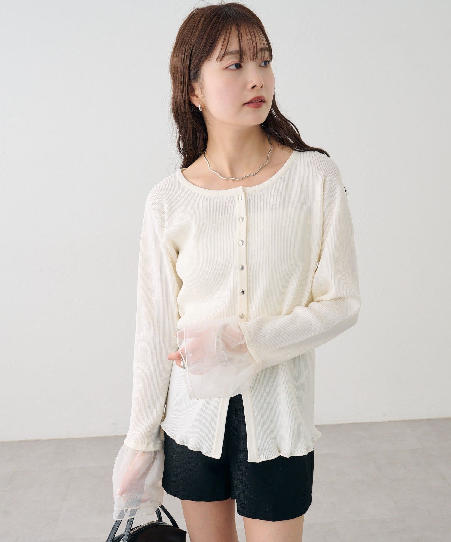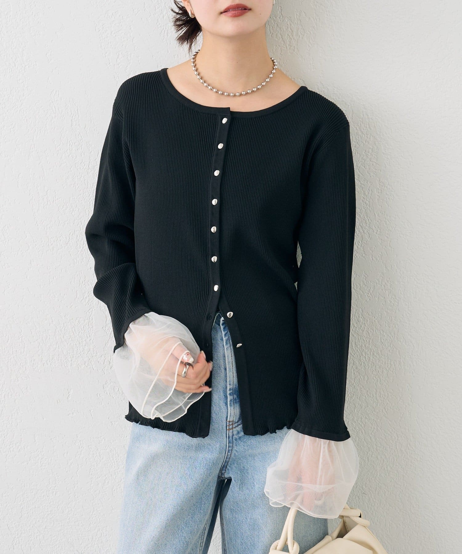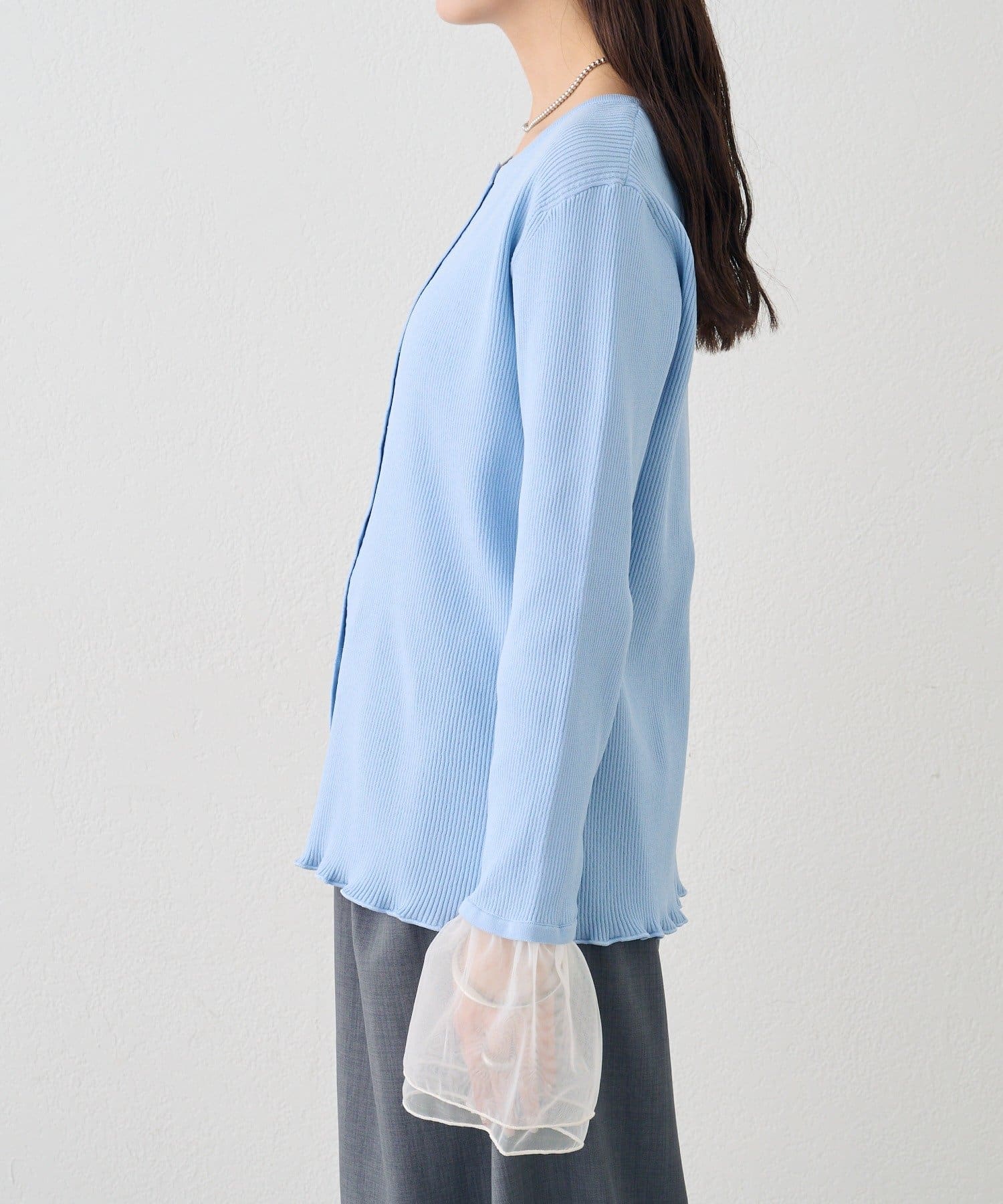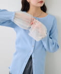 袖のチュールが華やかさをプラスするリブカーディガン
