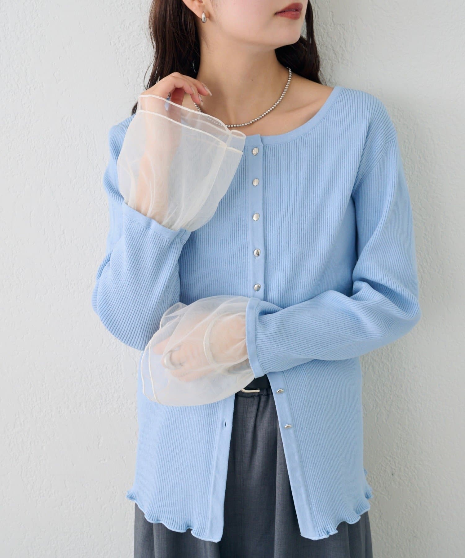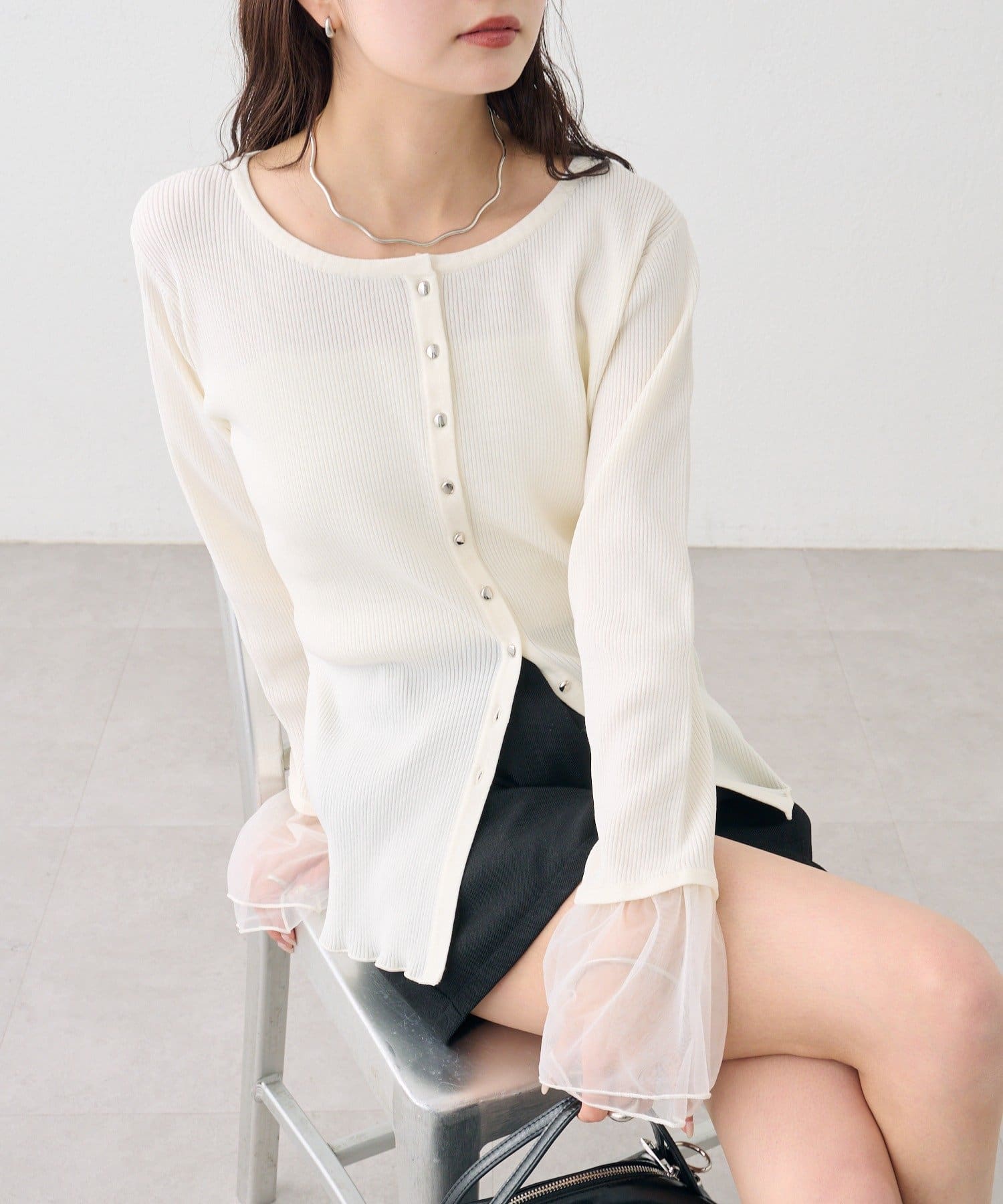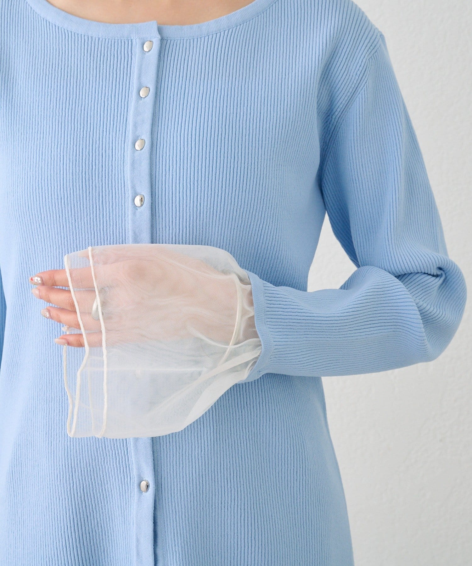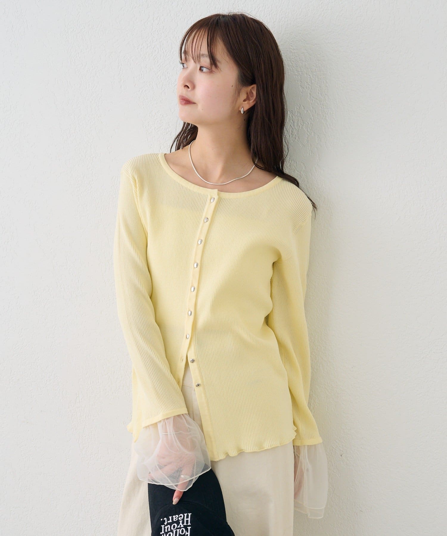 袖のチュールが華やかさをプラスするリブカーディガン