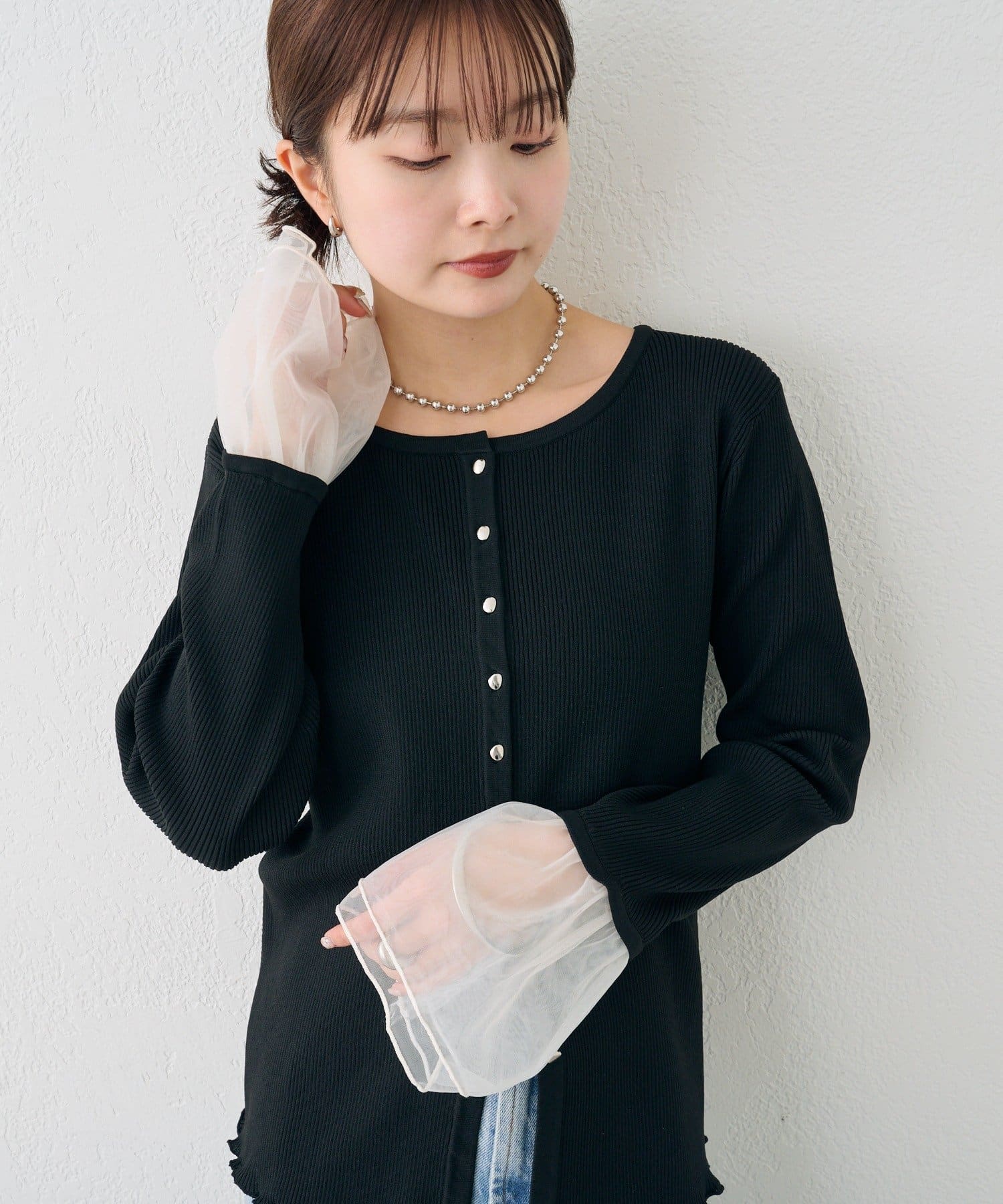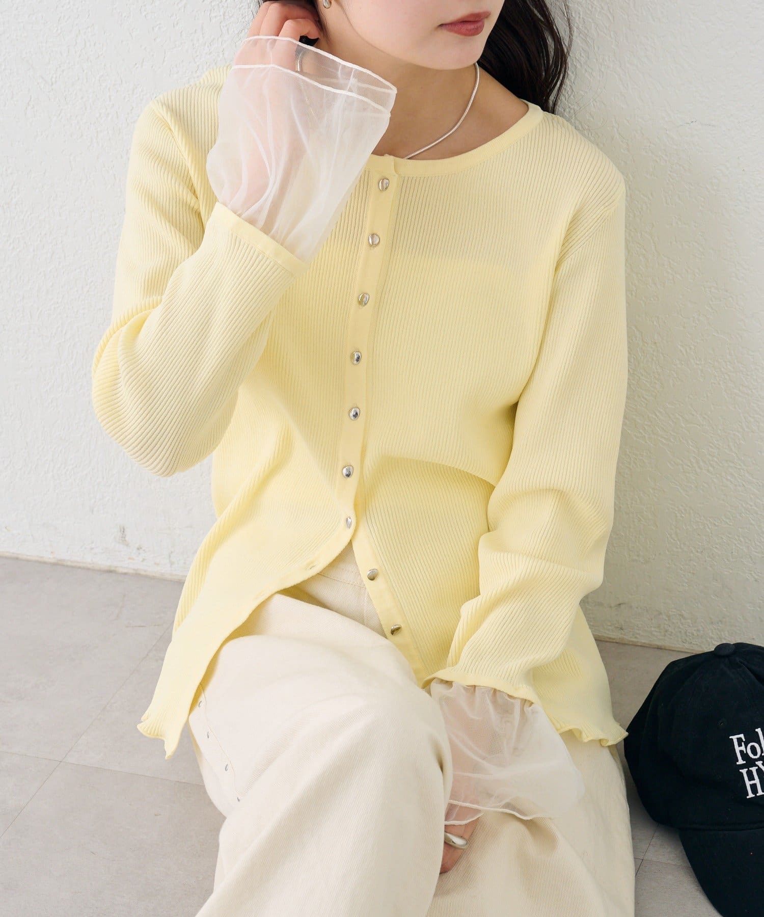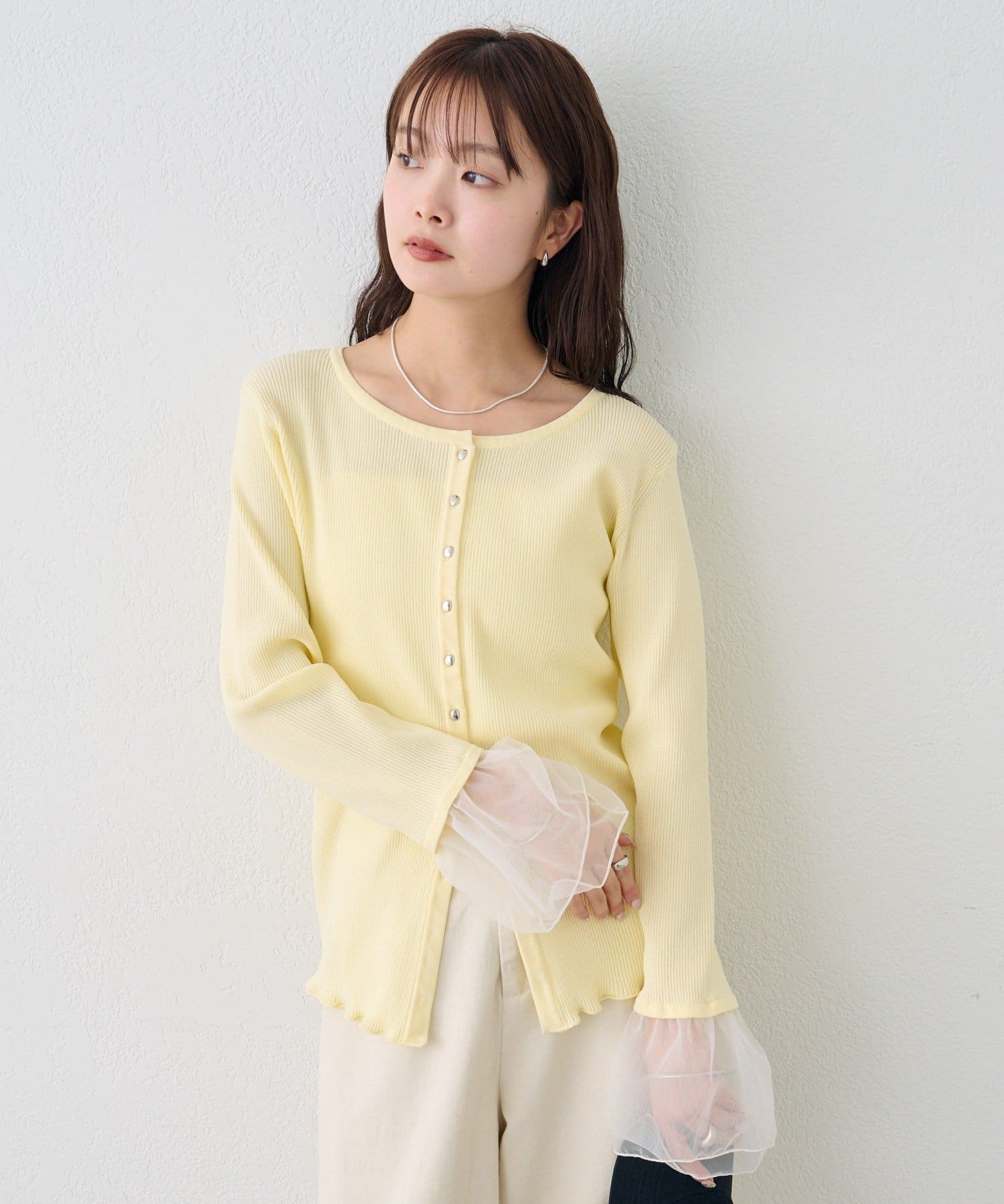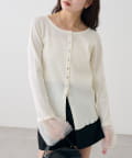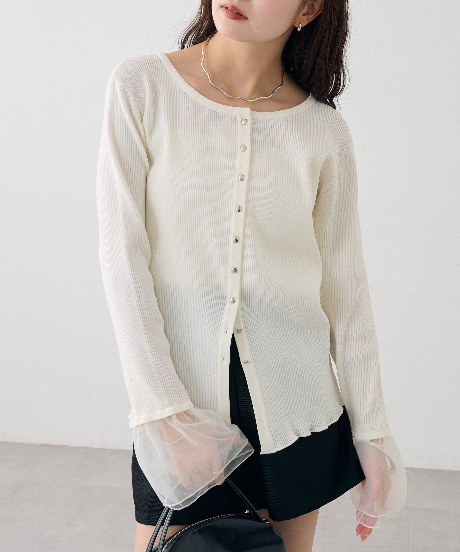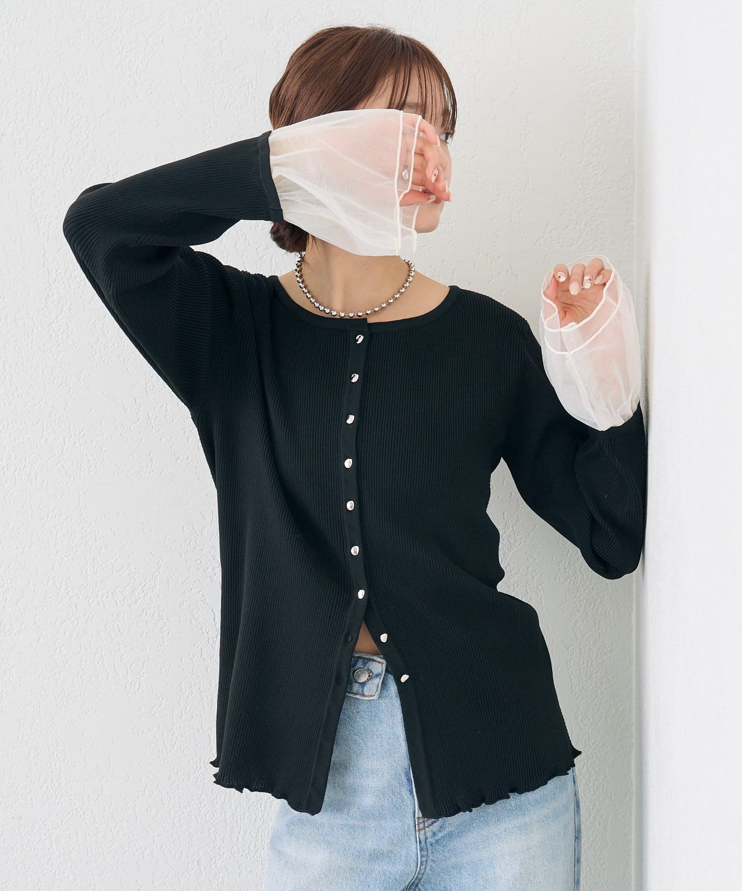 袖のチュールが華やかさをプラスするリブカーディガン
