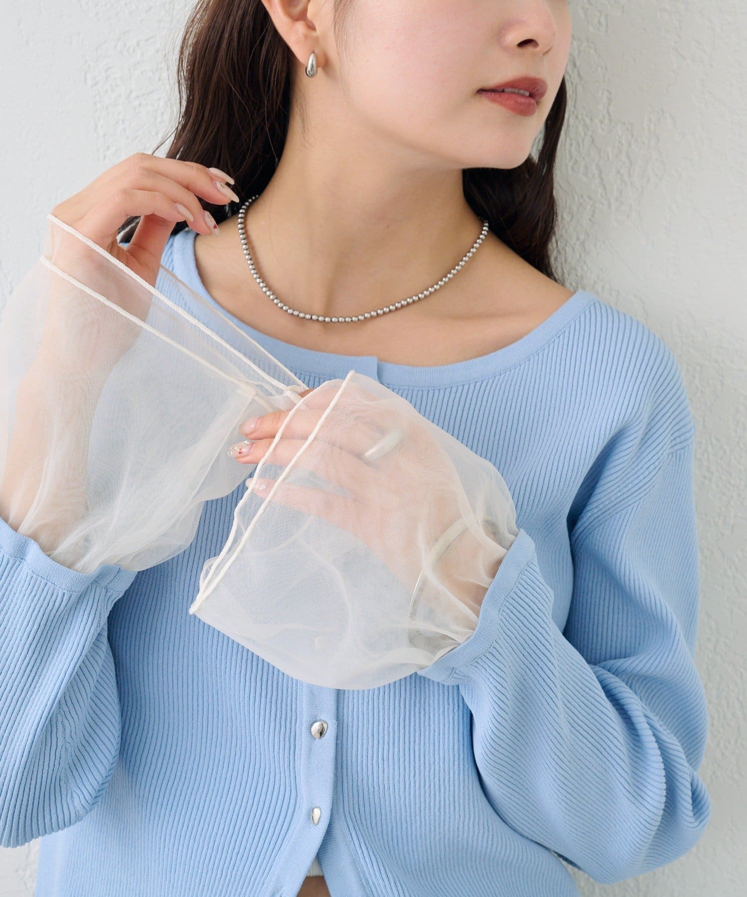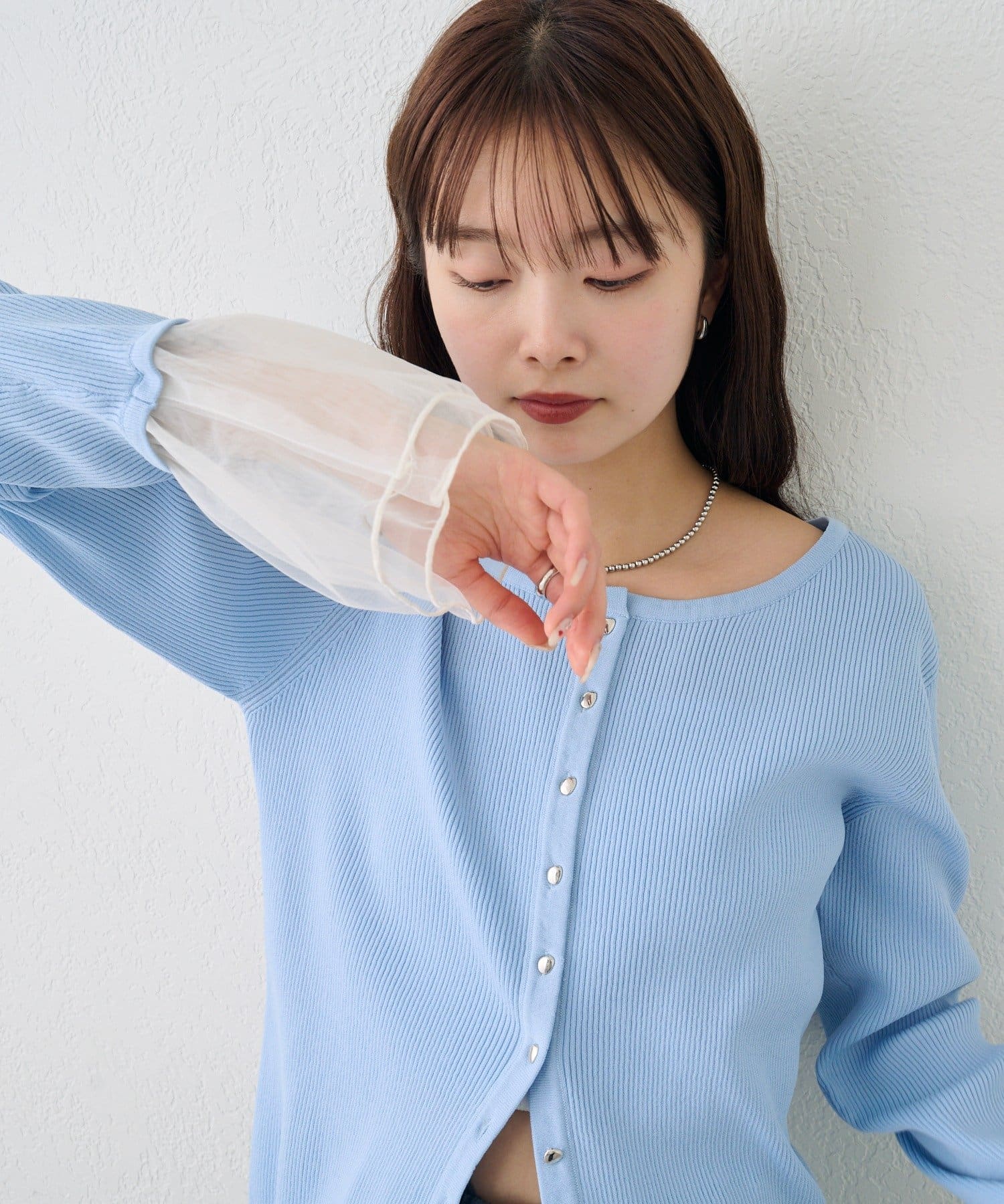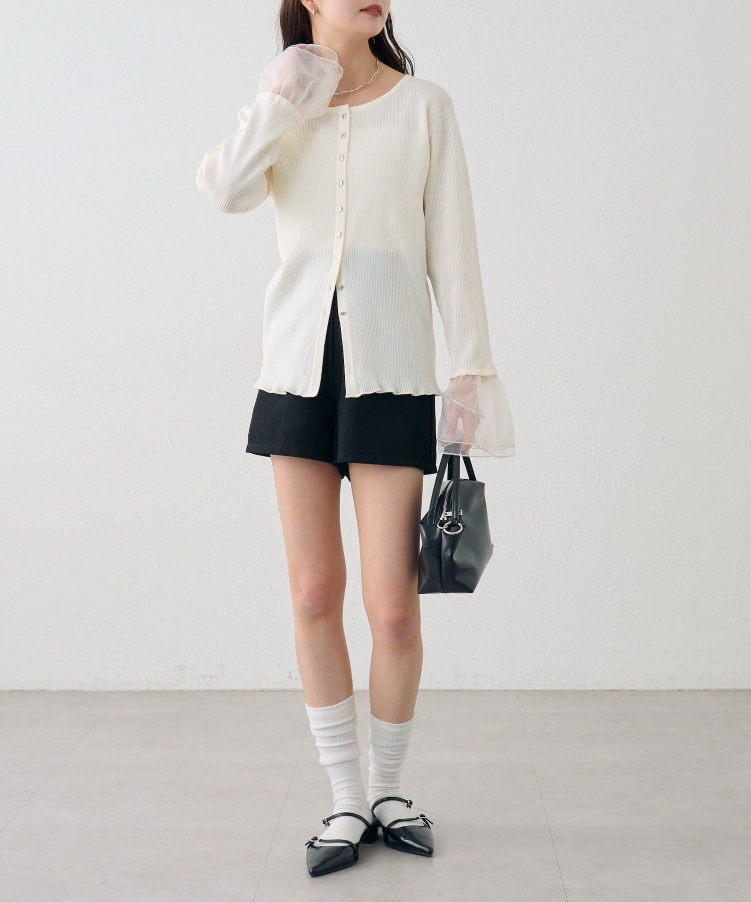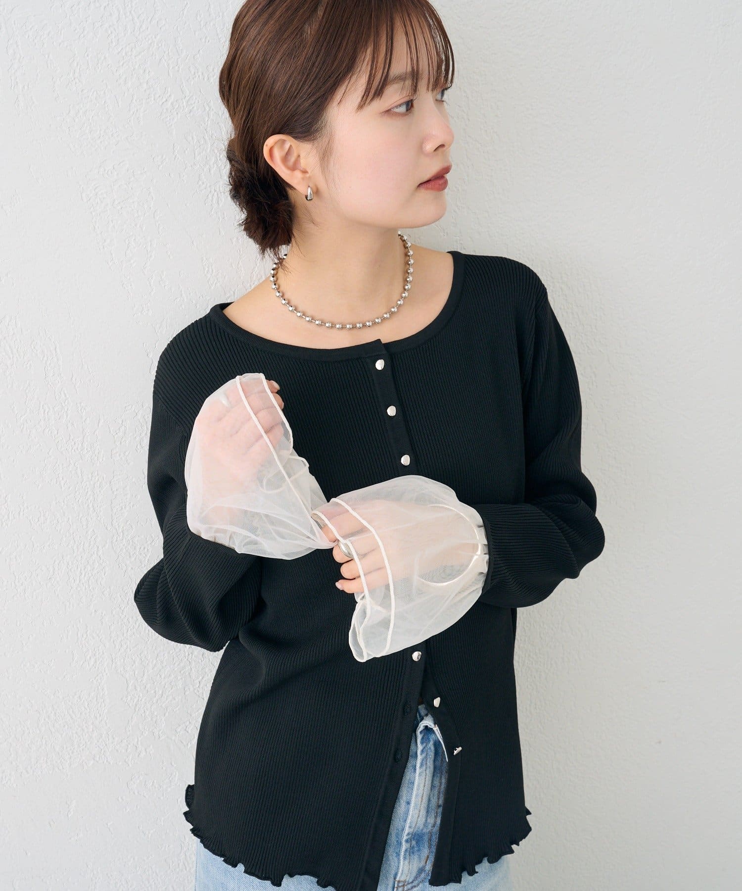 袖のチュールが華やかさをプラスするリブカーディガン