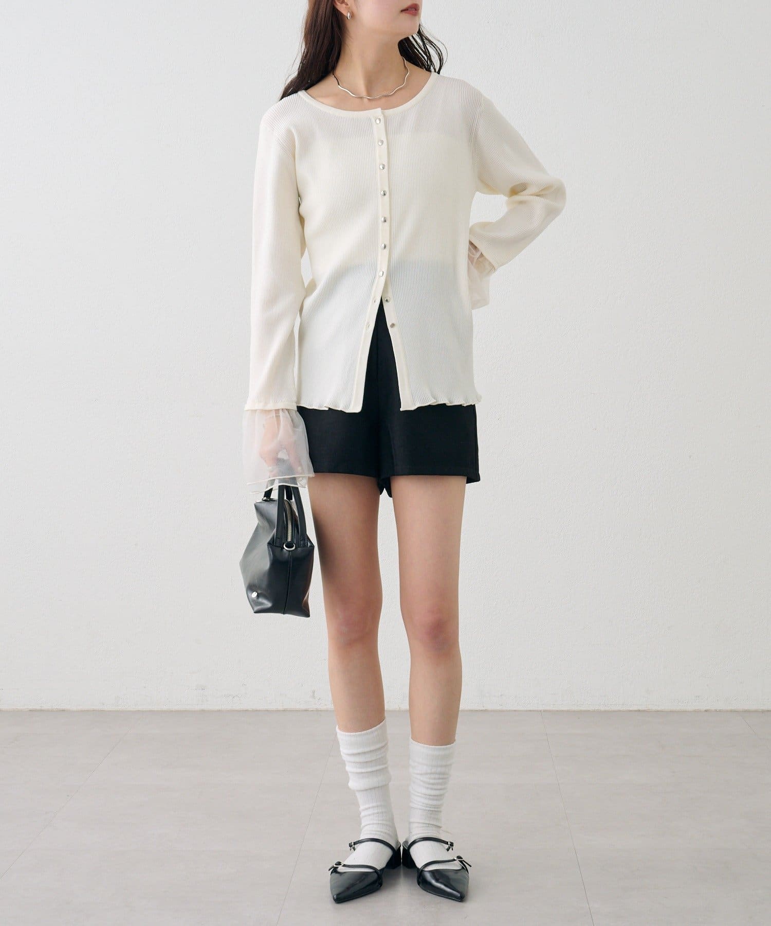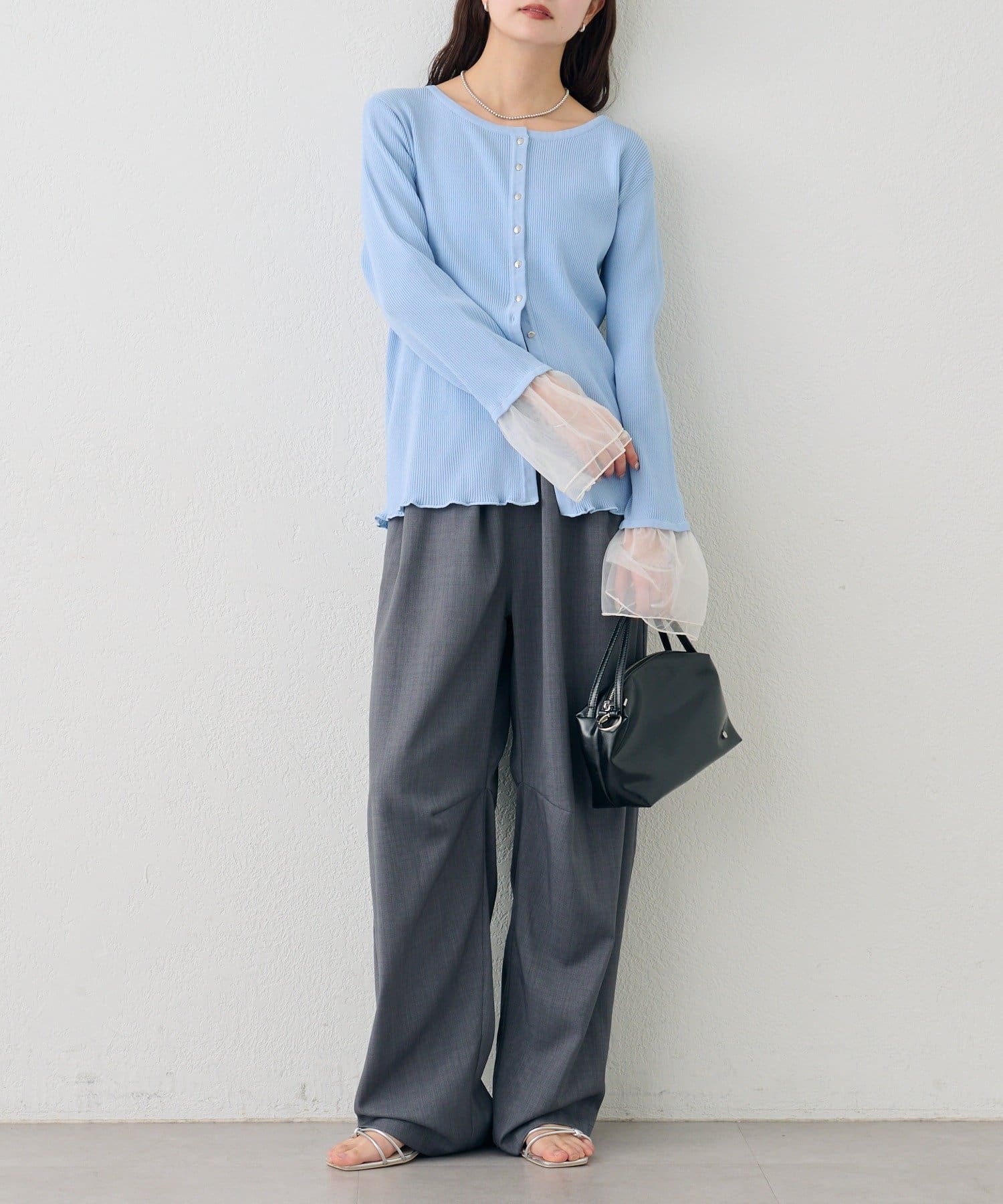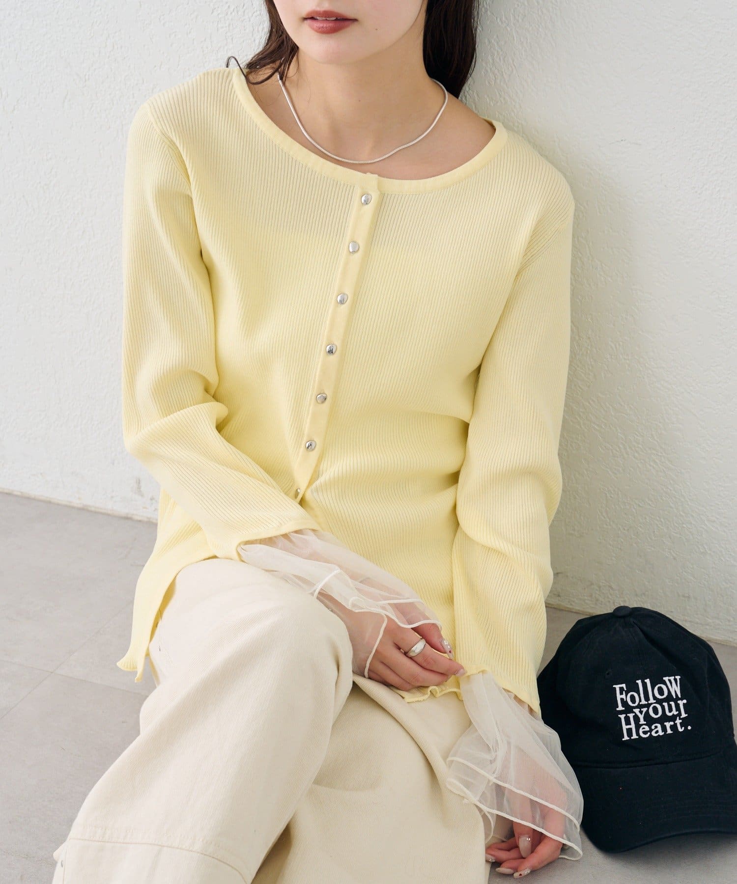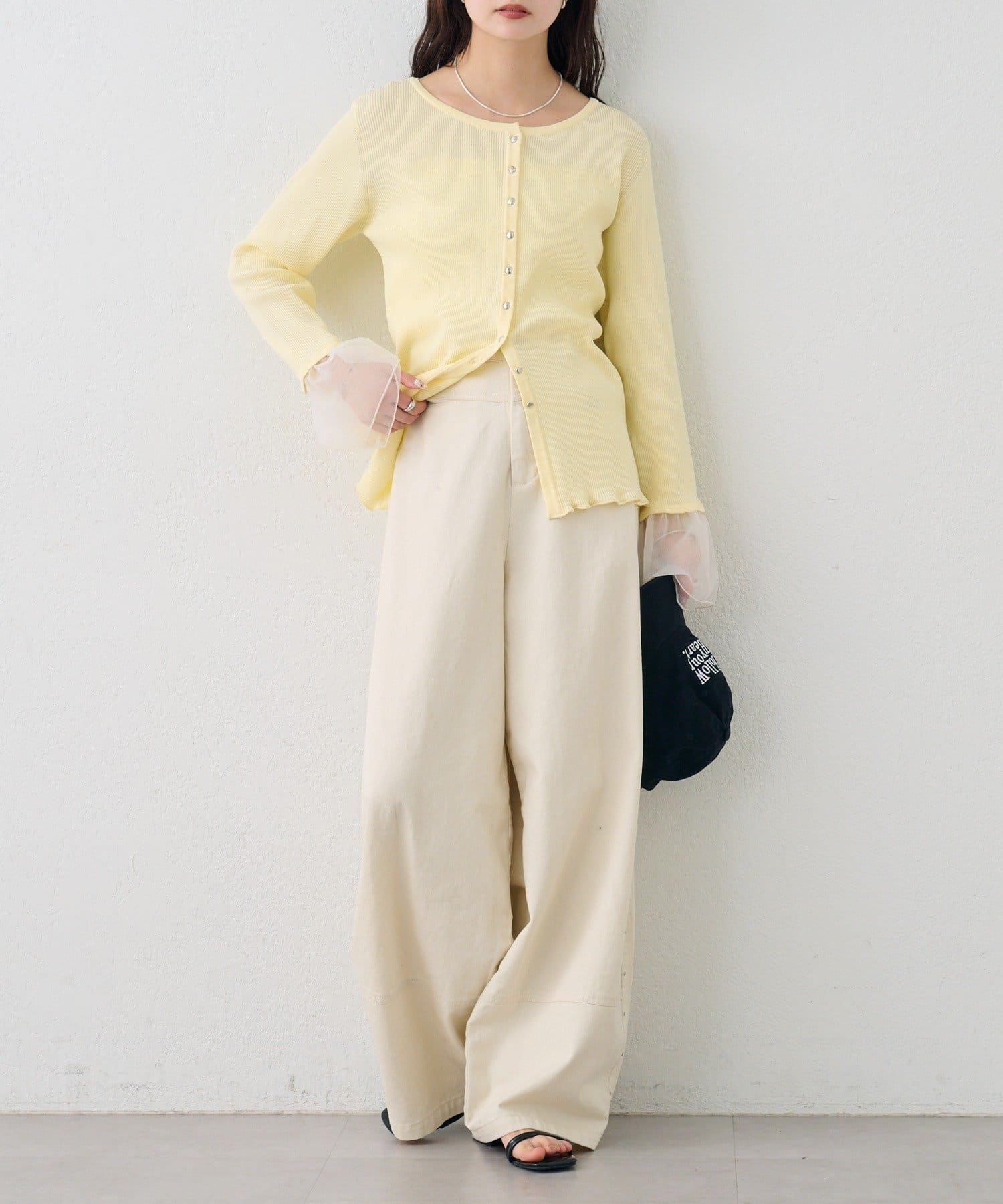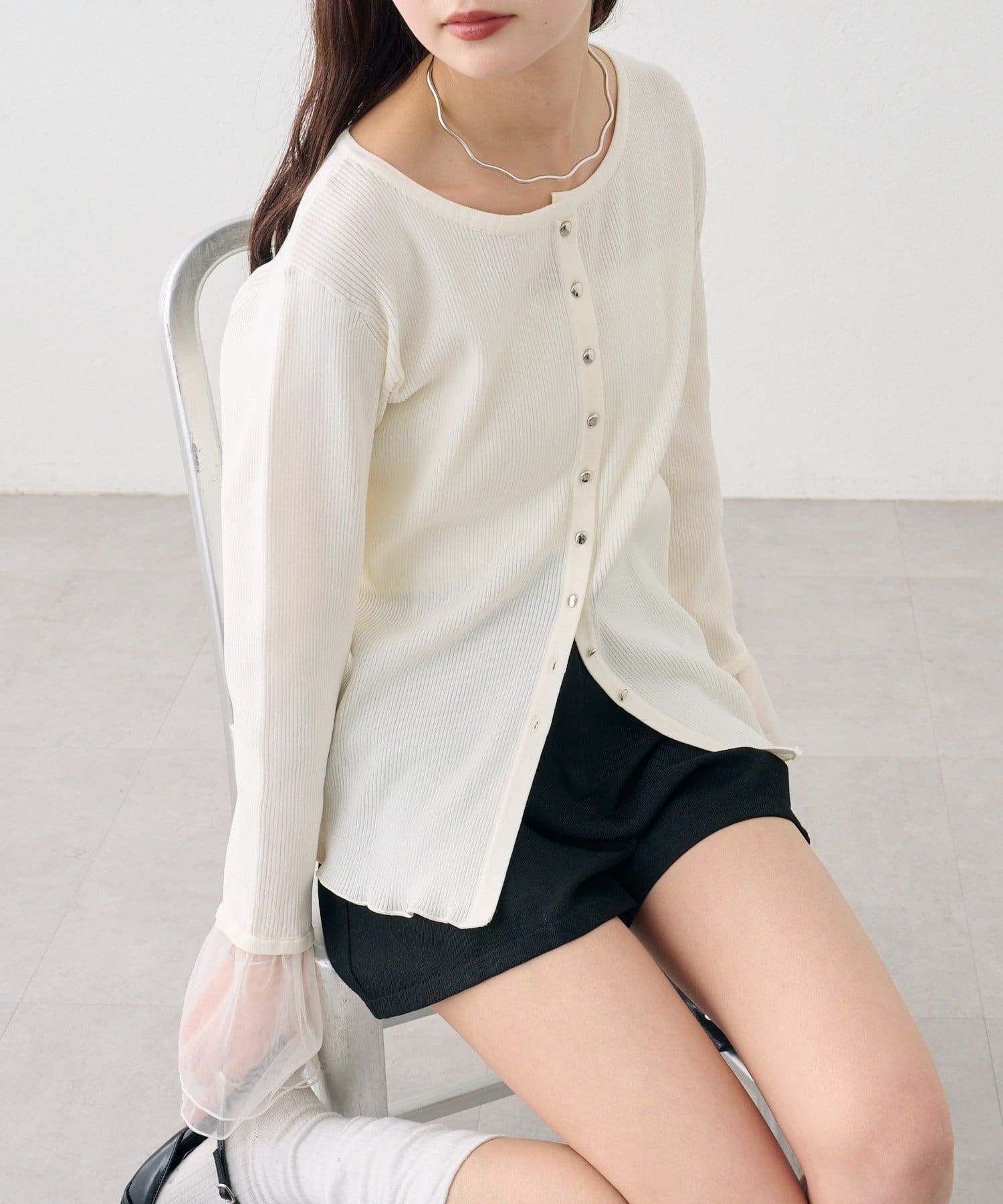 袖のチュールが華やかさをプラスするリブカーディガン