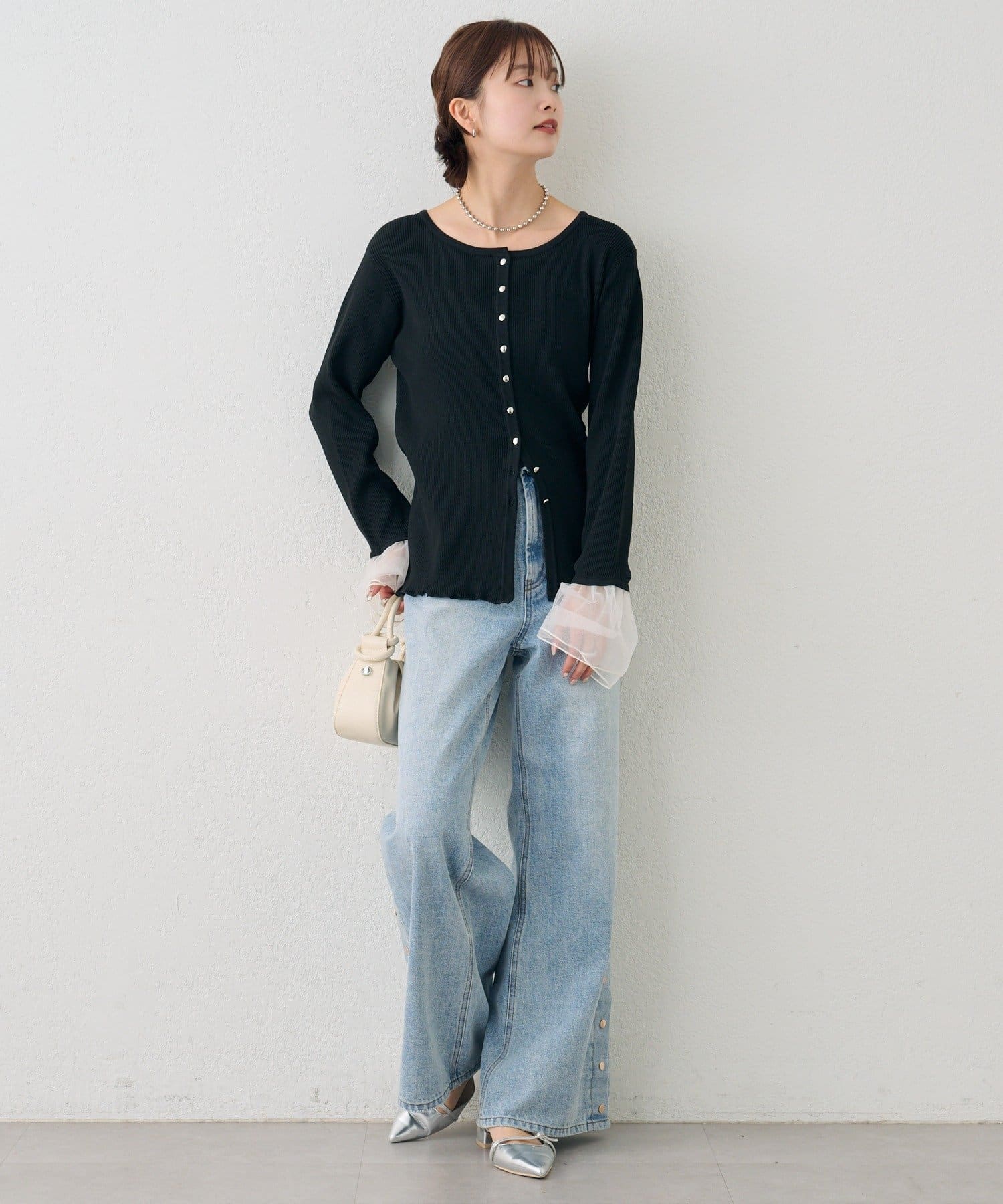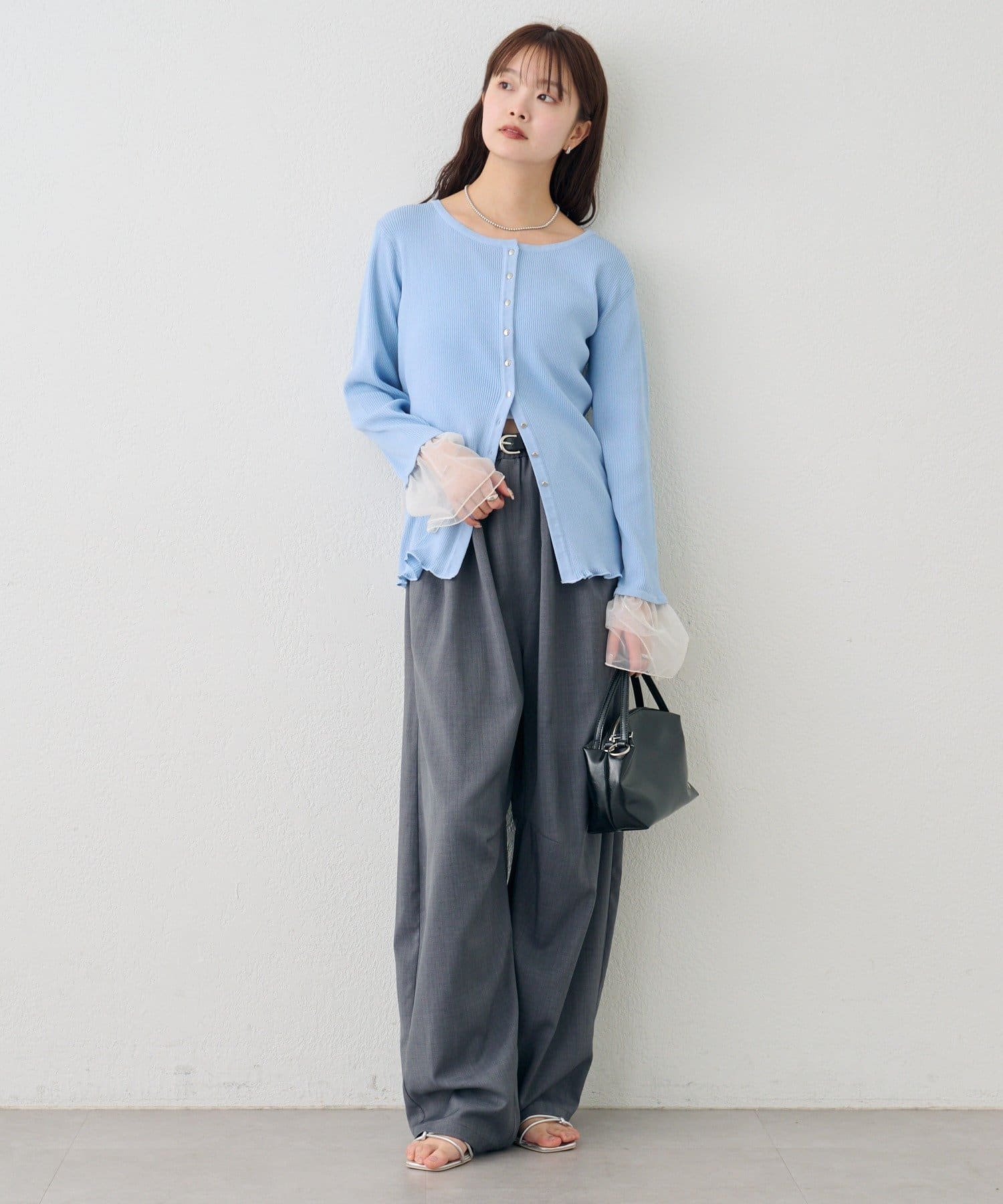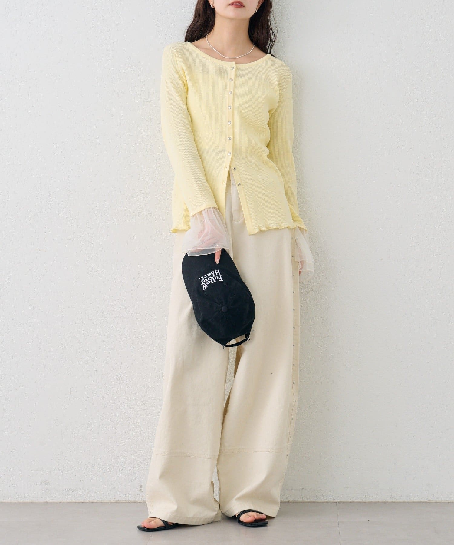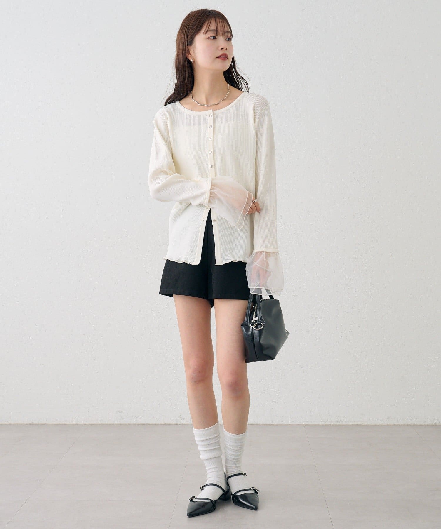 袖のチュールが華やかさをプラスするリブカーディガン