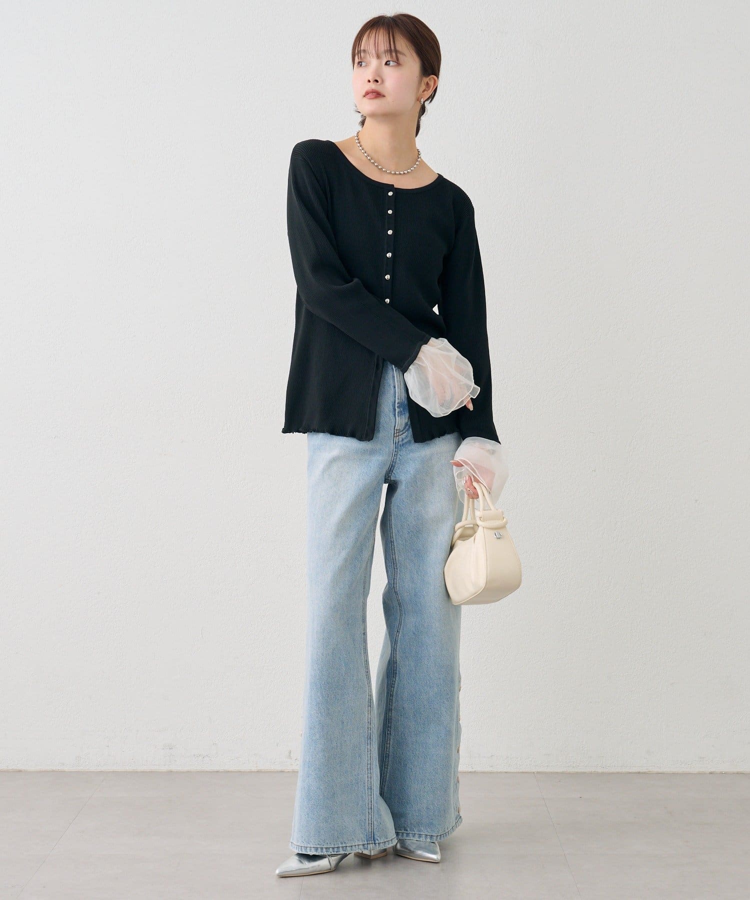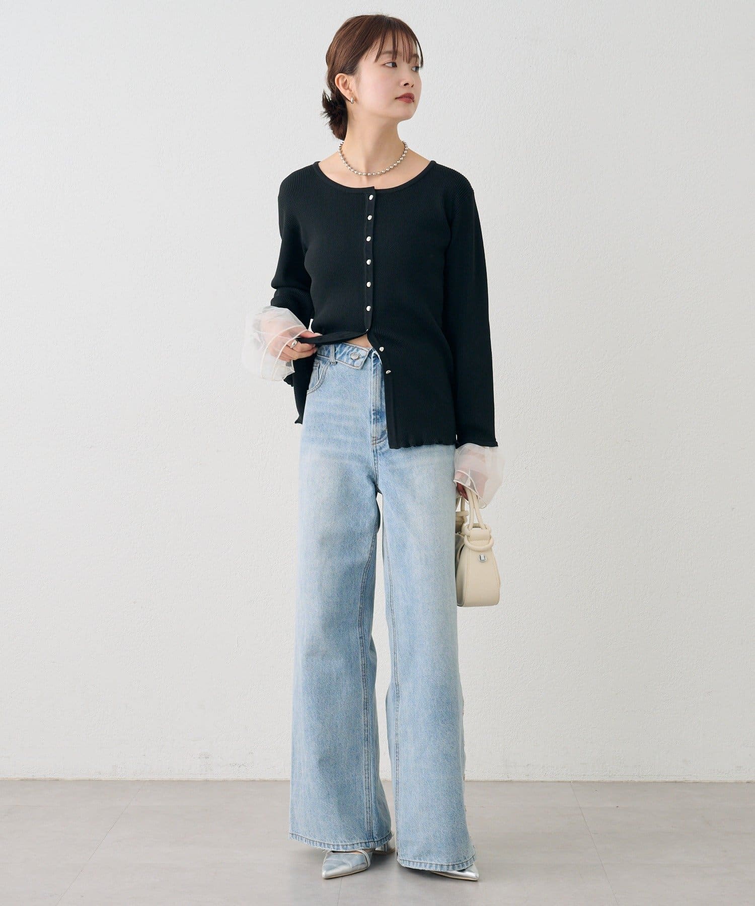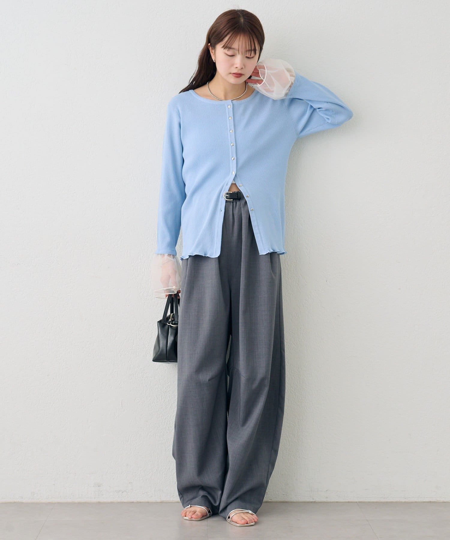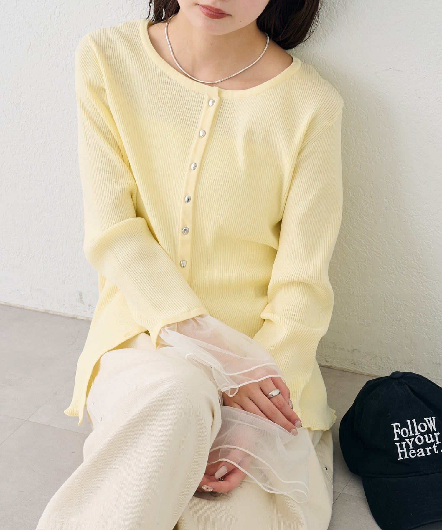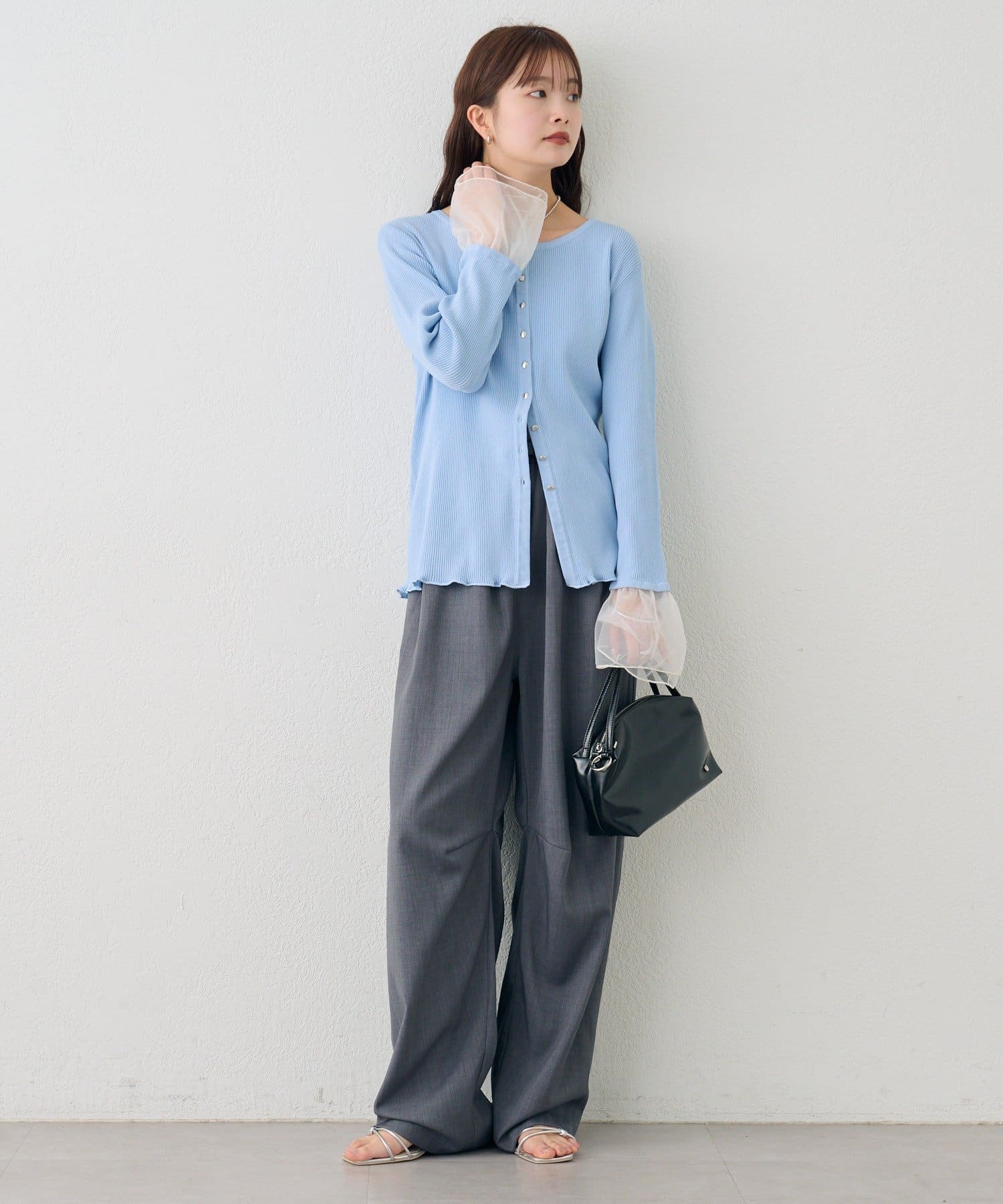 袖のチュールが華やかさをプラスするリブカーディガン