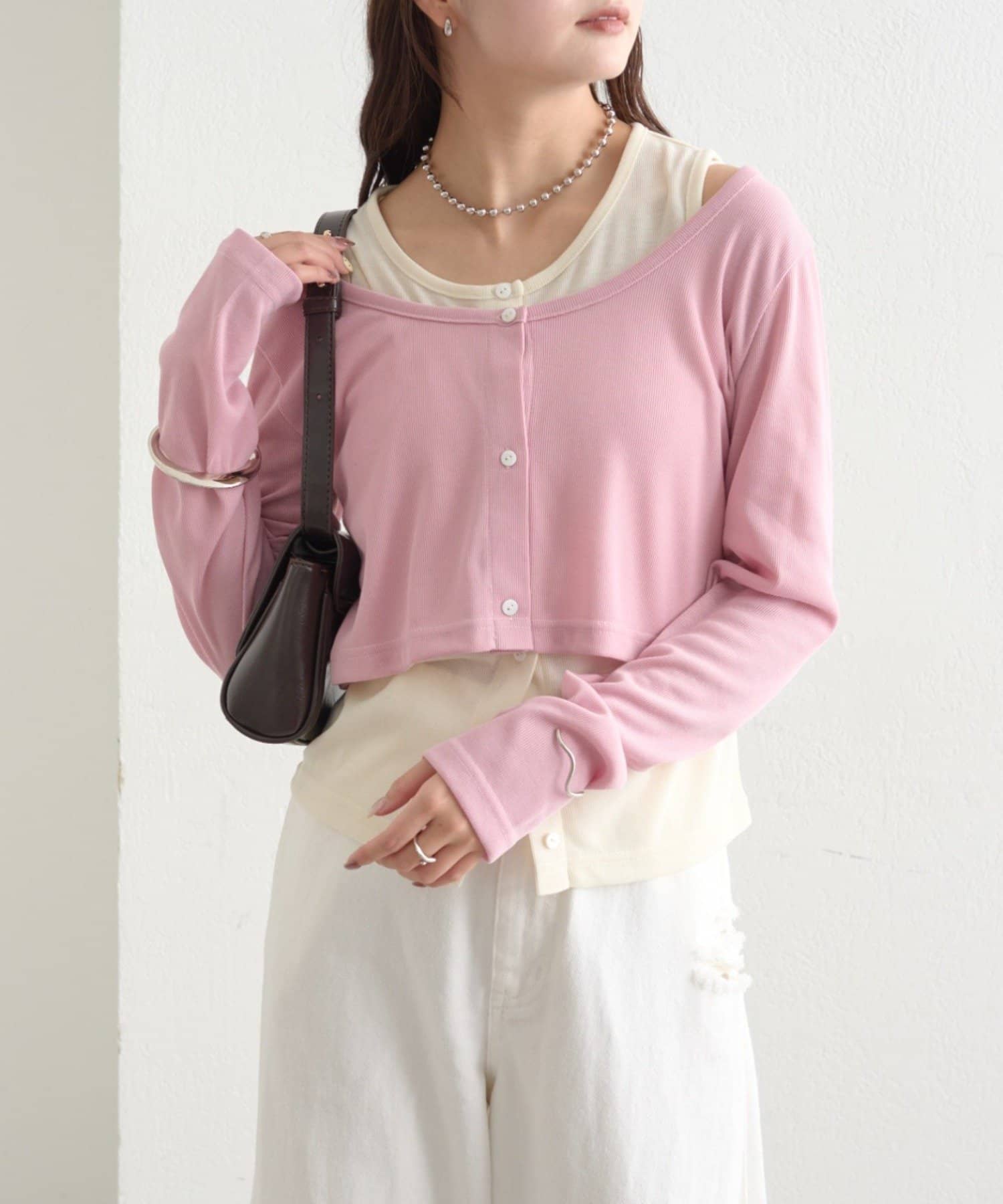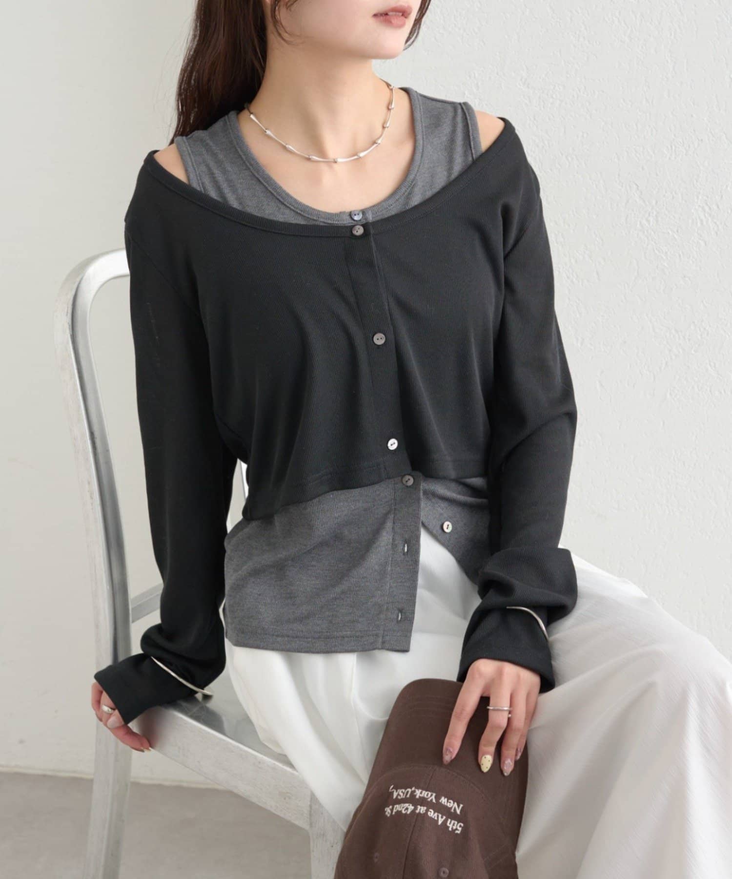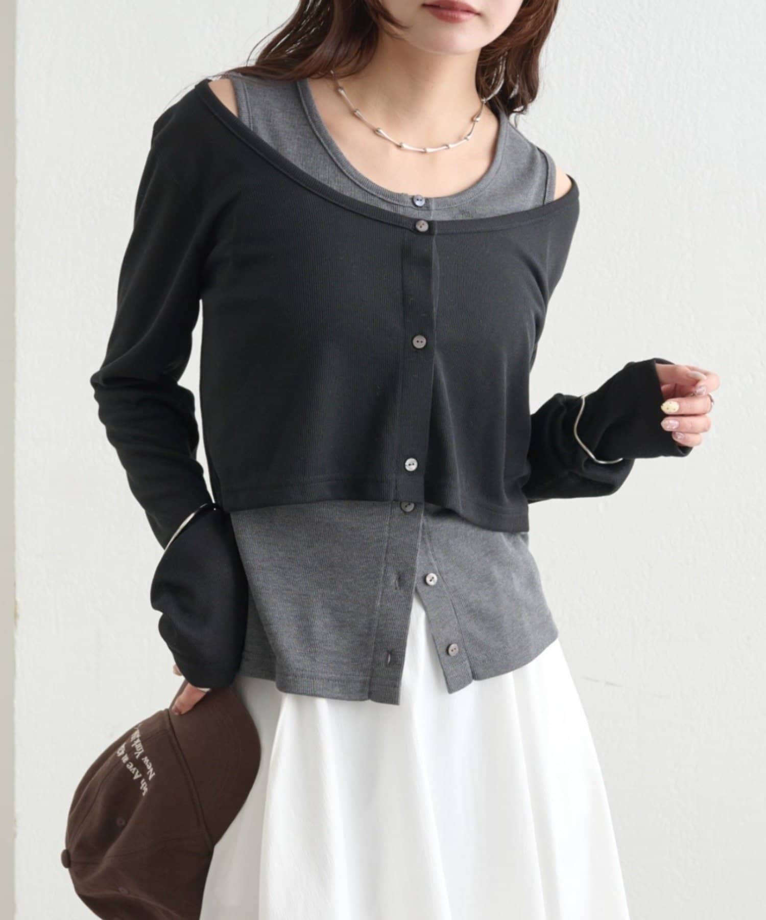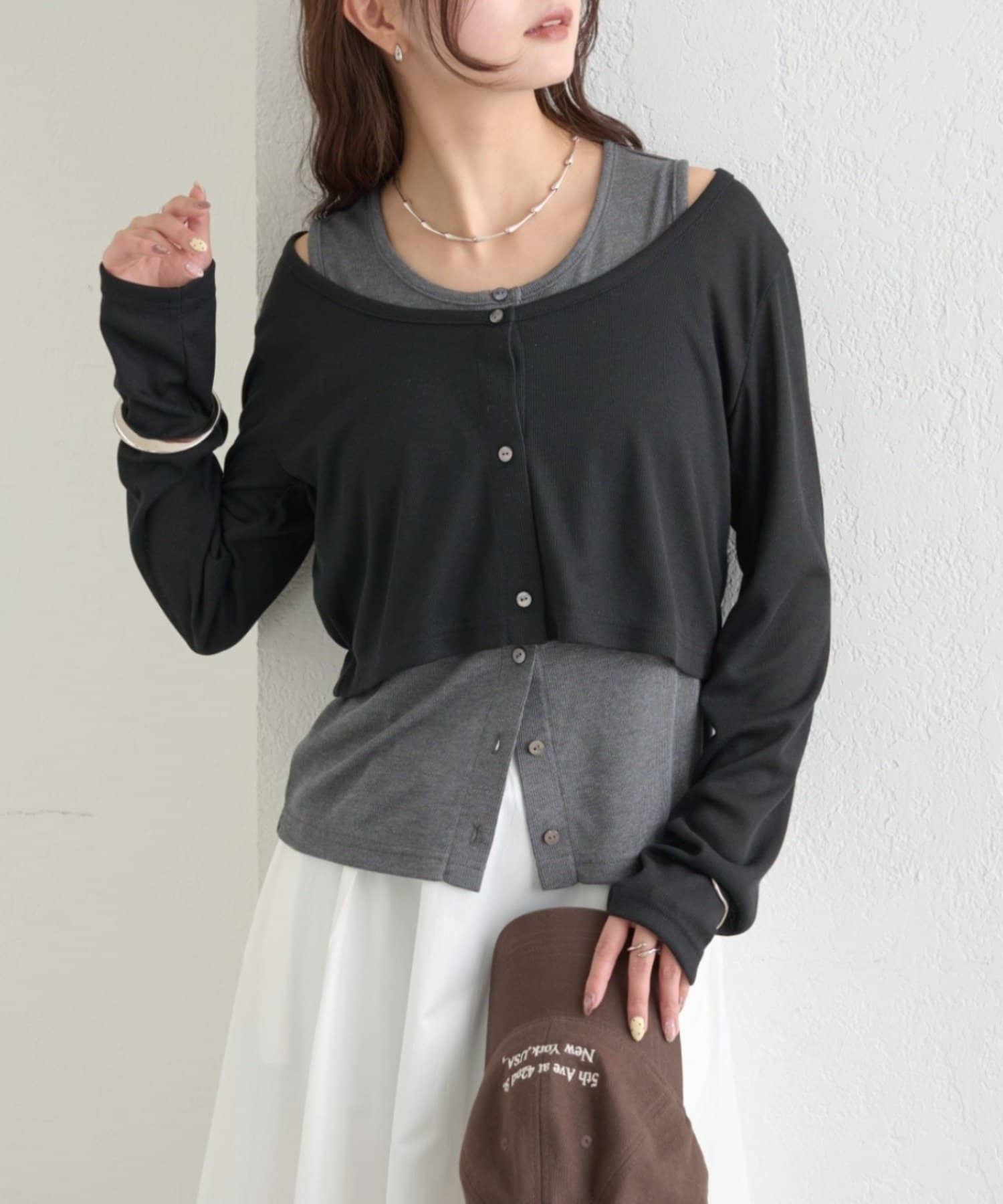 ・配色のインナーを合わせたレイヤードトップスで、簡単にこなれ感を演出してくれます。