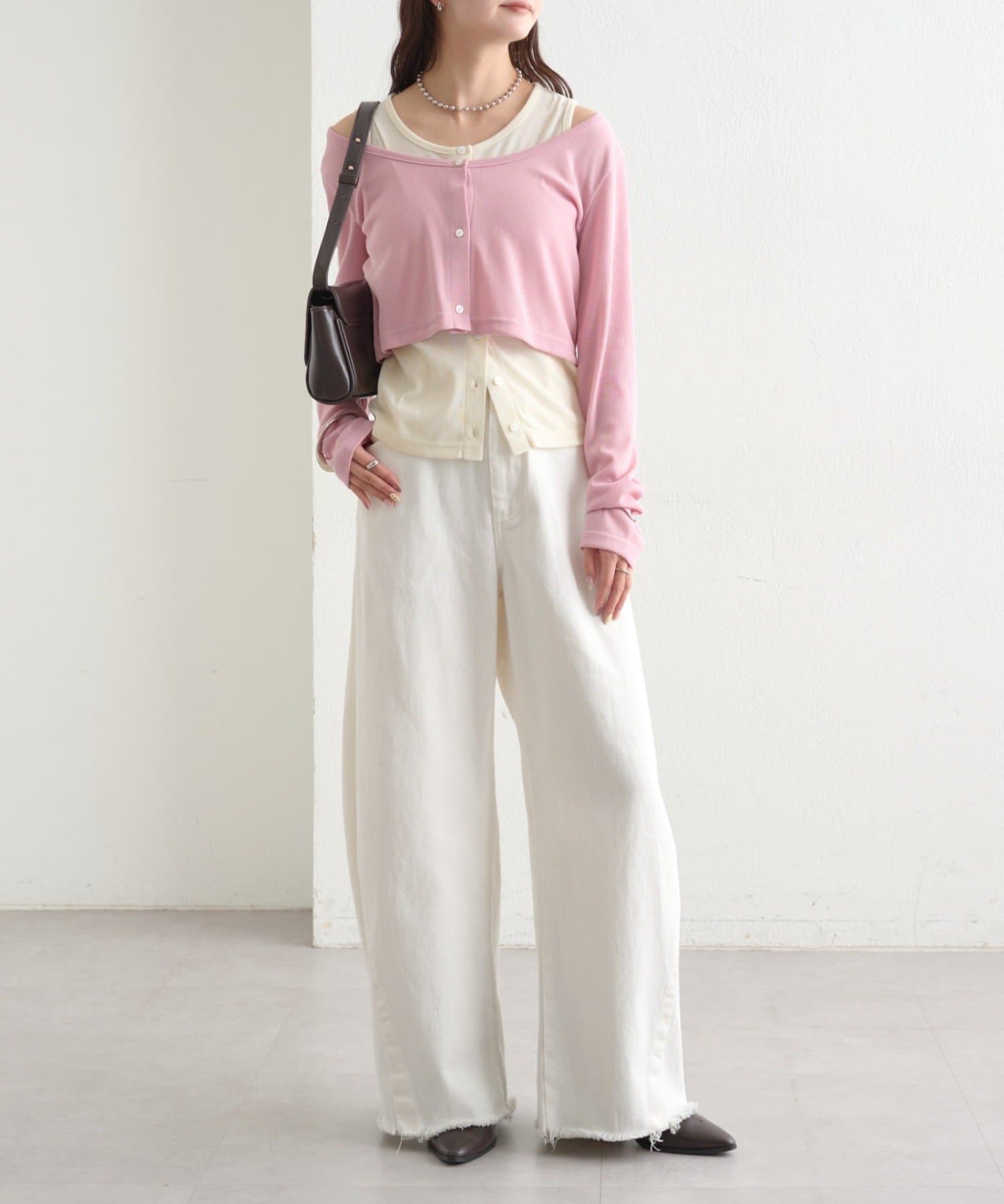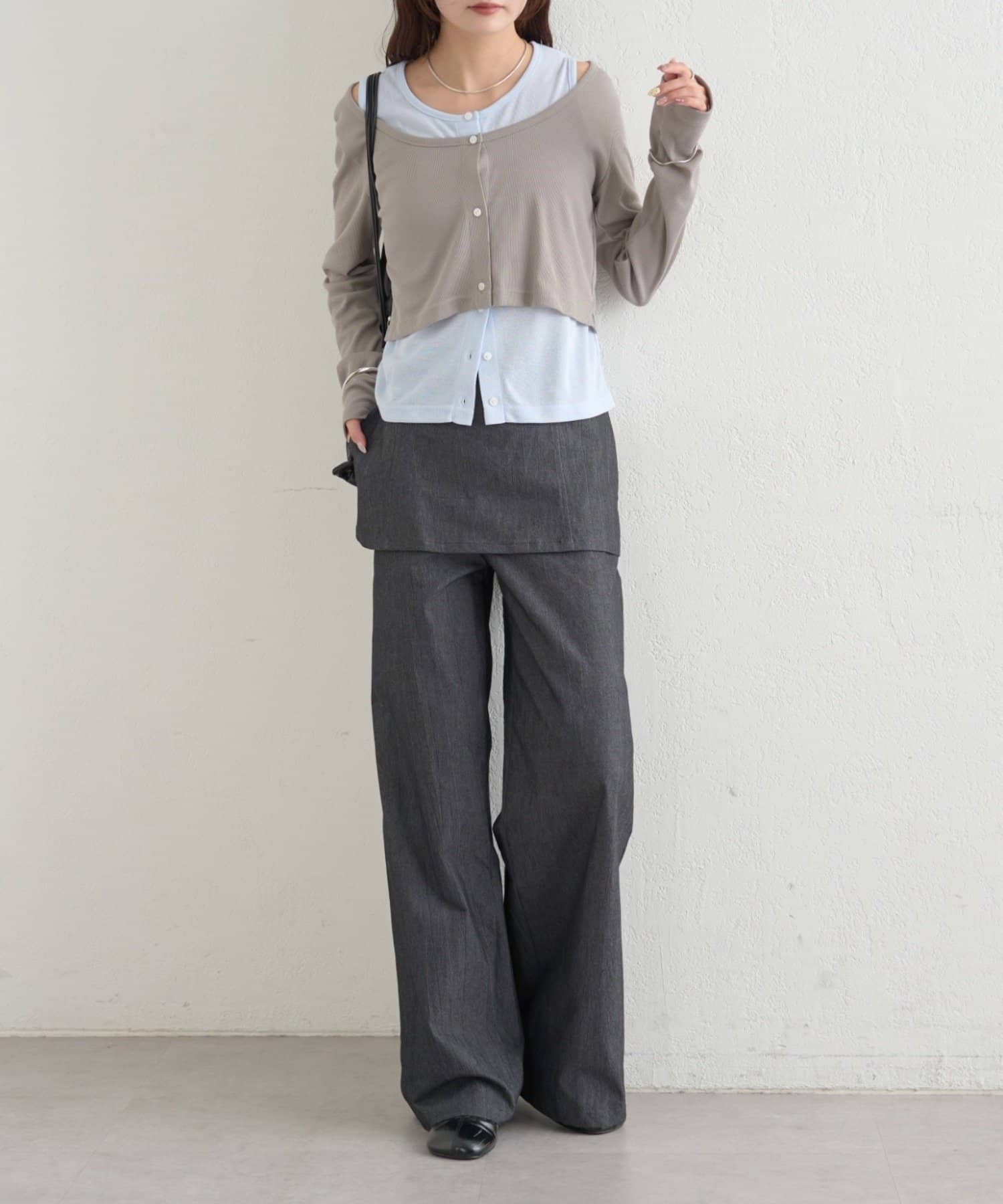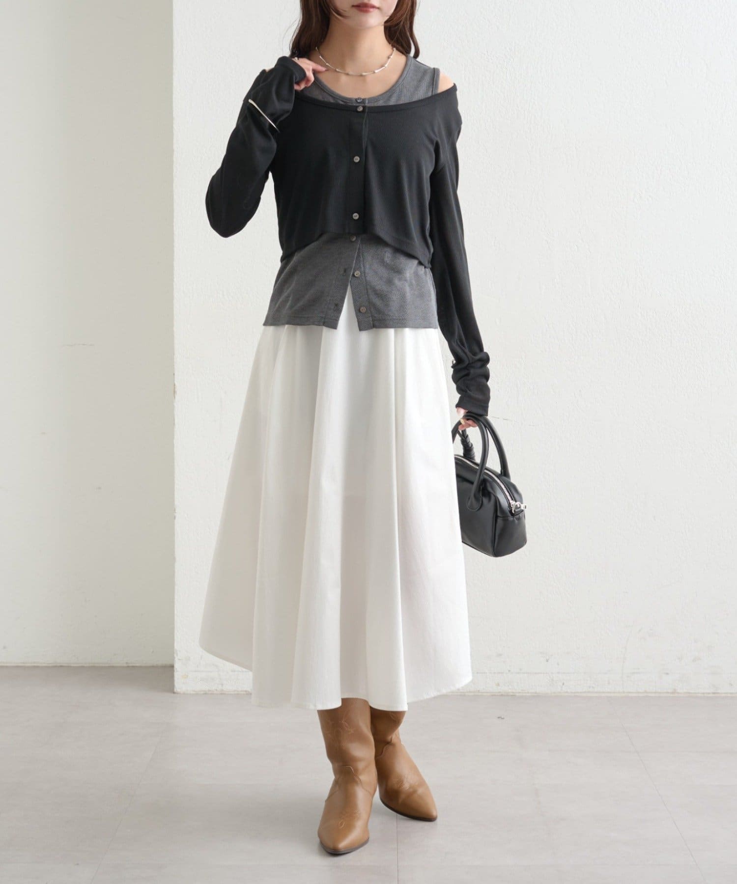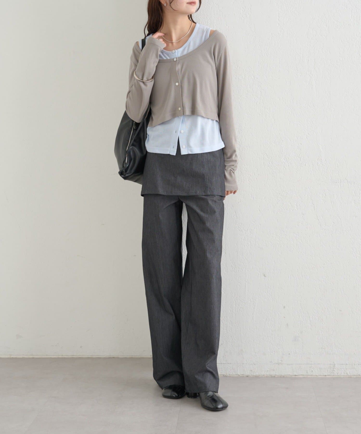 ・シンプルなボトム合わせでも、レイヤードデザインがスタイリングの主役になります。