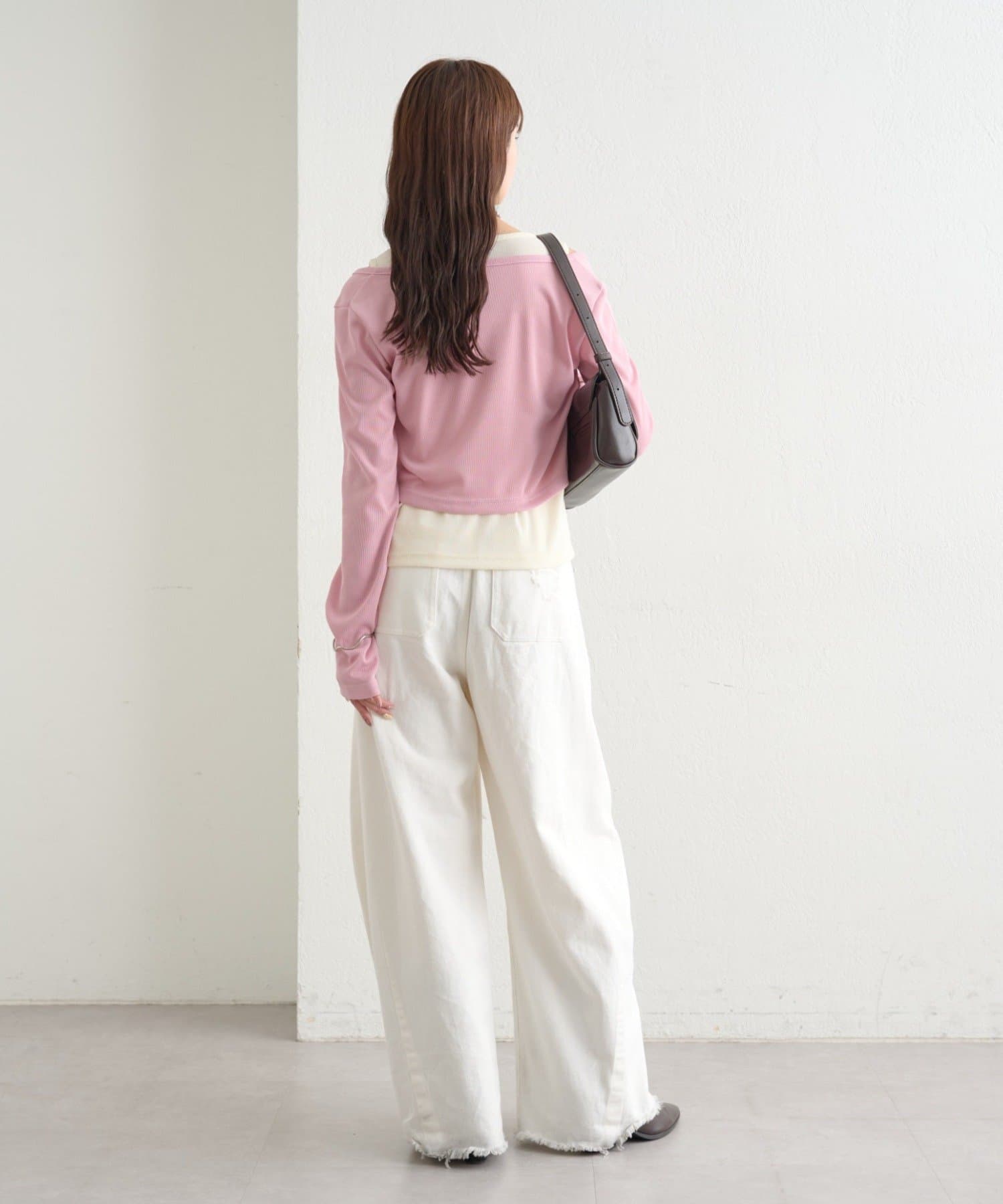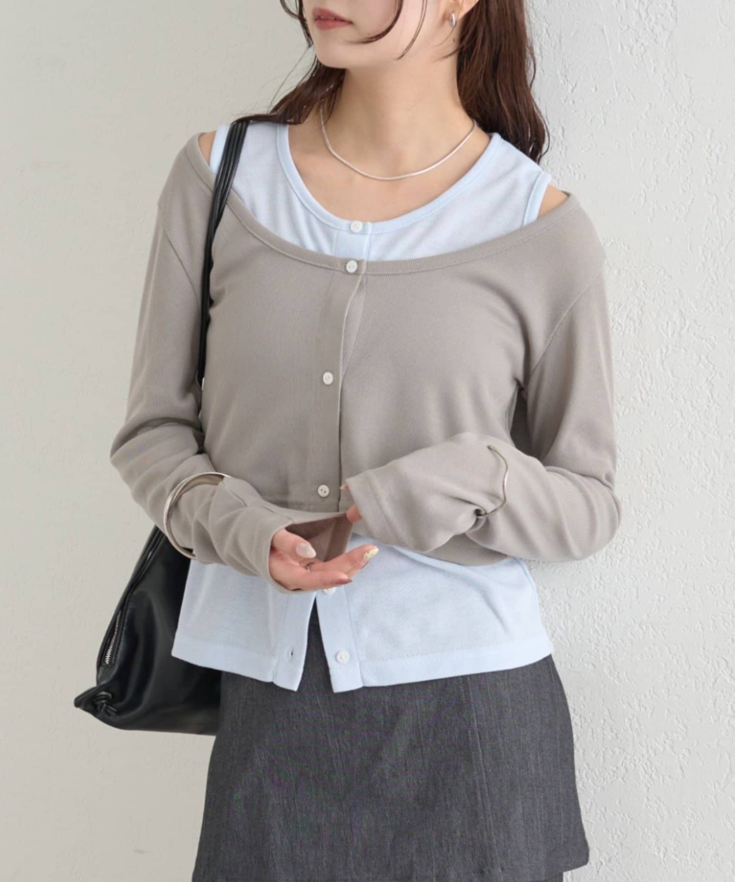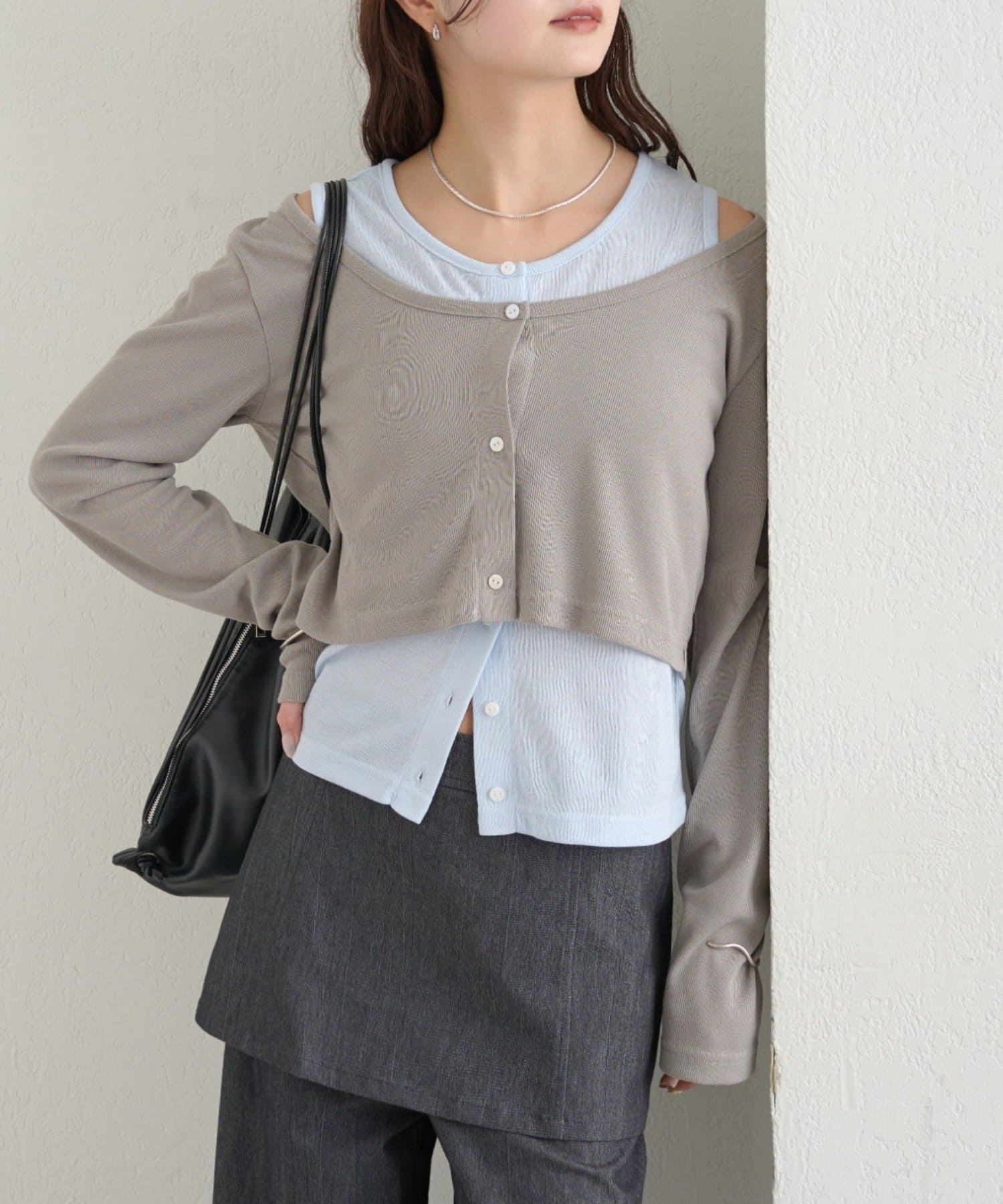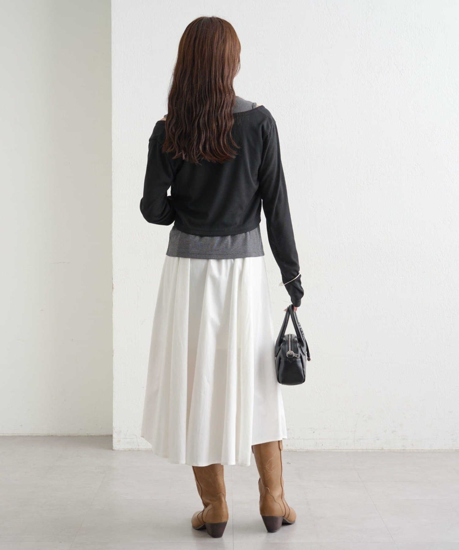 ・シンプルなボトム合わせでも、レイヤードデザインがスタイリングの主役になります。