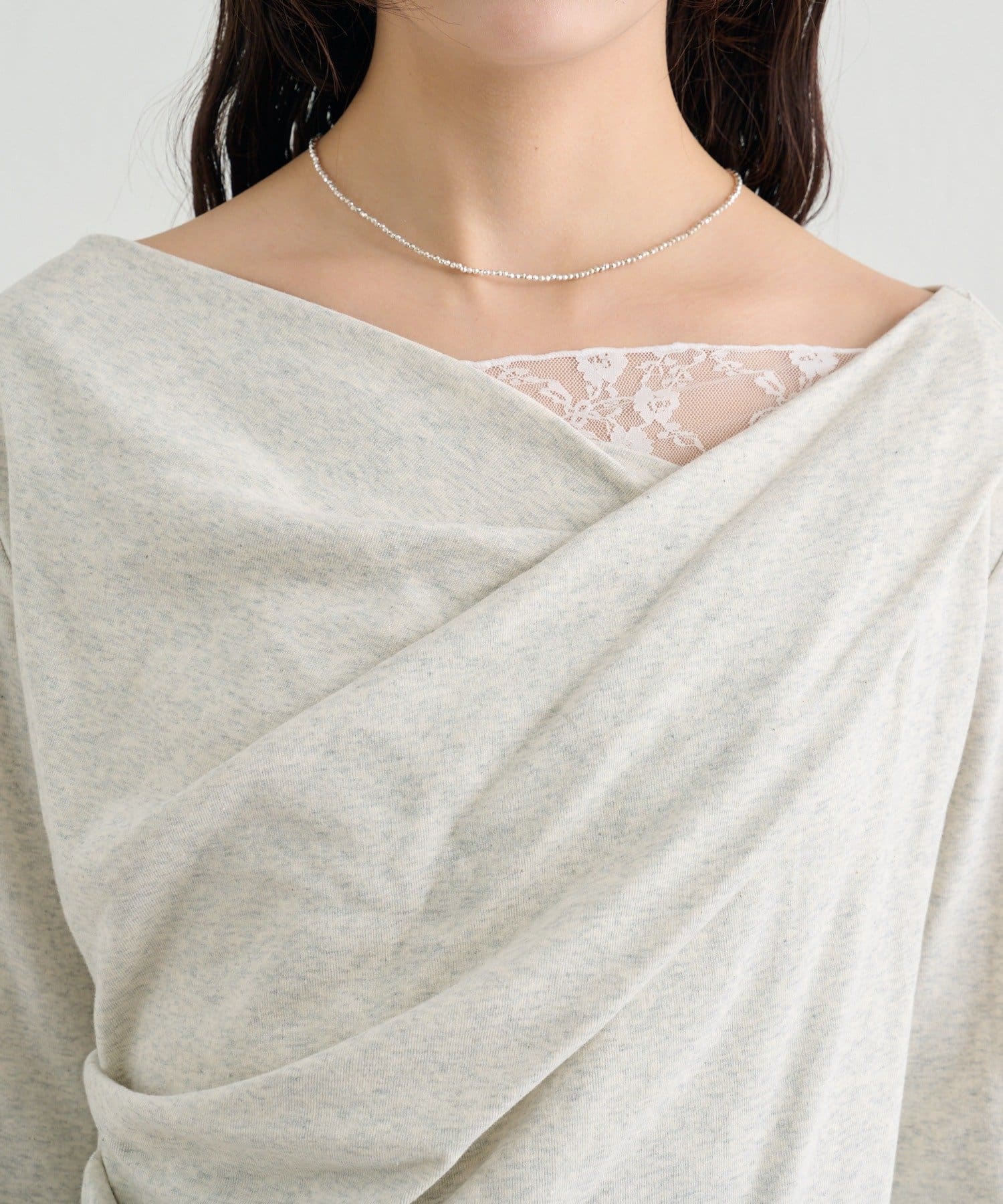 ・デコルテラインにレースがドッキングした、さりげない肌見せが叶うオフショル仕様。