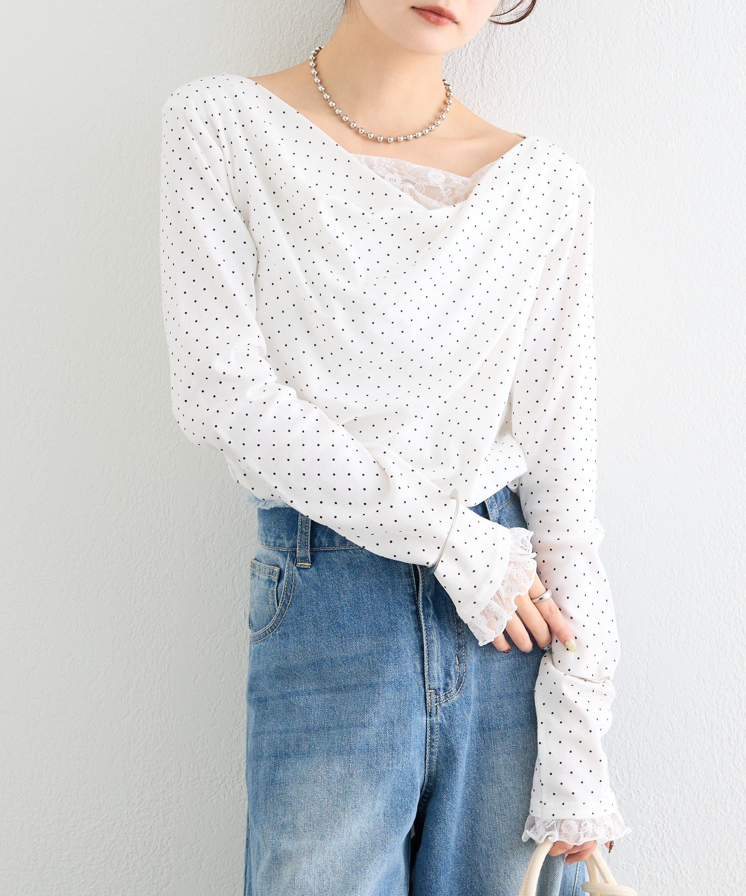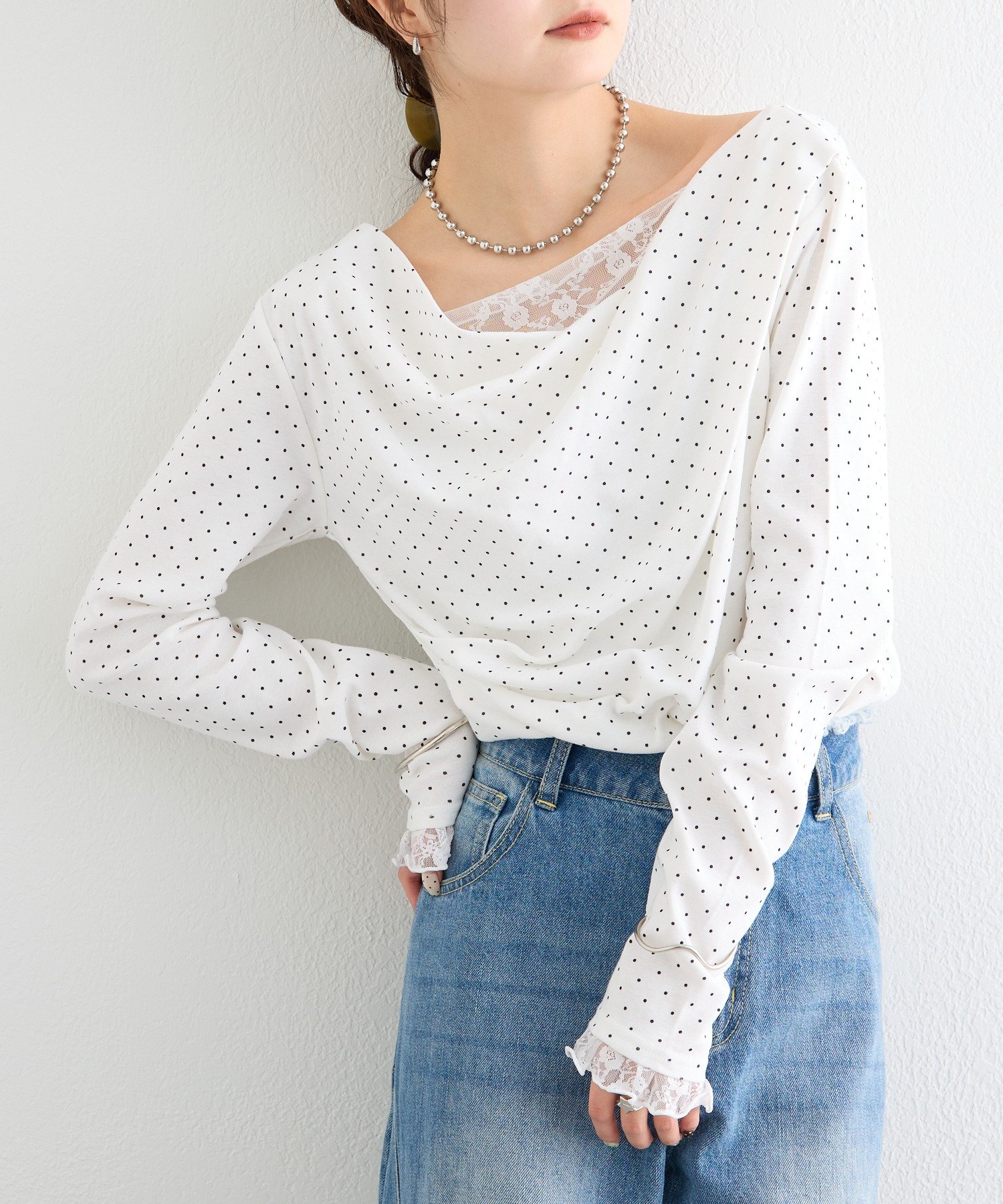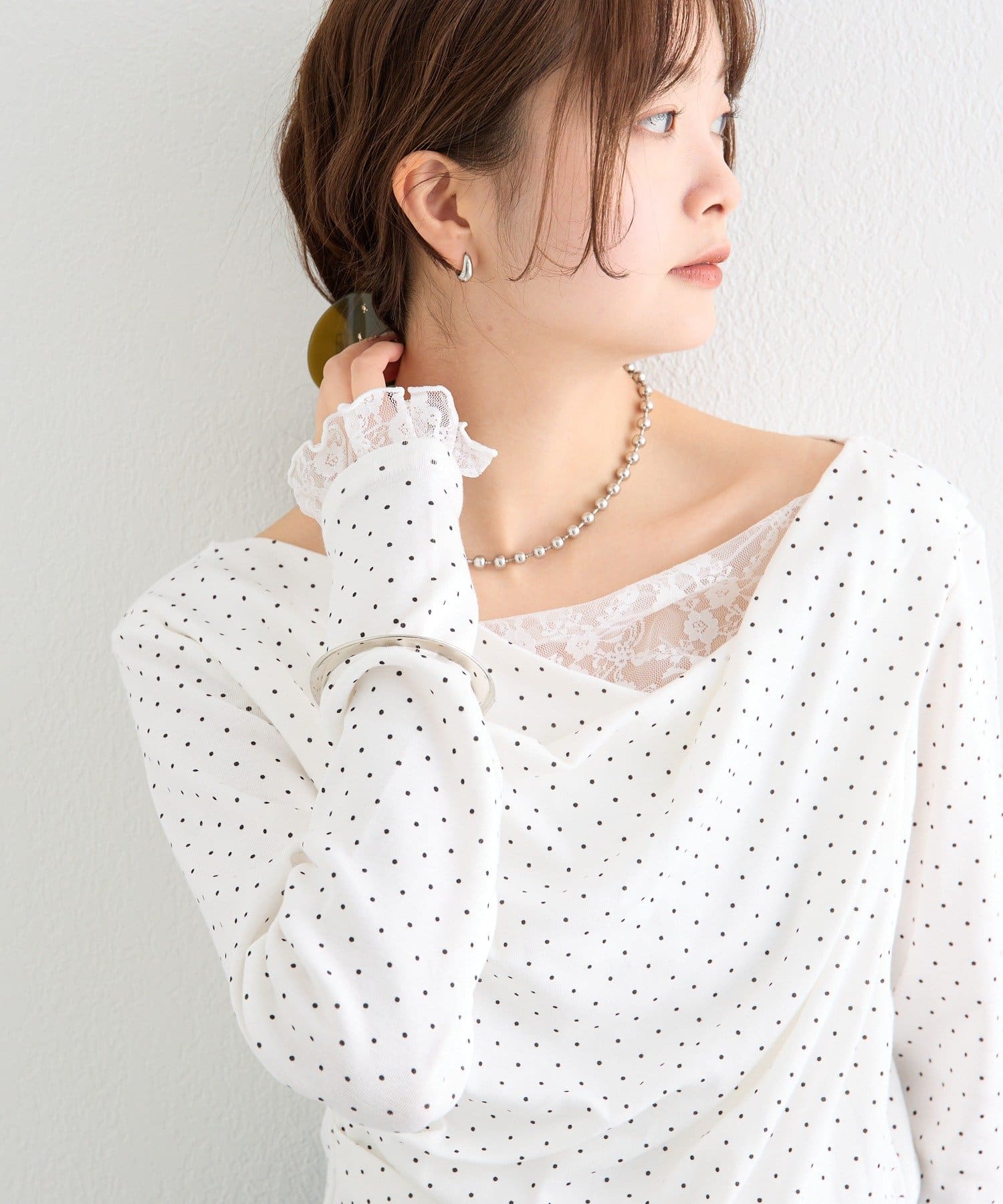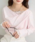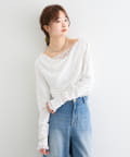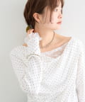 《新色WHTドット》【一枚で簡単に決まる】レースドッキングオフショルロンT