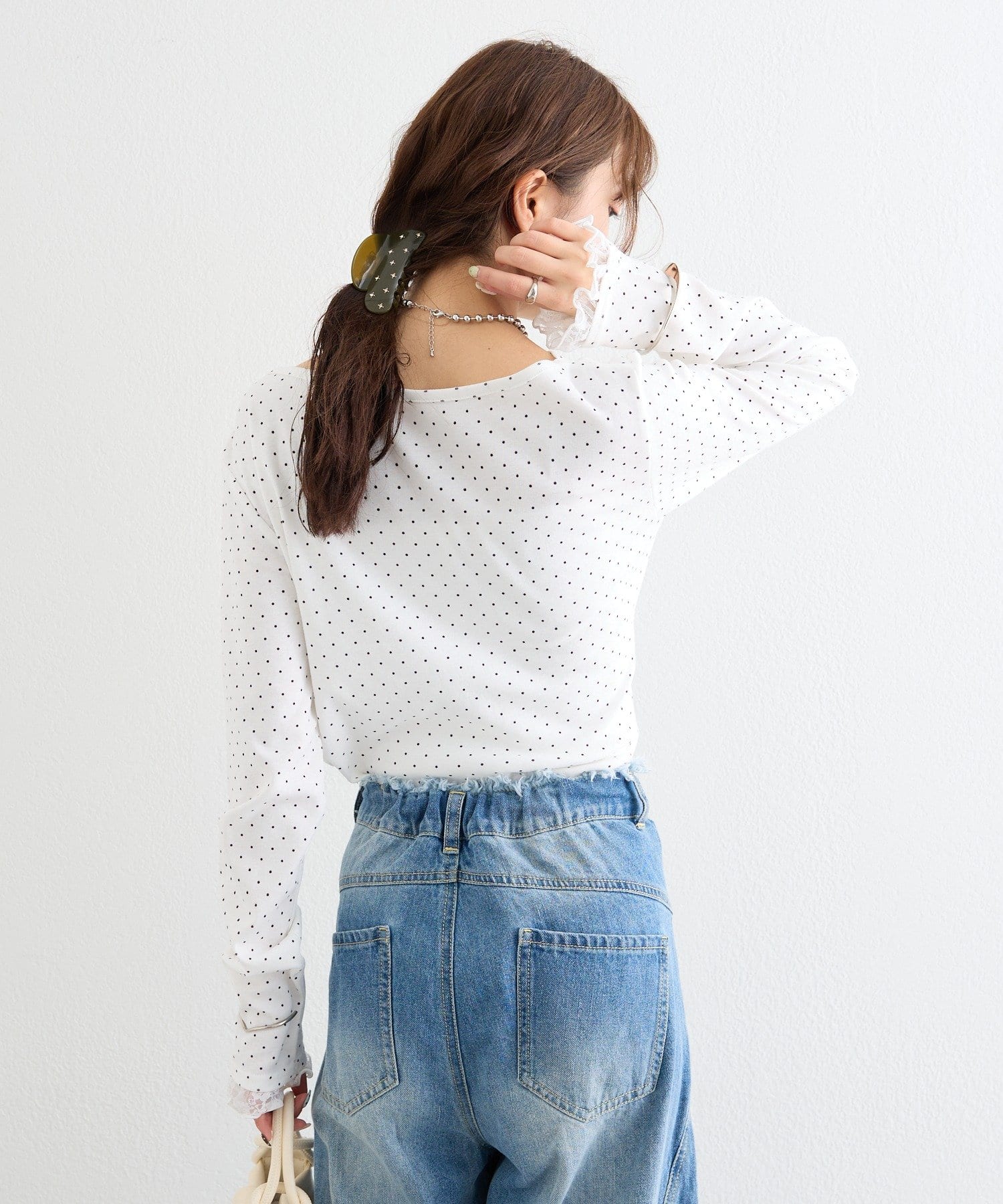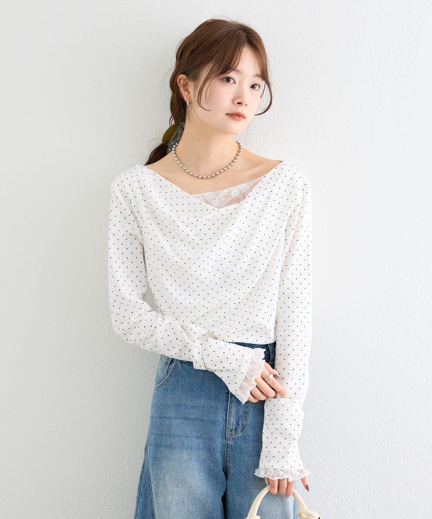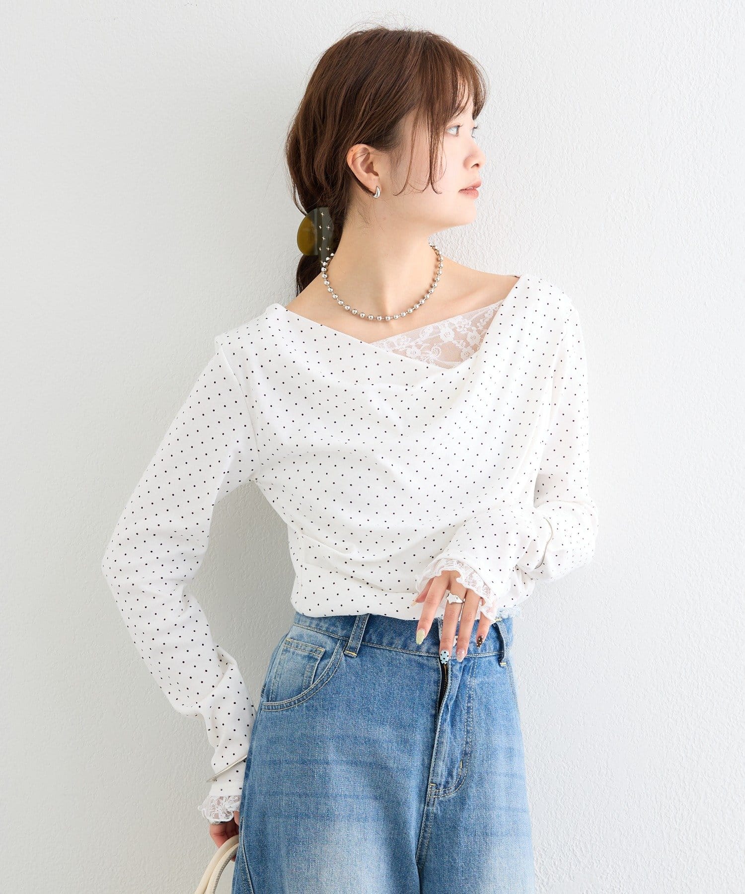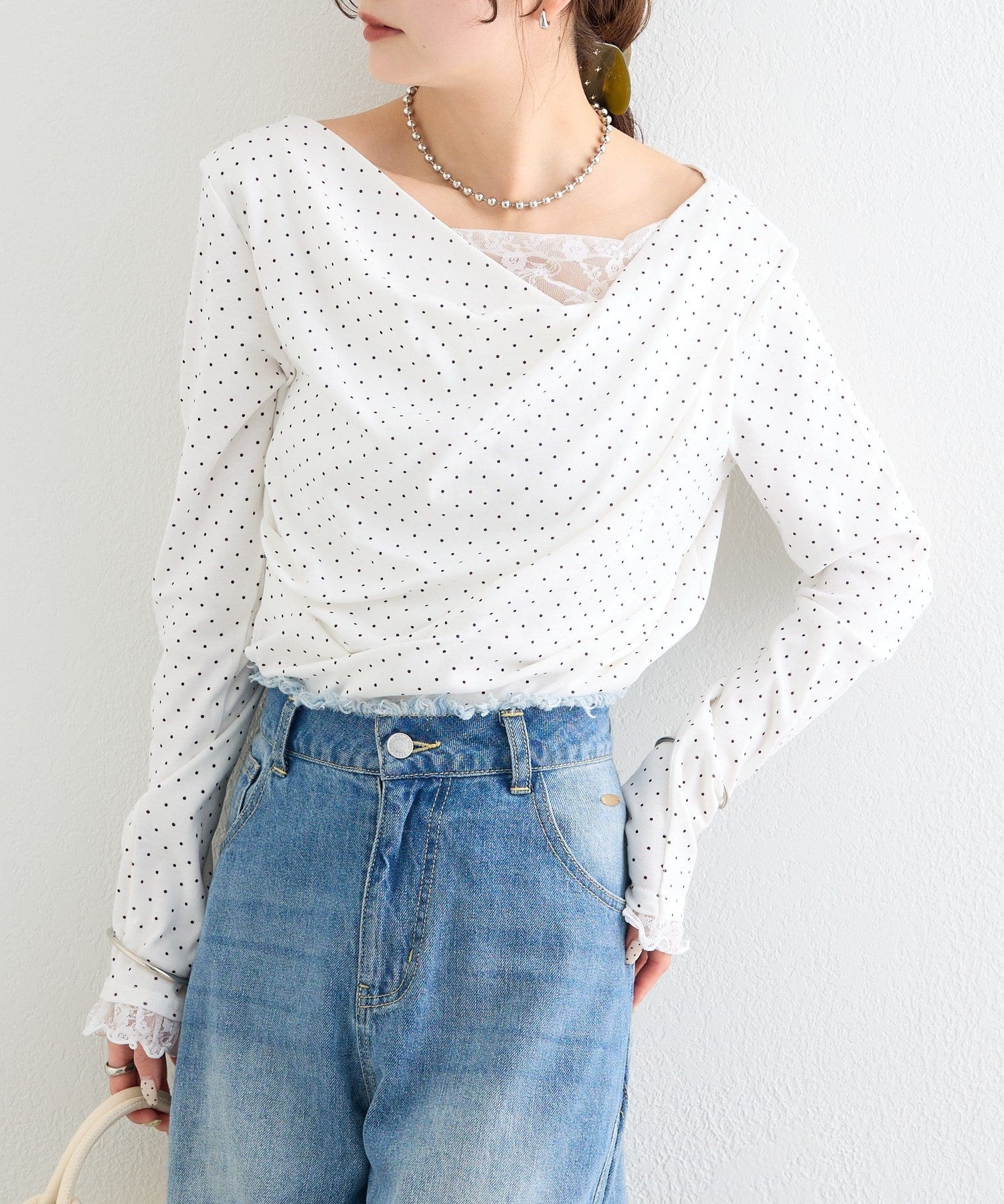 《新色WHTドット》【一枚で簡単に決まる】レースドッキングオフショルロンT