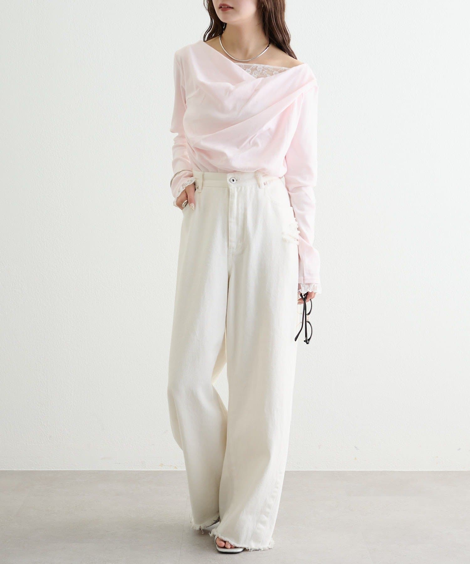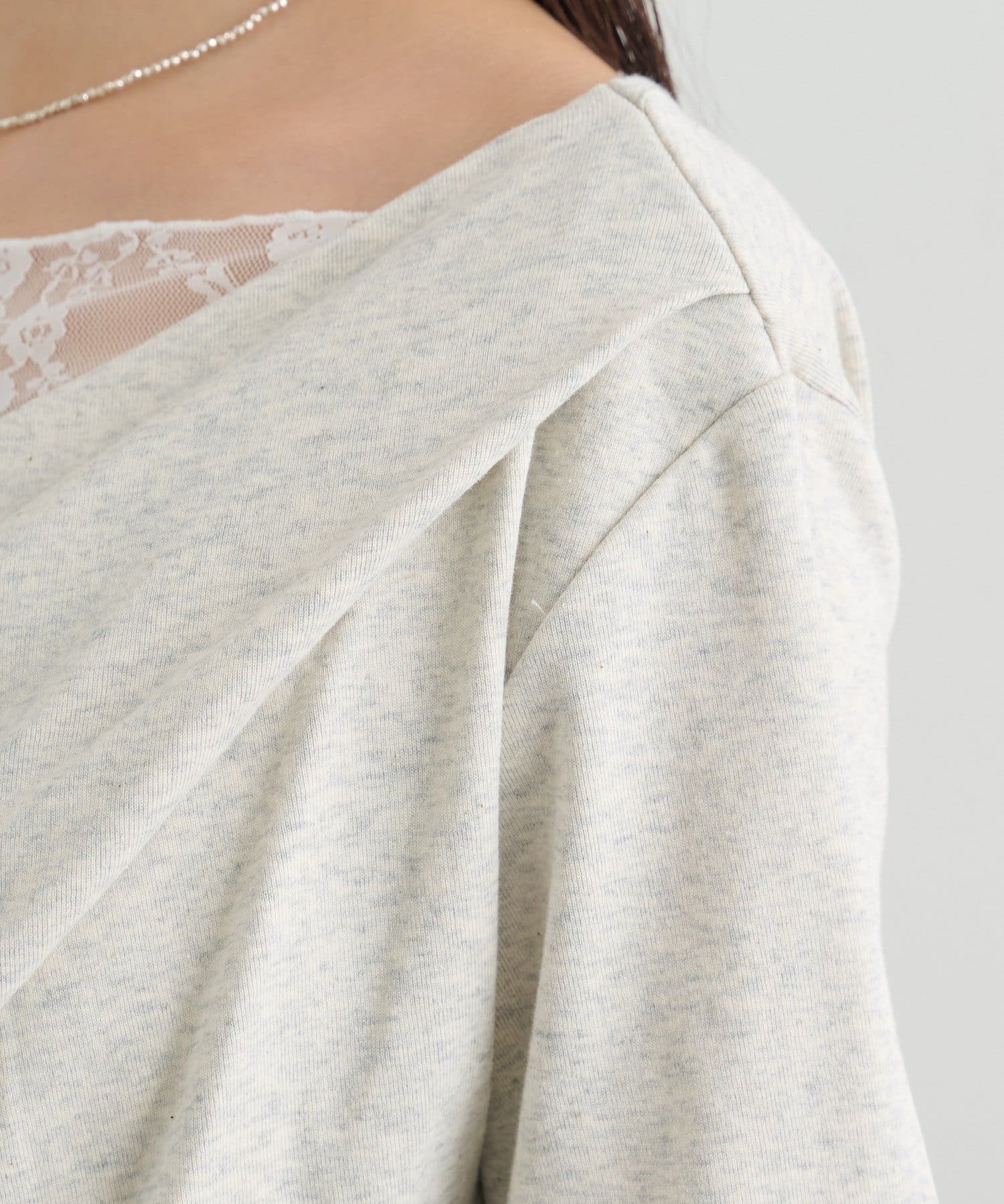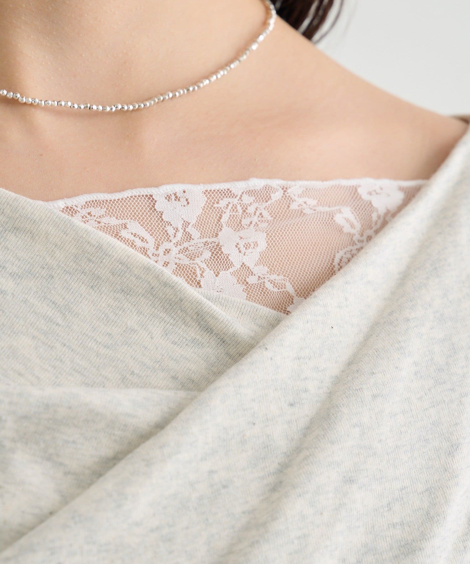 ・デコルテラインにレースがドッキングした、さりげない肌見せが叶うオフショル仕様。