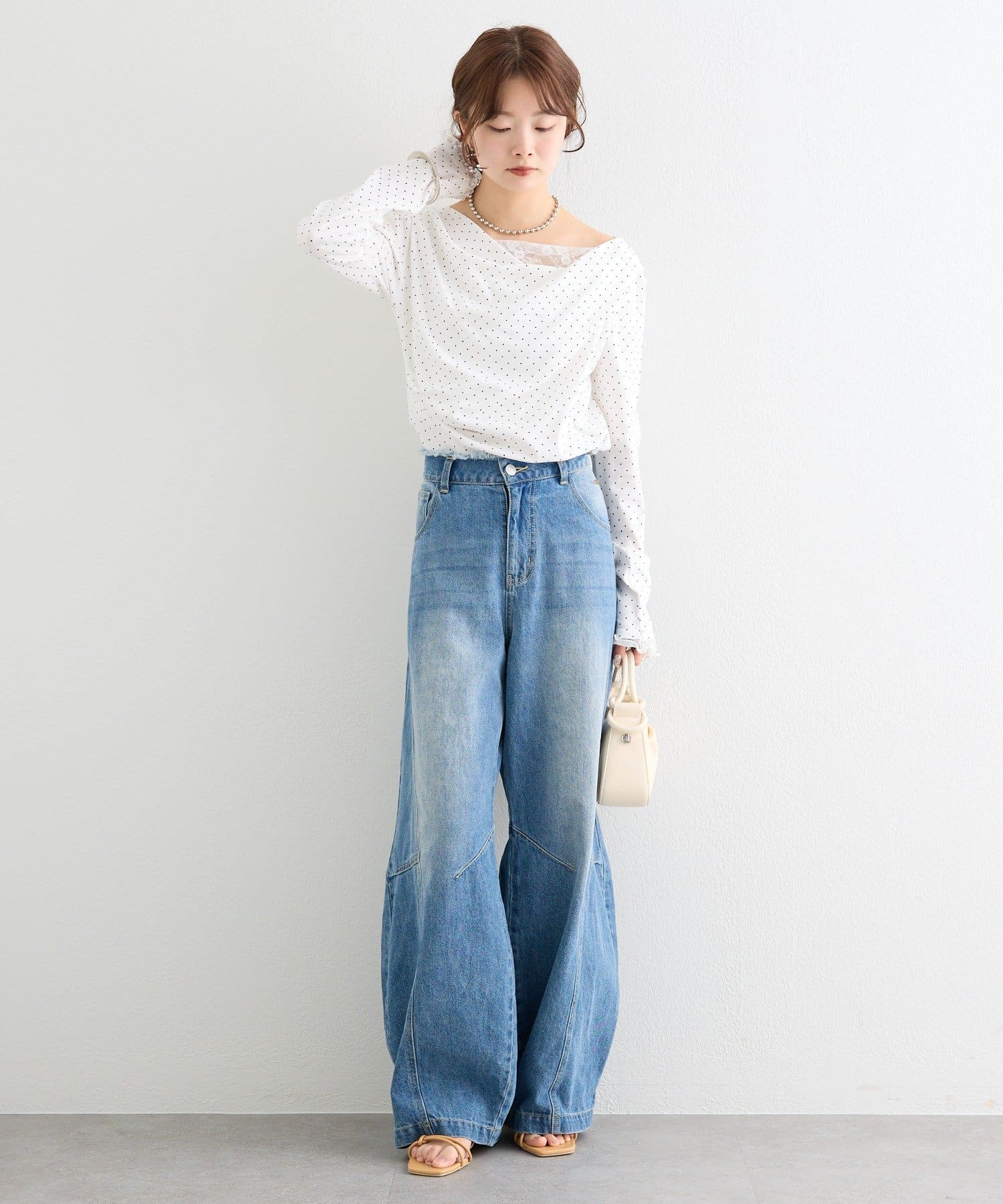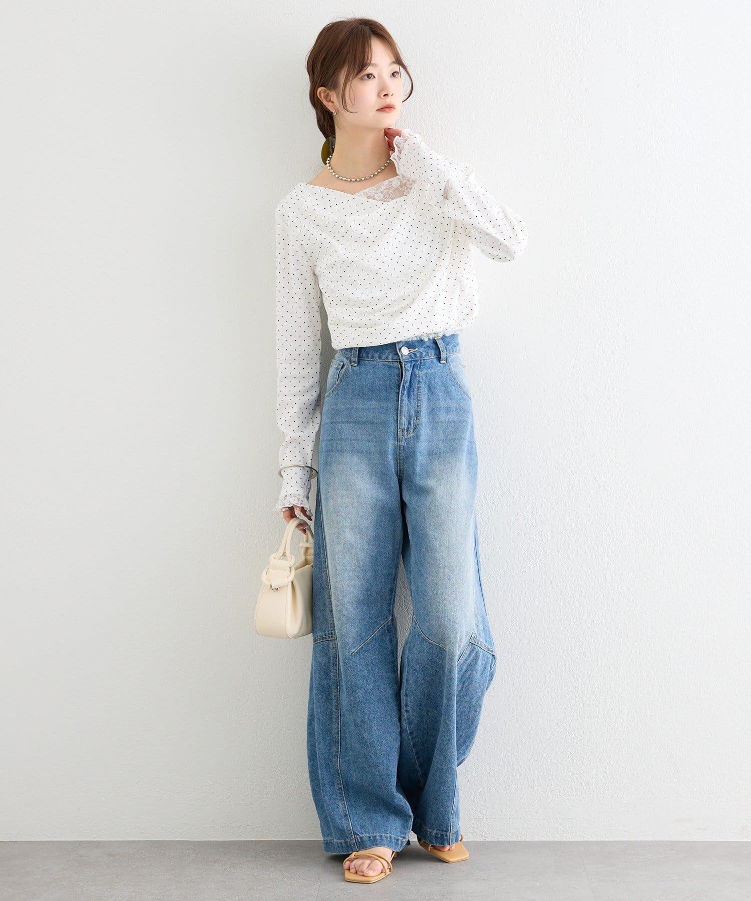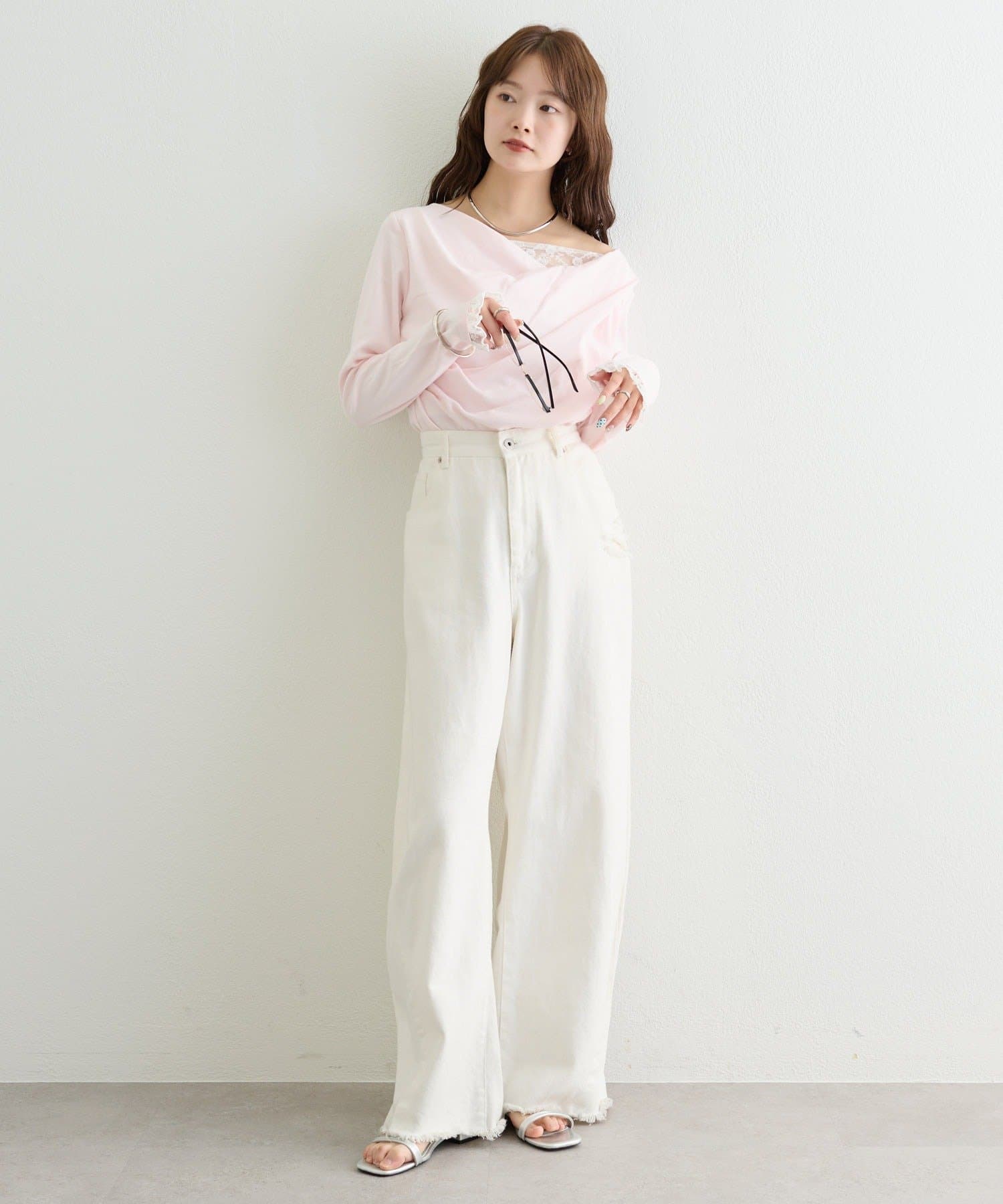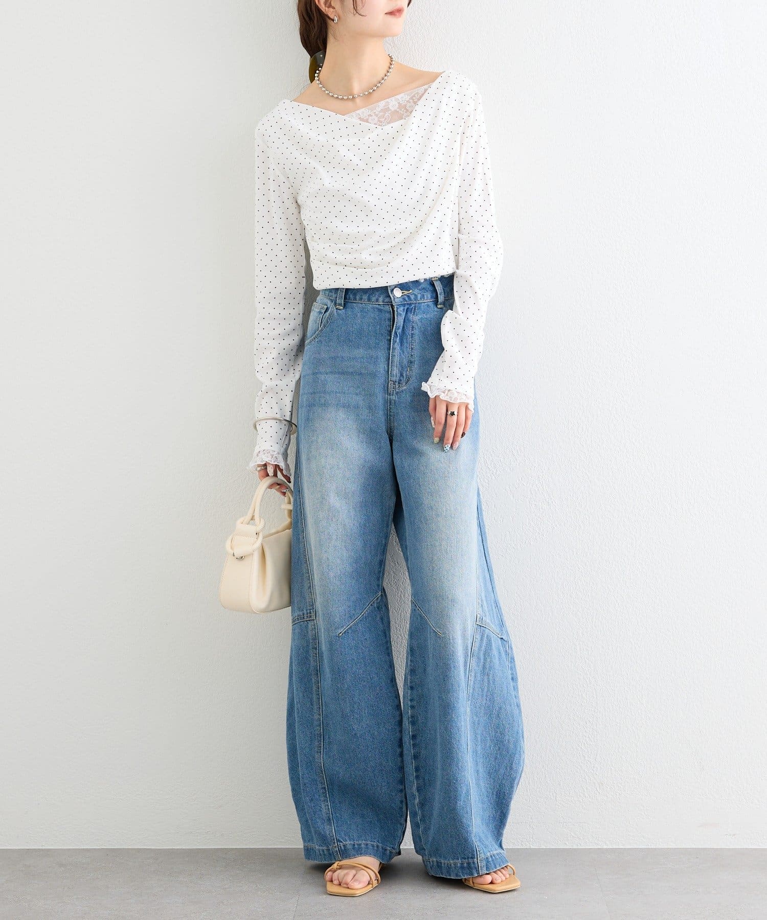 ・デコルテラインにレースがドッキングした、さりげない肌見せが叶うオフショル仕様。