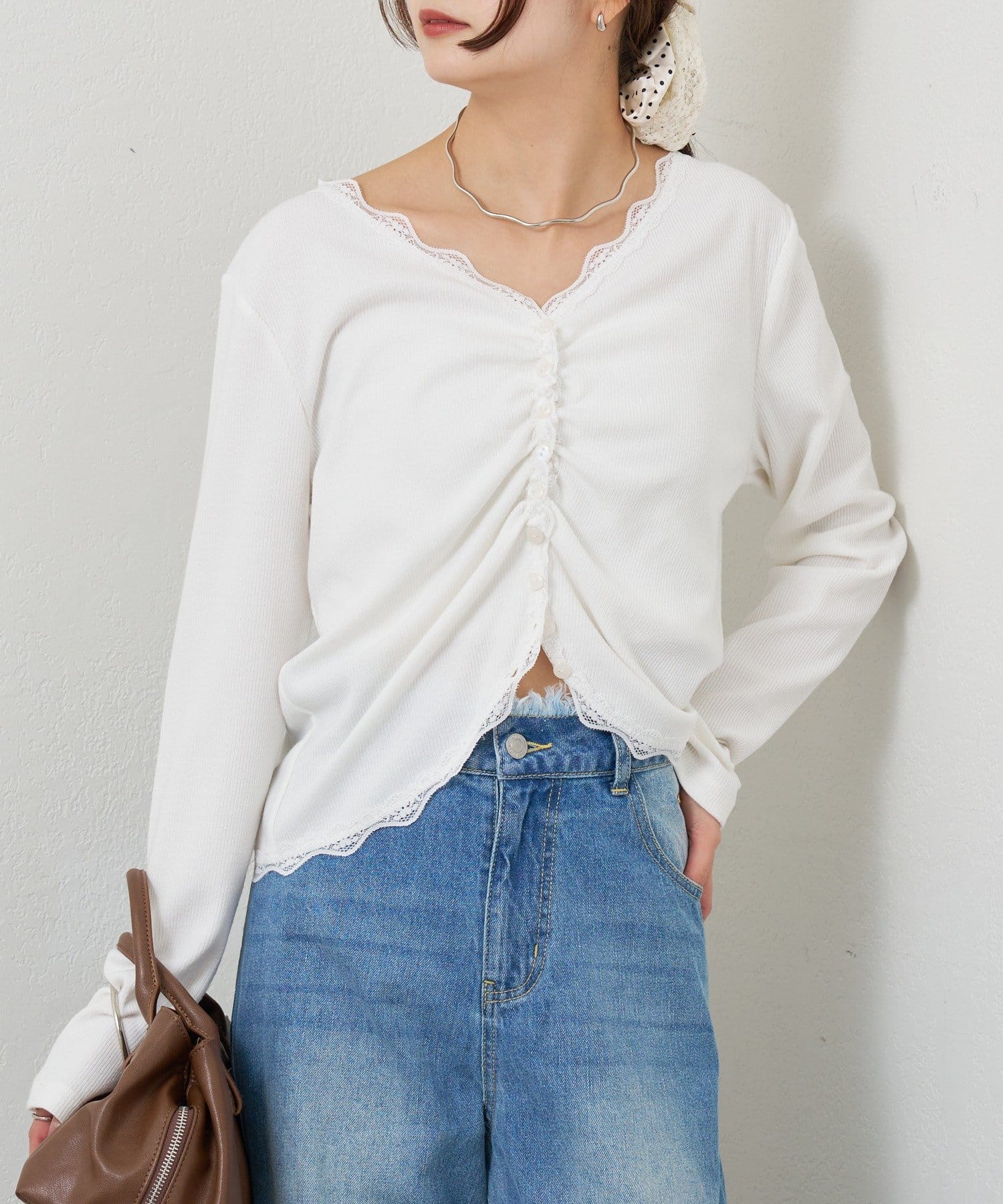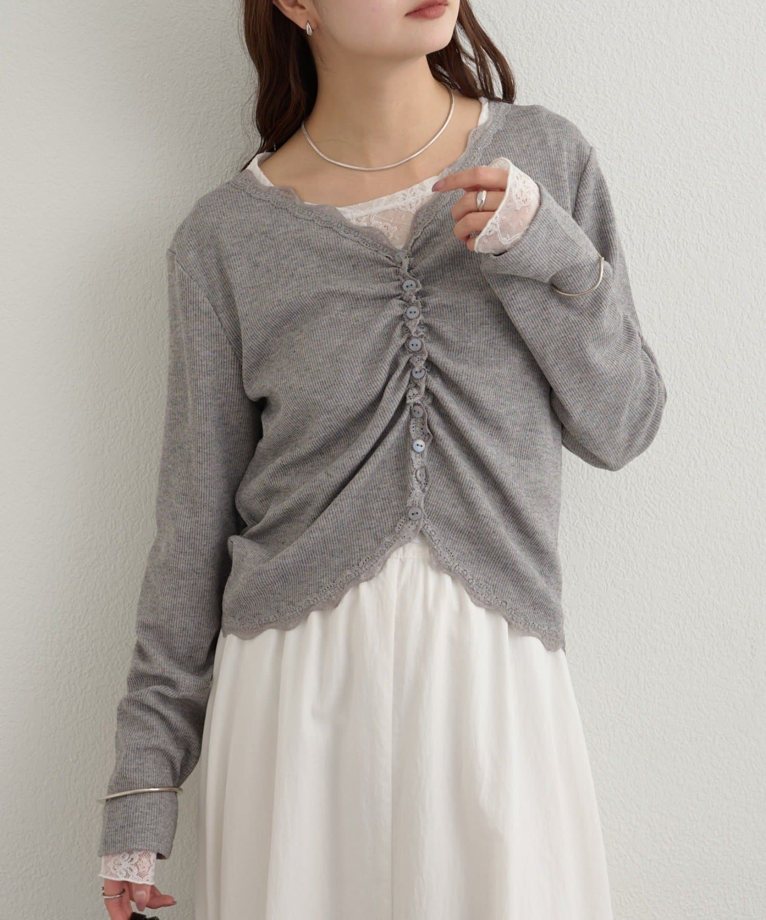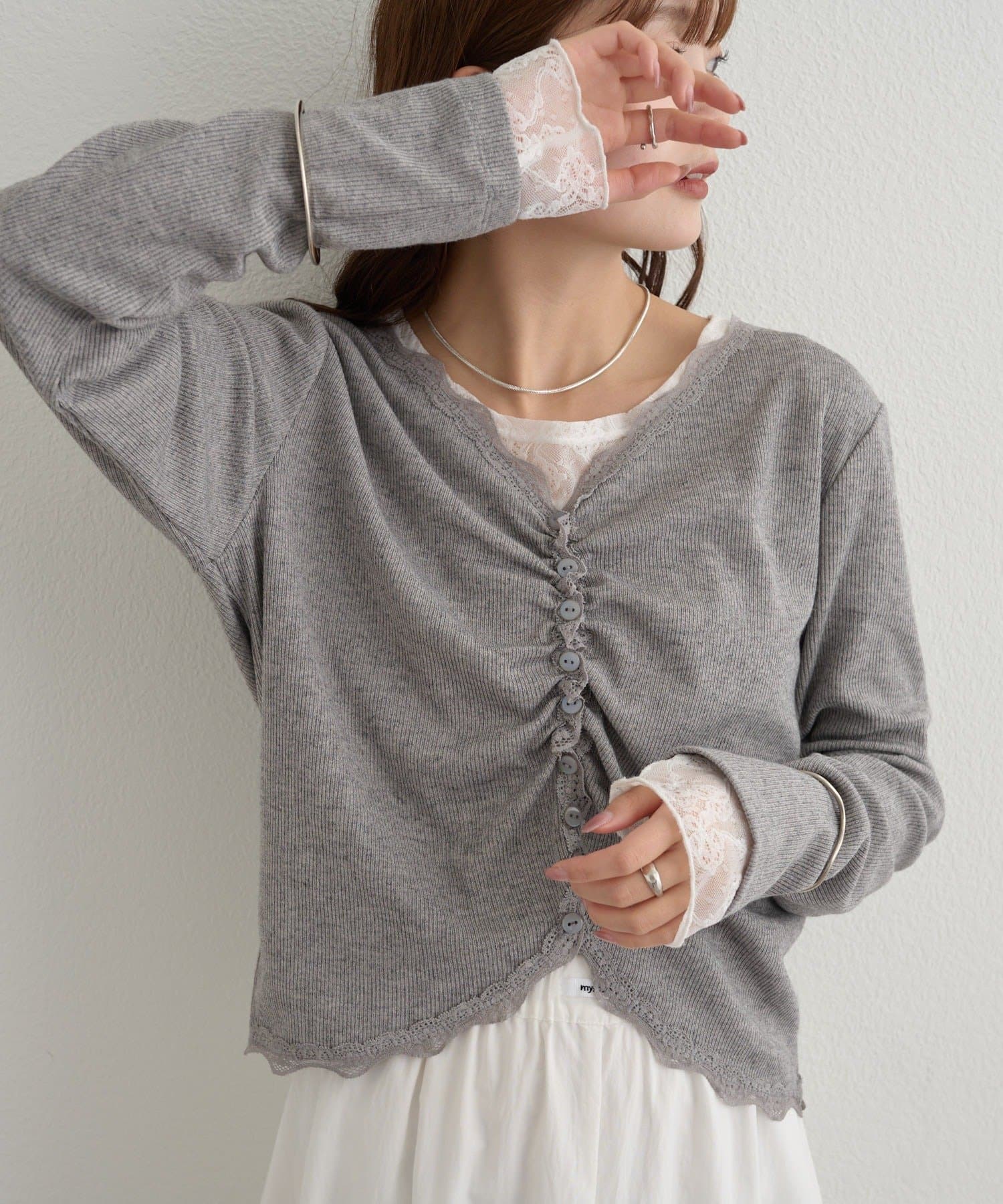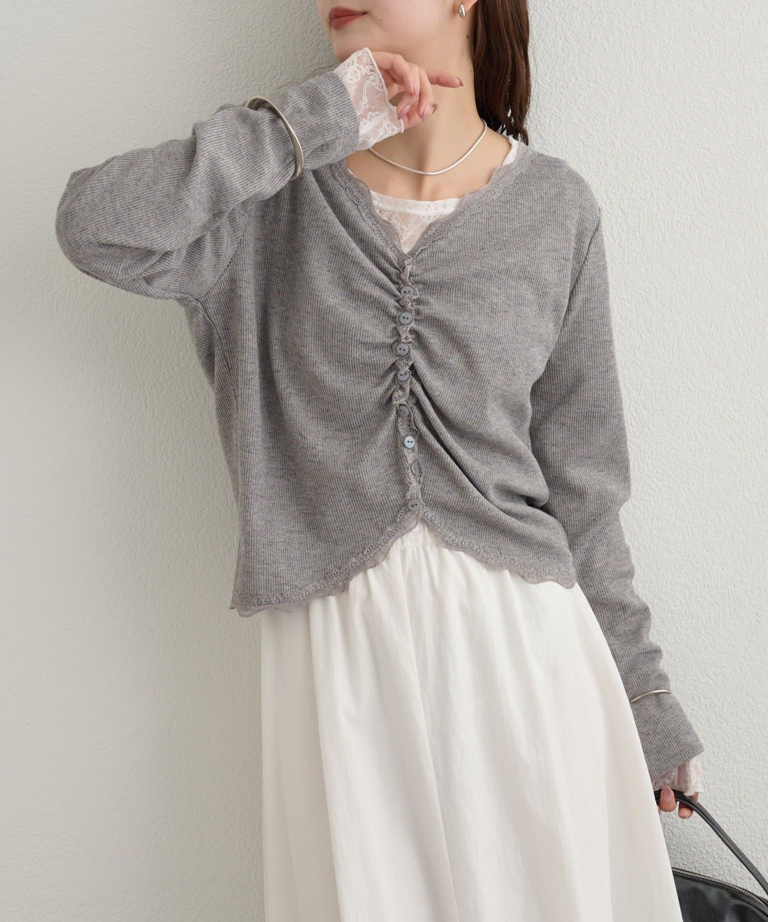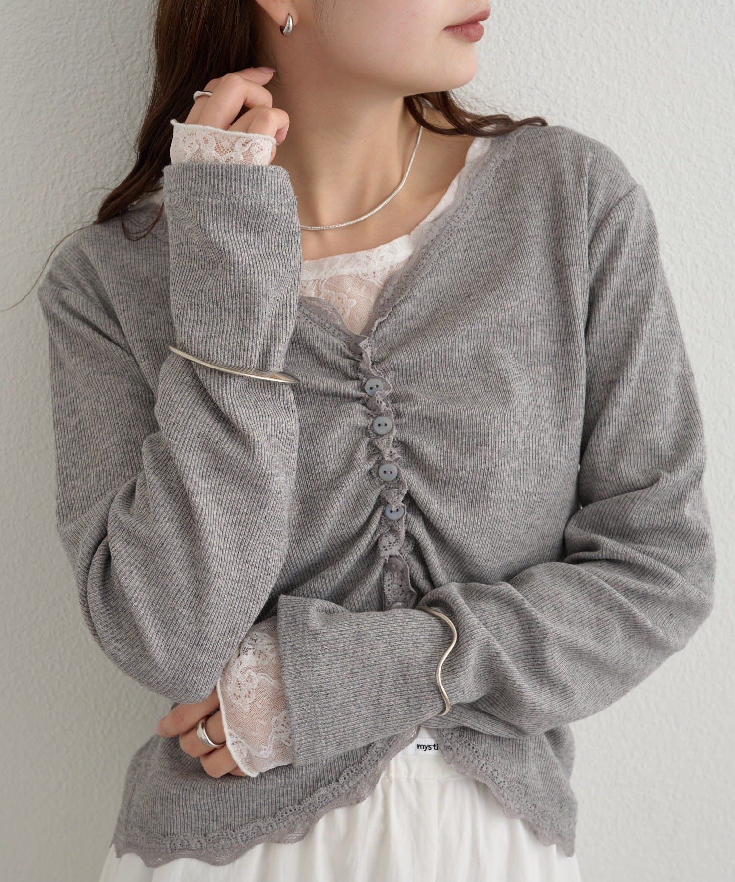 レースとギャザーが女性らしさを引き立てるリブカーディガン