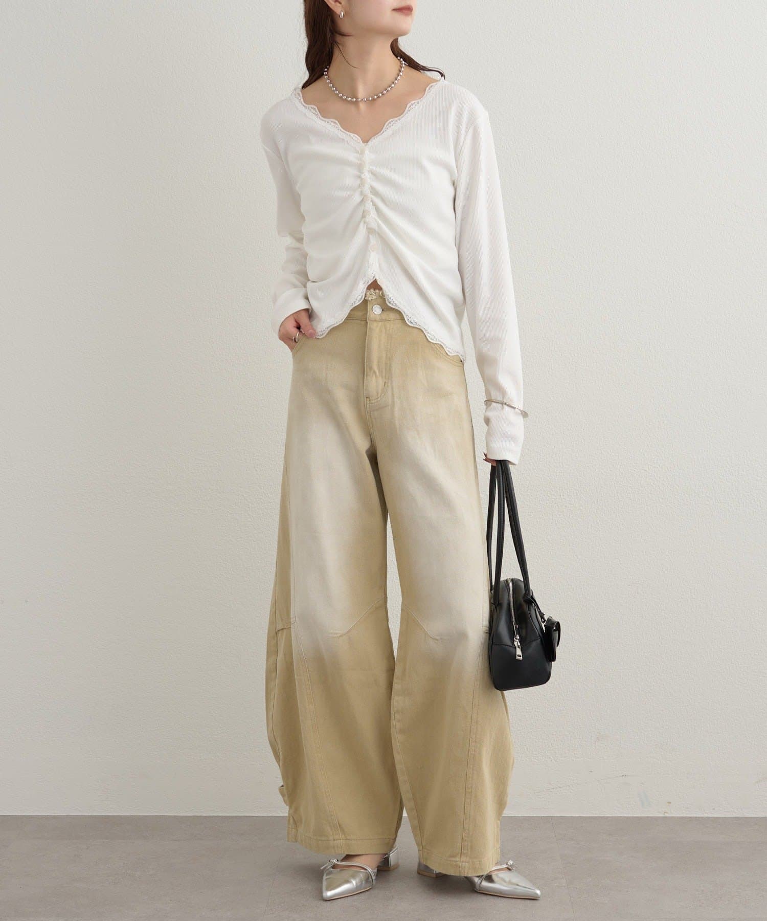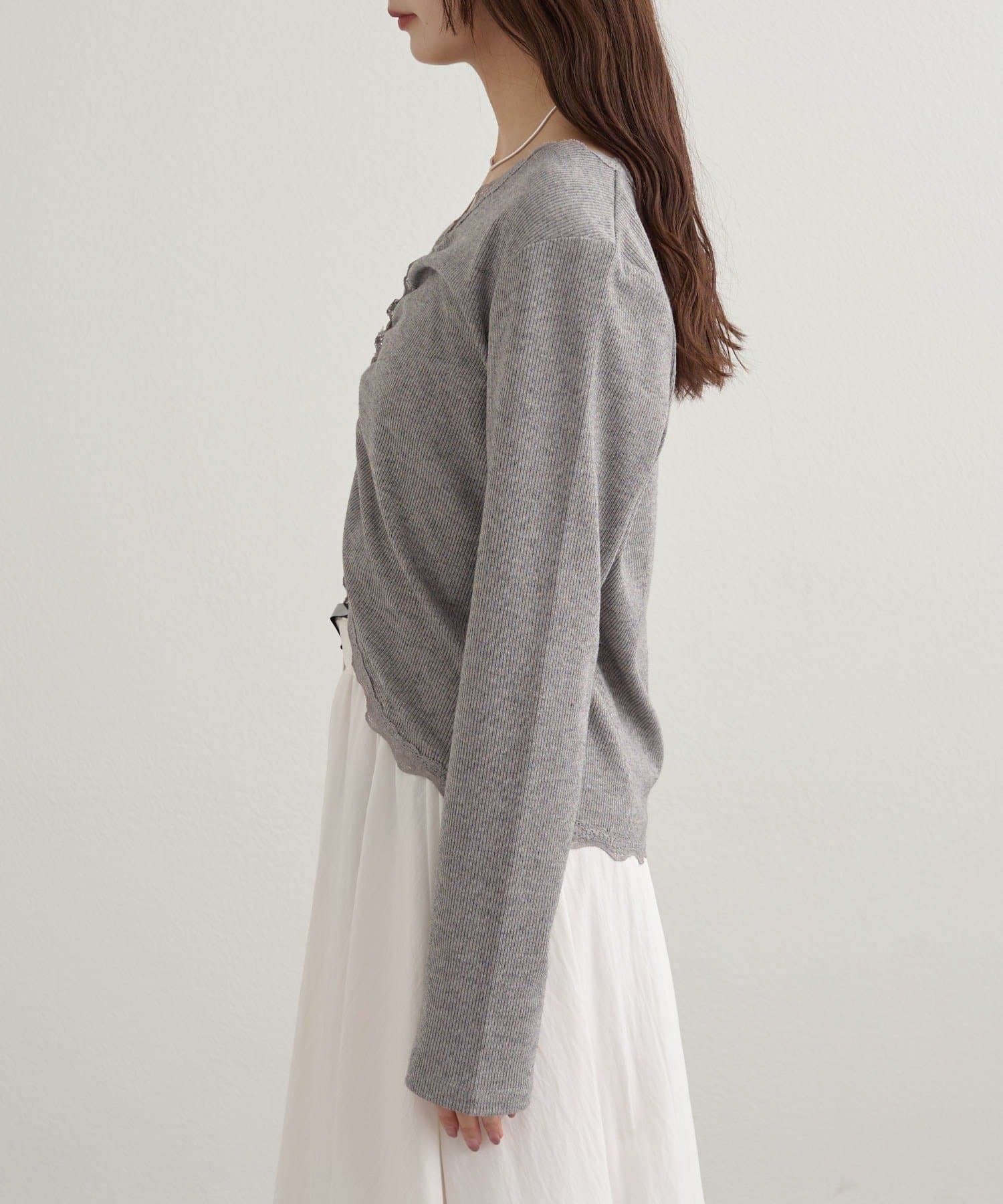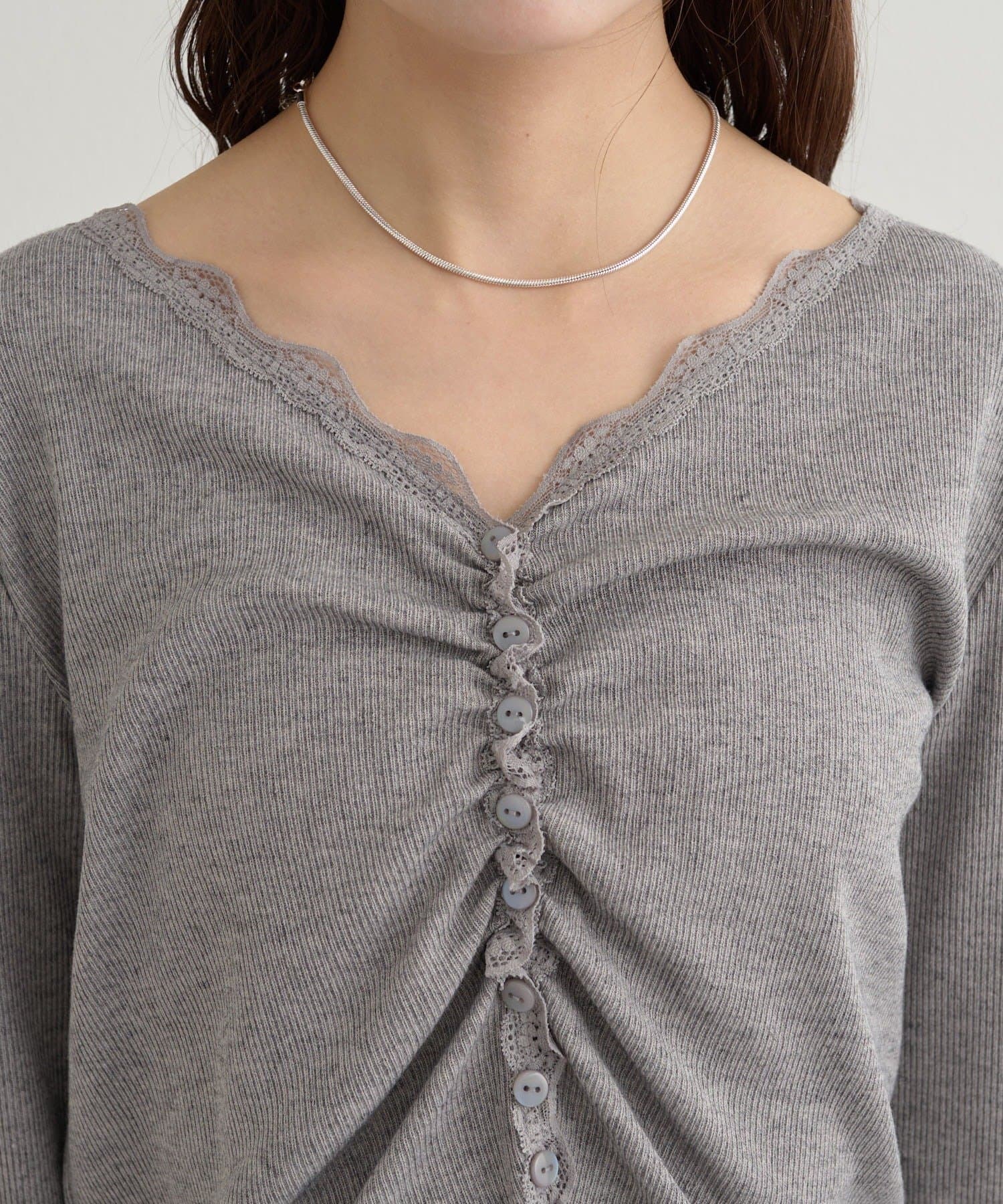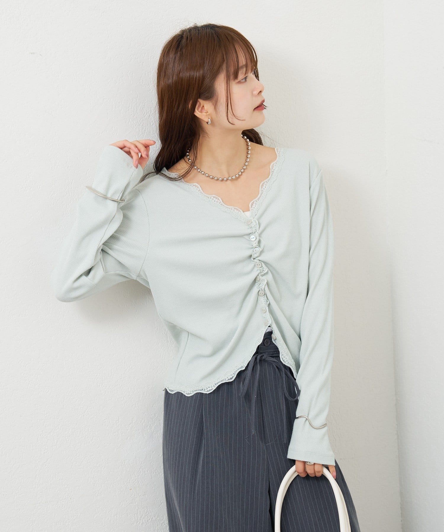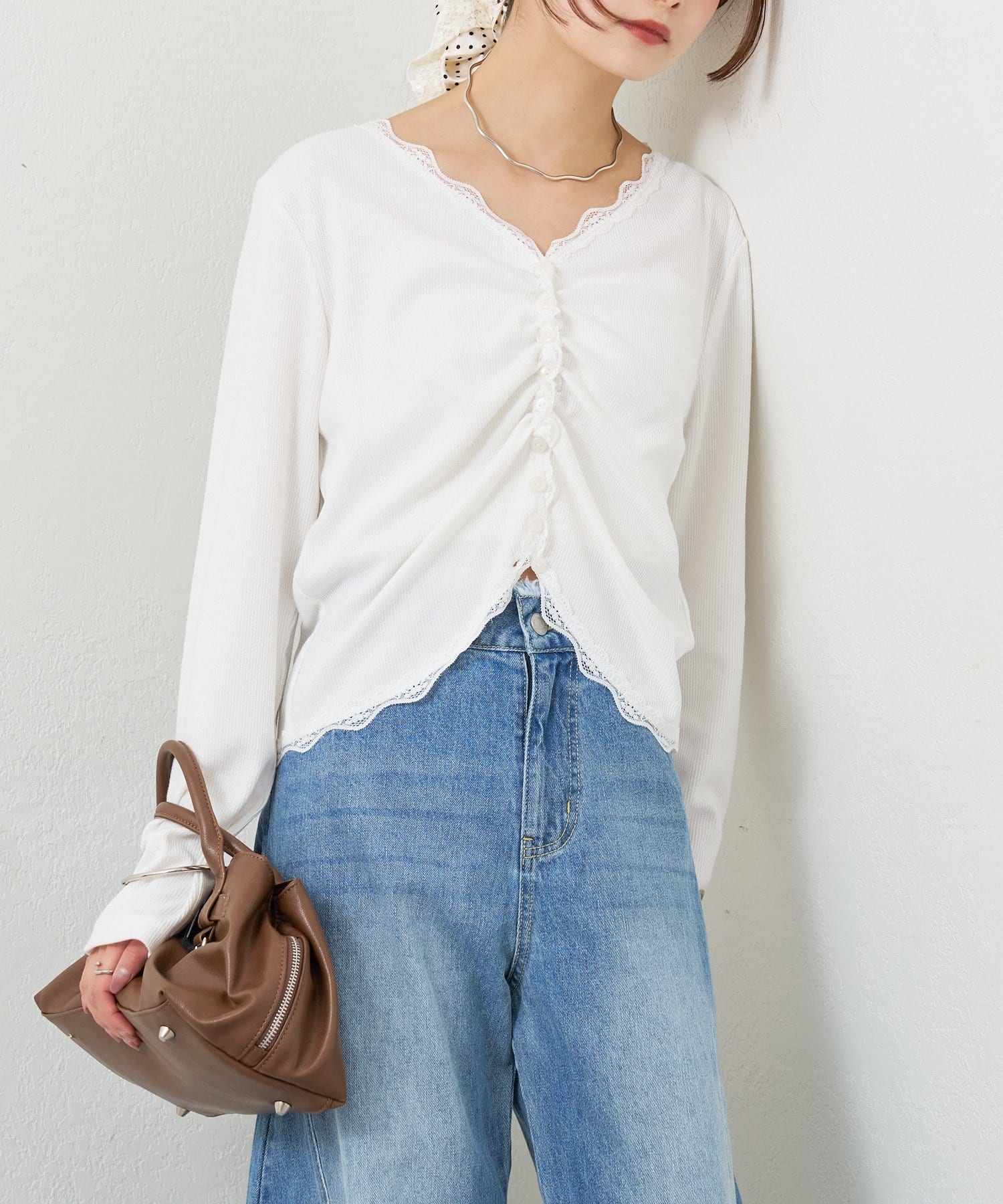 レースとギャザーが女性らしさを引き立てるリブカーディガン